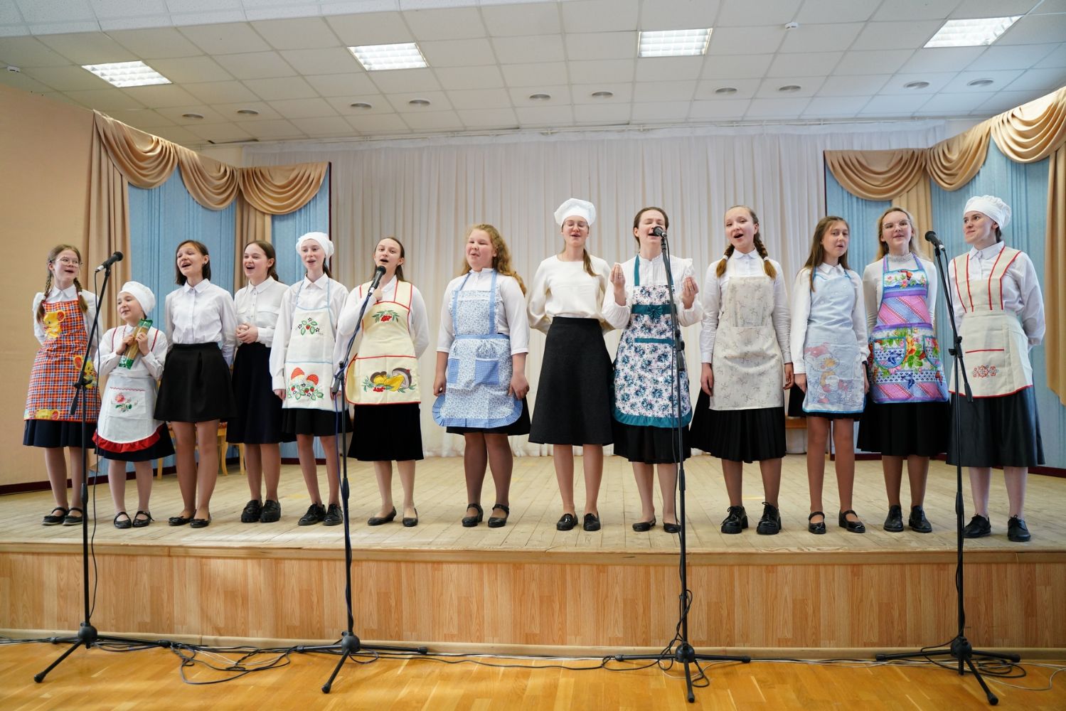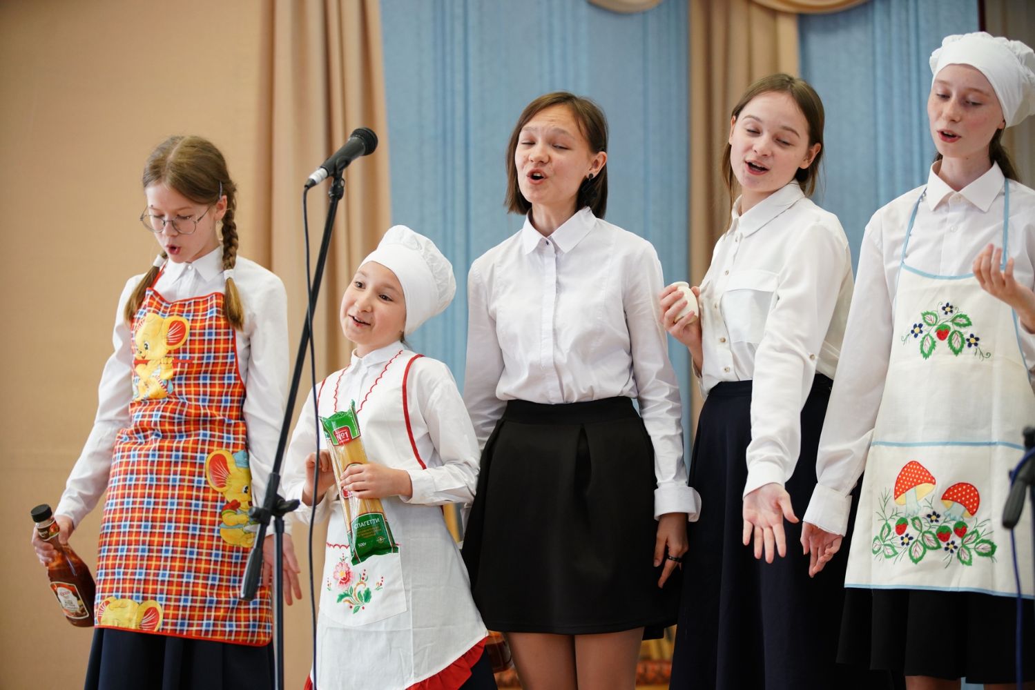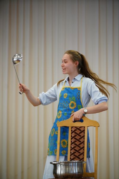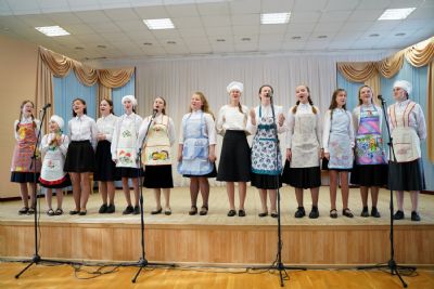В завершение самая веселая номинация – кулинарные песни, исполненные ребятами с задором и добрым юмором. Волжане, нарядившиеся в вышитые сарафаны, спели про русские блины, Татианинцы, изображая пчелок, – про мед… Ребята из команды «Проснись и пой» предложили уже порядком проголодавшимся зрителям песню «Люблю я макароны», вкусно изобразив, как они поглощают их с кетчупом, молоком и приправами…