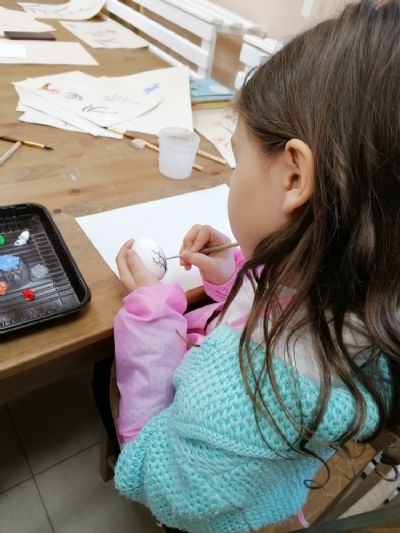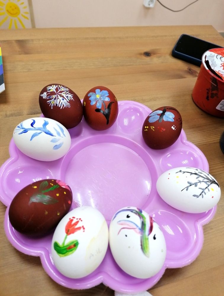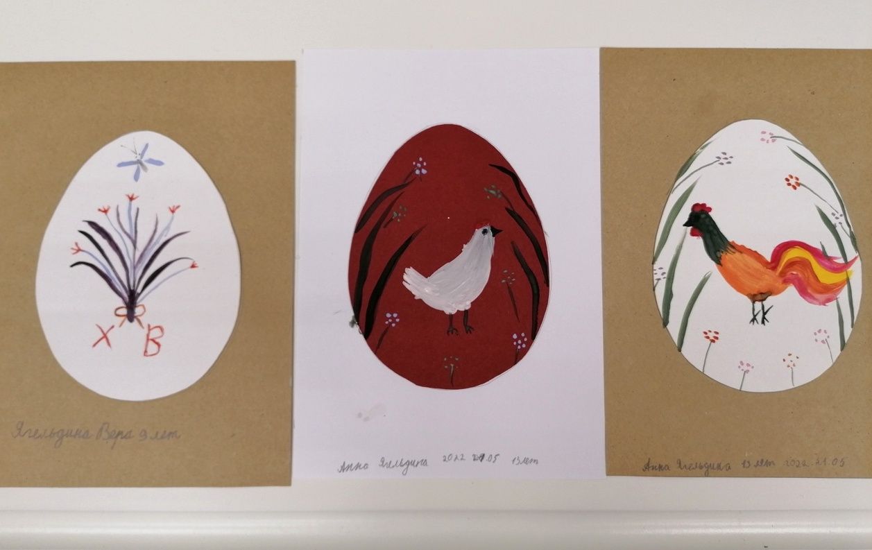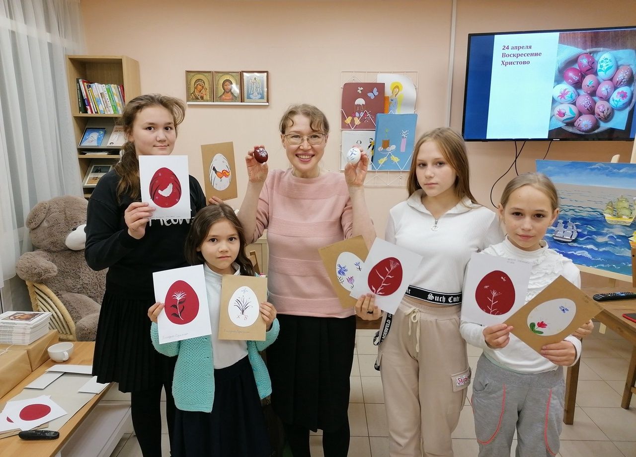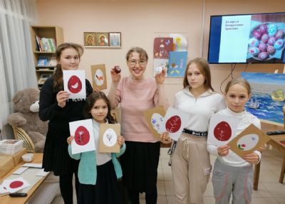 Дети узнали, что в христианстве пасхальное яйцо — символ Гроба Господня, в котором была скрыта вечная жизнь. Поговорили и о способах крашения пасхальных яиц, о символике цвета и способах украшения. Мария Юрьевна продемонстрировала авторские росписи пасхальных яиц.