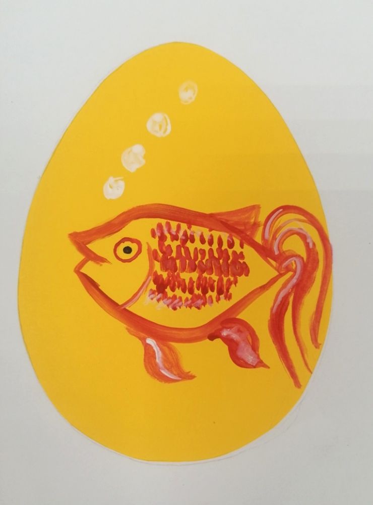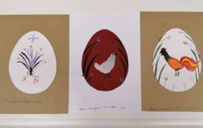 Далее ребята под руководством Марии Юрьевны расписывали трафареты, тренируясь расписывать яйца. Рисовали акриловыми красками. Далее рисунок переносили на яйцо.