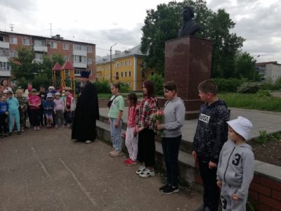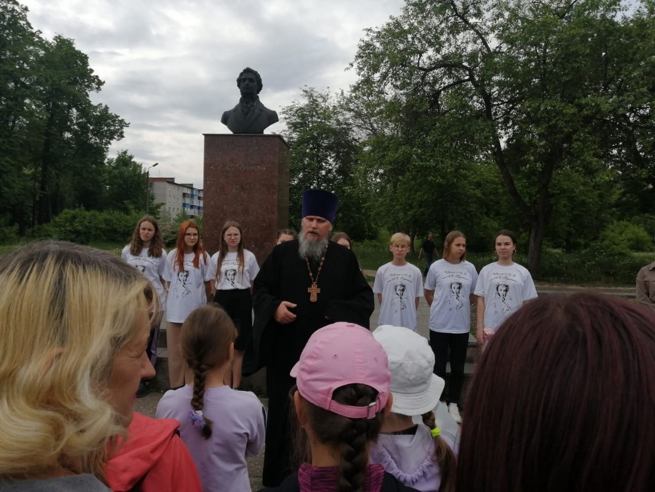 В завершение отец Александр и школьники с педагогами отправились на центральную площадь Волжска, где возложили цветы к бюсту А.С. Пушкина.