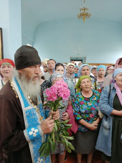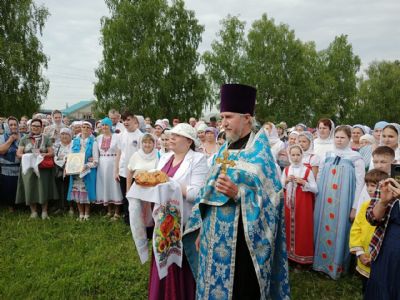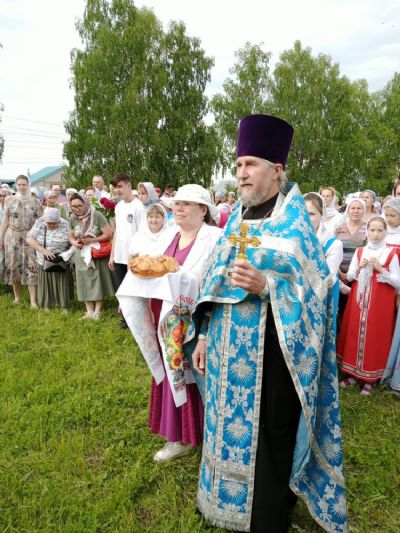 В Морках святыню хлебом-солью встретило множество верующих во главе с настоятелем Богоявленского храма п. Морки протоиереем Леонтием Очетовым.