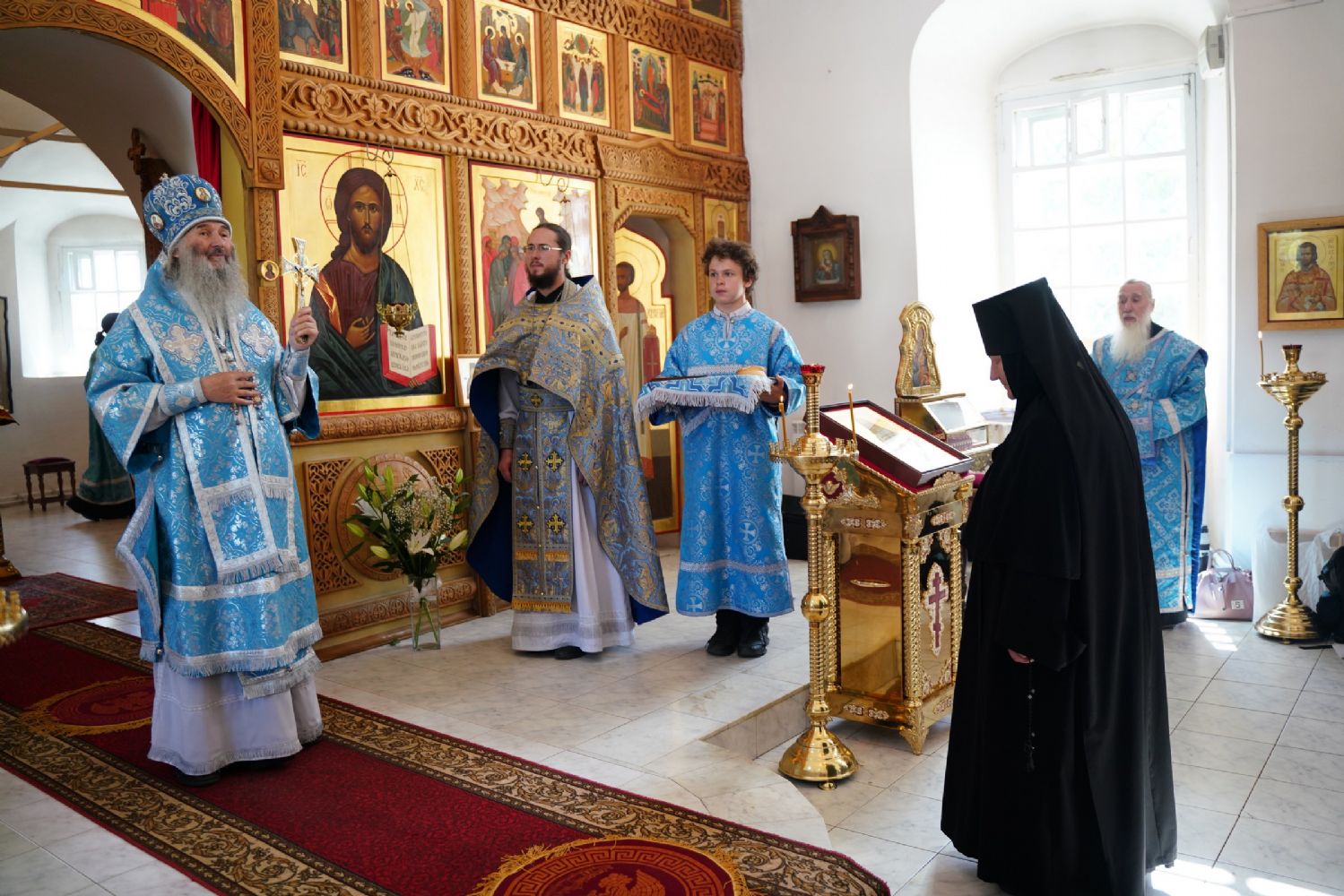 После богослужения митрополит Иоанн поздравил нстоятельницу Мироносицкого монастыря игумению Варнаву (Колчину) с днем тезоименитства.