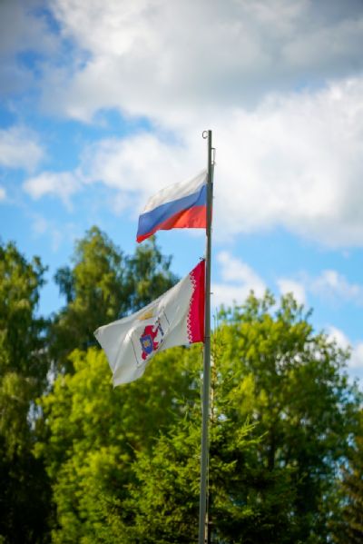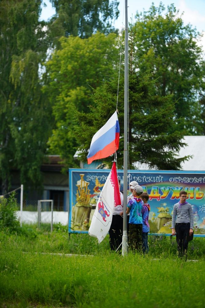 Далее состоялась торжественная линейка с подъемом лагерного флага. Так как 4 июля – день памяти преподобного Максима Грека, флаг было доверено поднять четверым именинникам-Максимам. Ребята представили свои отряды, названные в честь кораблей Российского флота, а их приветствовал сам «император Петр I».