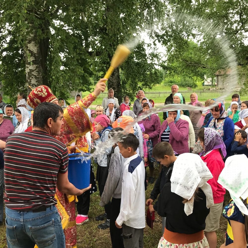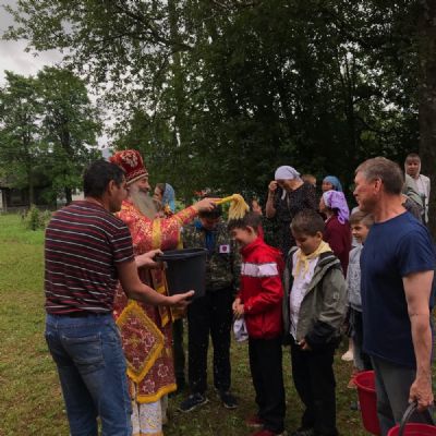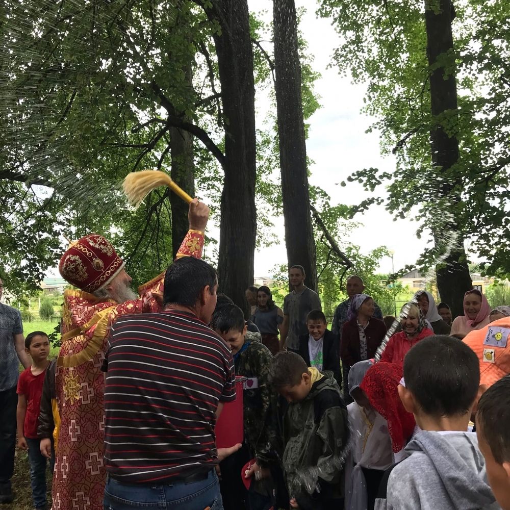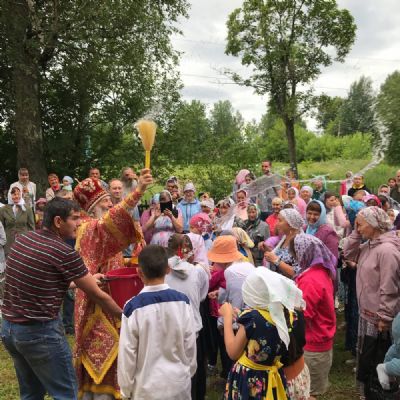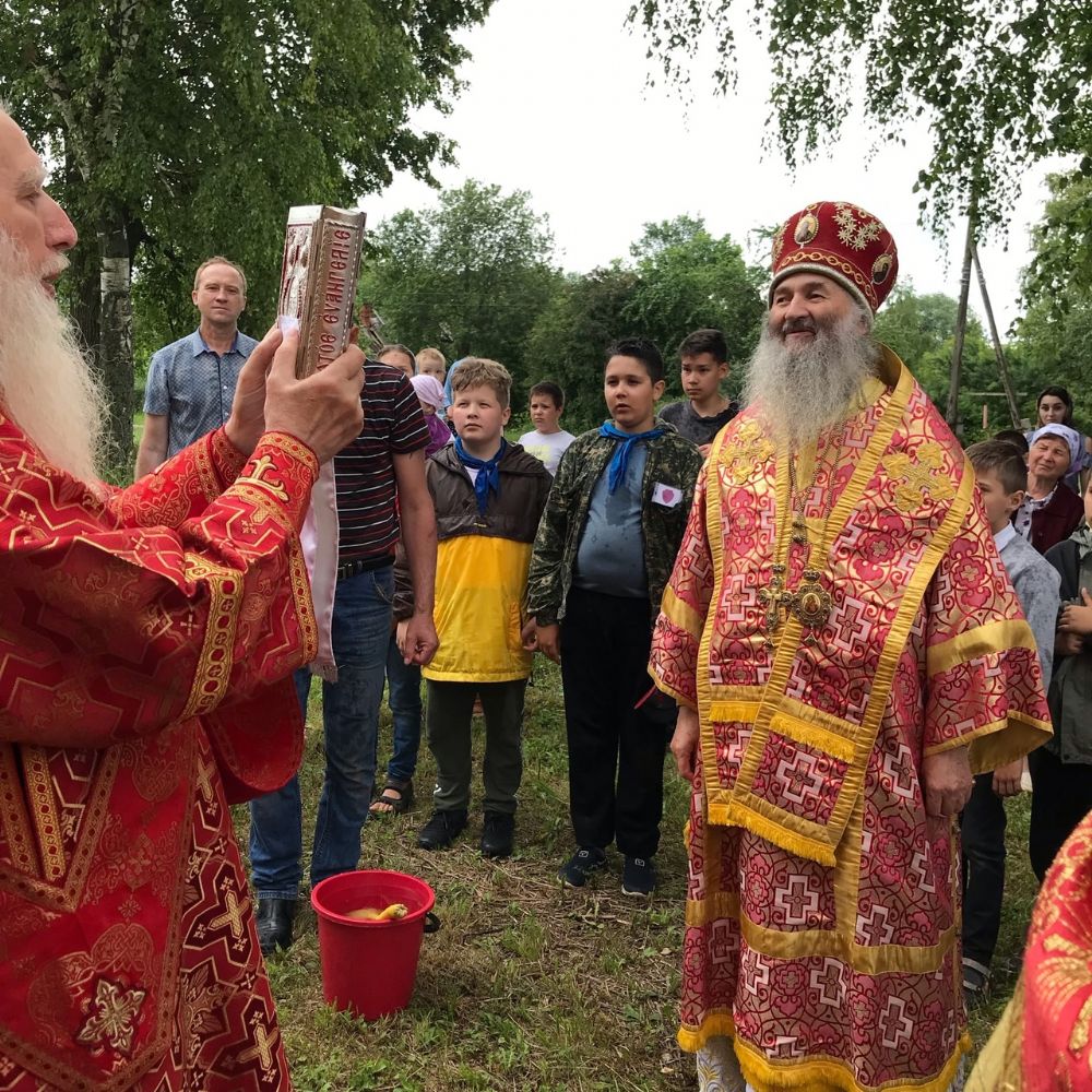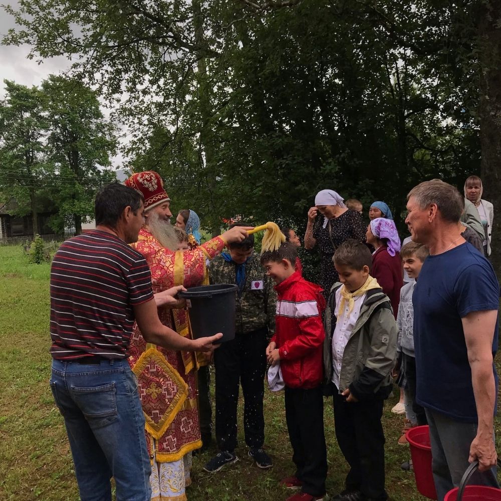 По традиции престольных праздников после Литургии прошел крестный ход вокруг храма, владыка щедро окропил всех святой водой.