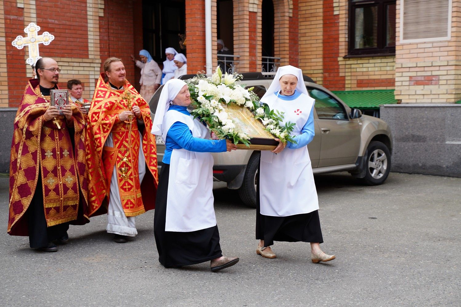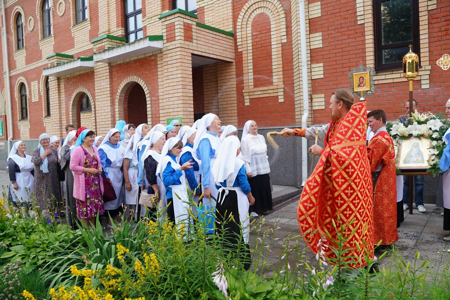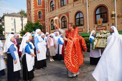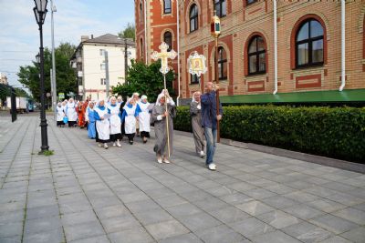 Далее с иконами и хоругвями сестры со священством совершили праздничный крестный ход вокруг Православного центра, а по возвращении в храм была отслужена заупокойная лития с поминовением основательницы епархиального сестричества милосердия схимонахини Митрофании (в миру – Ольги Говинчук), первого духовника сестричества иерея Андрея Тимакова и пятнадцати отошедших за эти годы ко Господу сестер.