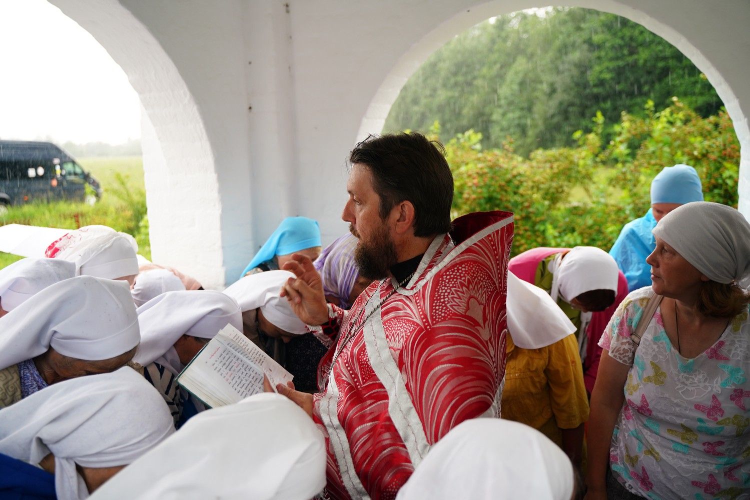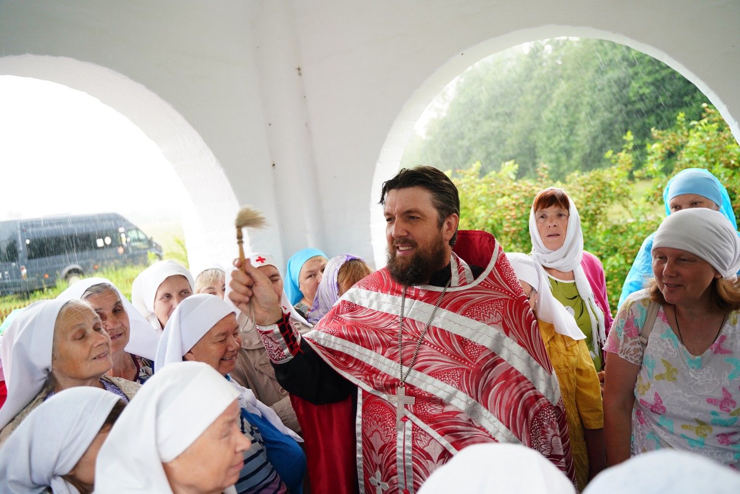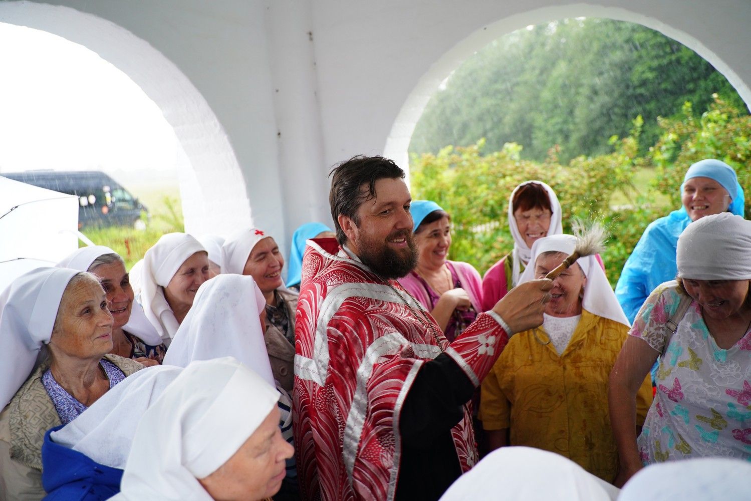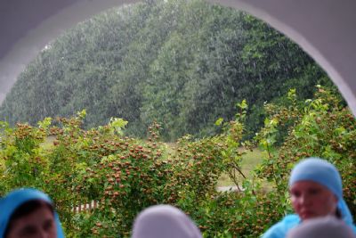 После теплого общения за праздничным столом сестры совершили паломническую поездку на источник Архистратига Божия Михаила близ деревни Пижма Медведевского района. Около часовни у источника их встретил благочинный Йошкар-Олинского церковного округа протоиерей Андрей Норкин – он совершил водосвятный молебен и покропил водой собравшихся. Восполнил кропление Сам Господь, ниспослав обильный дождь, промочивший всех до нитки. Но сестры не утратили оптимизма – и после дождя отправились еще окунаться в источник. Возвращение домой также не обошлось без приключений – автобус увяз в размокшей от дождя глине, его вытянул пришедший на подмогу трактор.