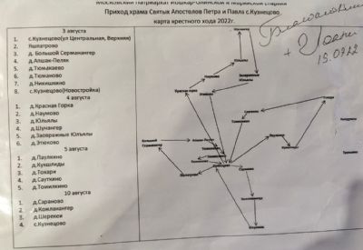 Маршрут крестного хода на карте по форме напоминает крест – каждый день верующие со чтимыми образами Казанской Божией Матери, Николая Чудотворца, апостолов Петра и Павла, блаженной Матроны Московской, пророка Илии и других святых выходили с утра из Петропавловского храма с. Кузнецово и, обойдя ряд населенных пунктов, к вечеру возвращались туда же. Таким образом, за четыре дня были охвачены все деревни Кузнецовского сельского поселения.