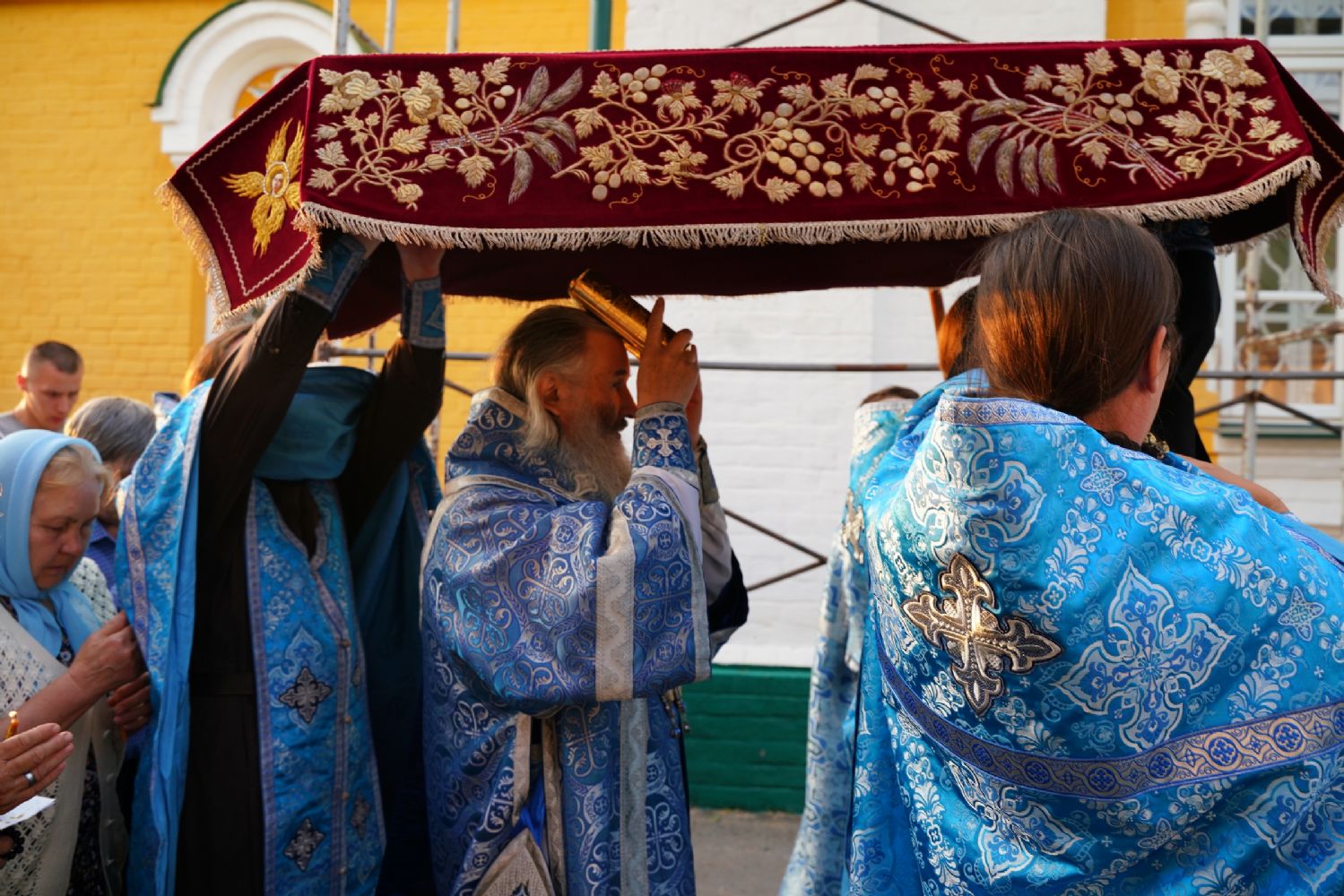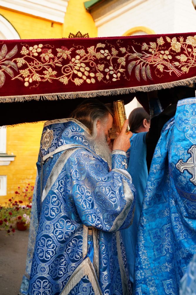После великого славословия при пении «Трисвятого» Плащаница с изображением Пресвятой Богородицы была обнесена крестным ходом вокруг собора и вновь положена на середину храма для поклонения верующим, которые в завершение были помазаны освященным елеем.