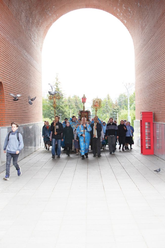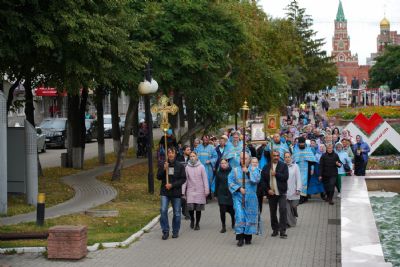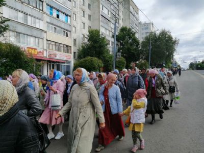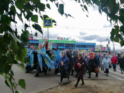 Обойдя вокруг храма, верующие в сопровождении машин ДПС двинулись по улицам Йошкар-Олы к центру города – в Тихвинский храм, где их радостно встретили прихожане и священник Александр Козлов, который совершил молебен Пресвятой Богородице.
