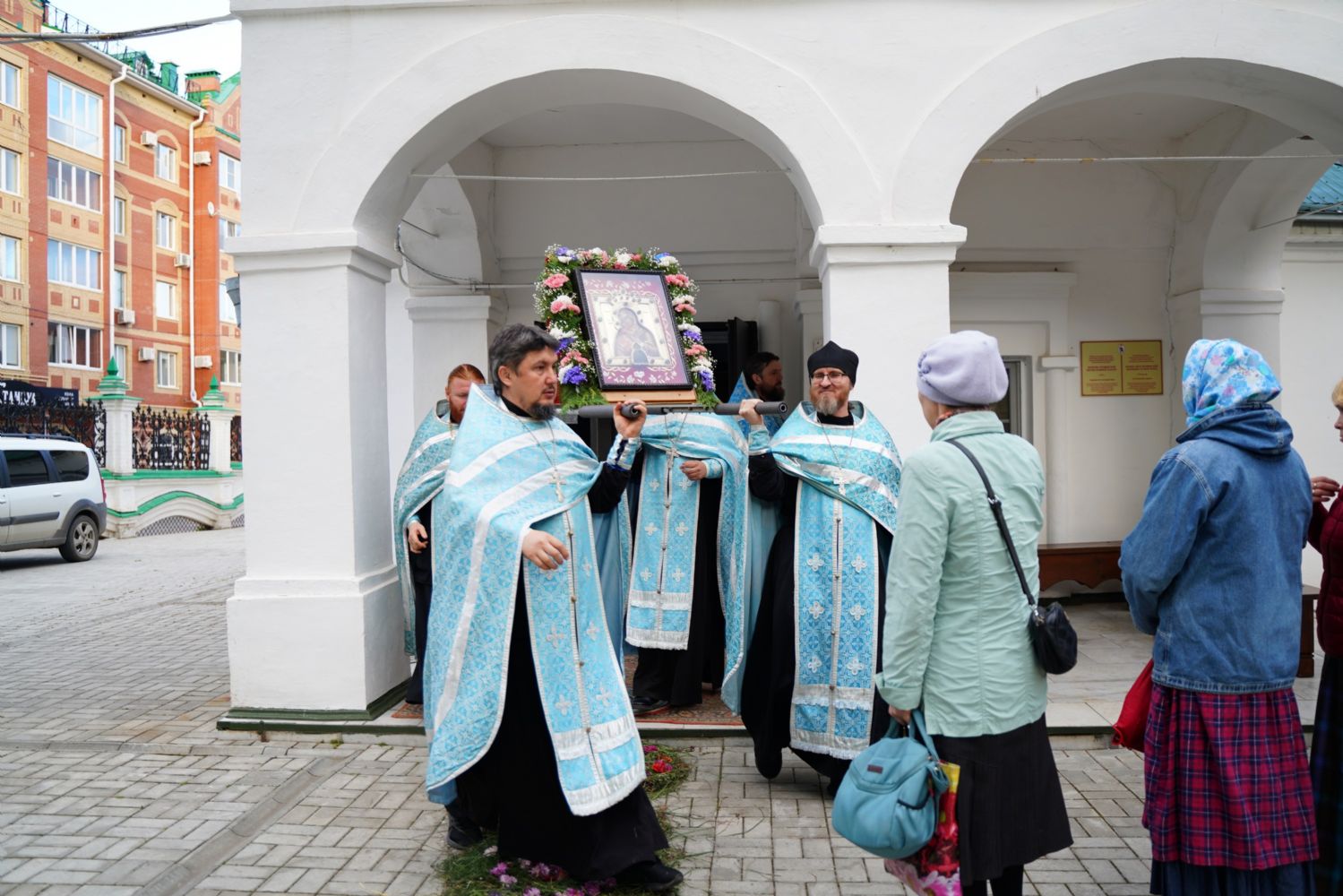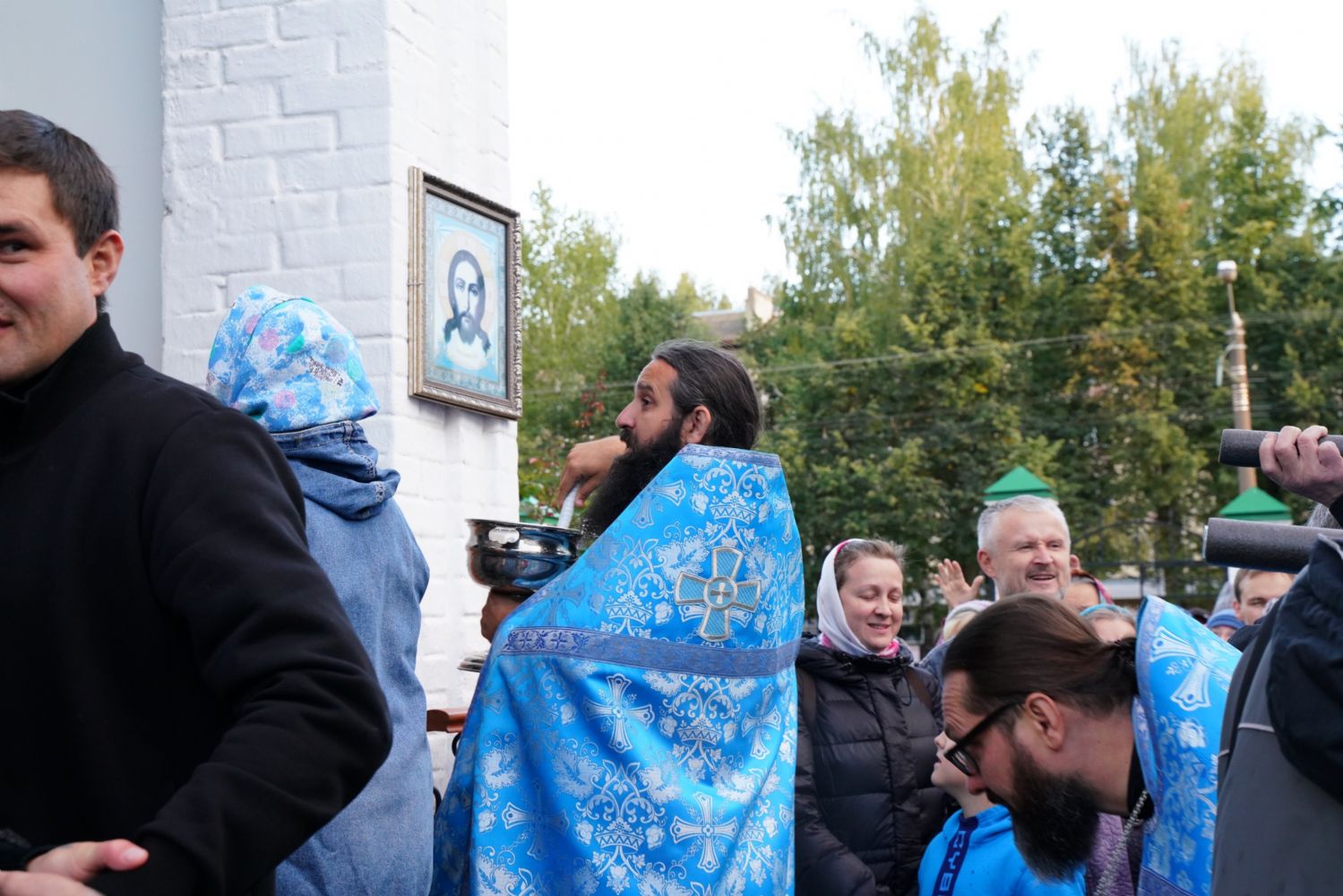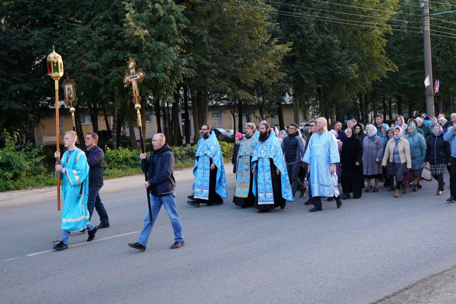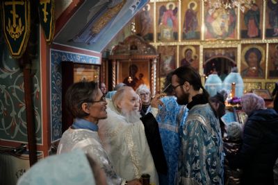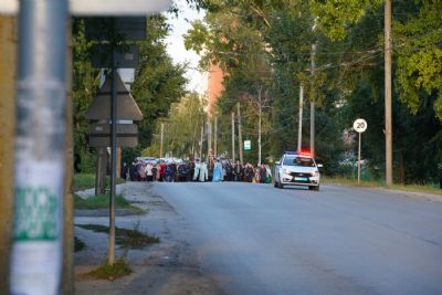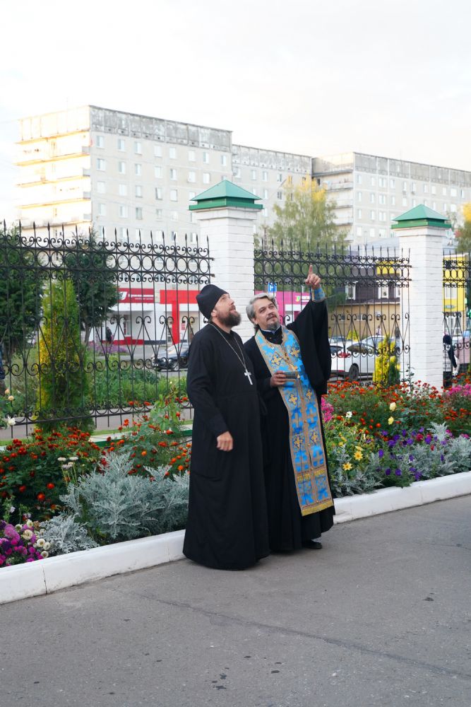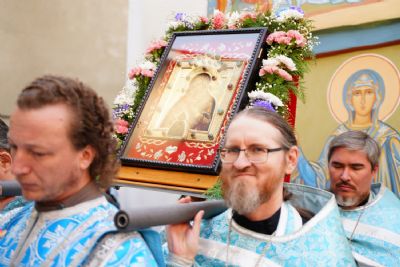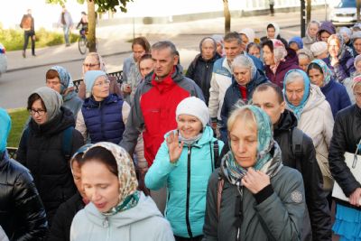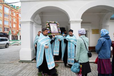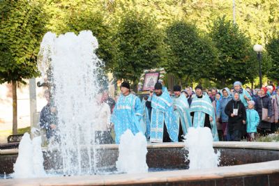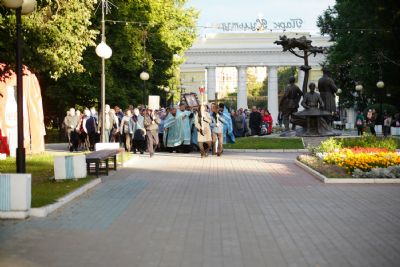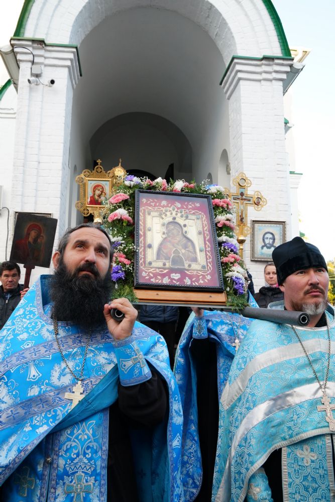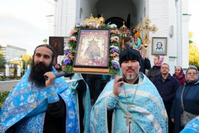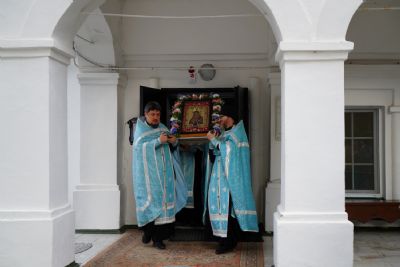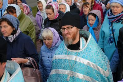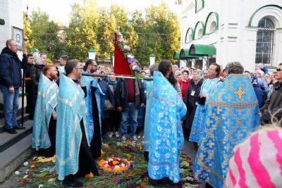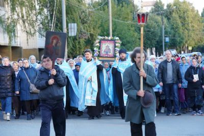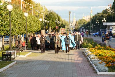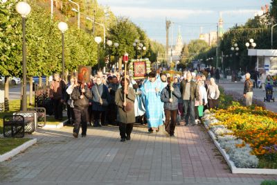 По завершении богослужения прошел крестный ход вокруг храма, а затем крестоходцы с архангельским песнопением "Богородице, Дево, радуйся..." двинулись по улицам города в 9-й микрорайон, к храму Рождества Христова. Навстречу также крестным ходом вышли прихожане и духовенство Христорождественского храма во главе с настоятелем - иереем Александром Лоскутовым. Два людских потока слились и направились к вратам храма, где был совершен молебен Пресвятой Богородице, верующие благоговейно прошли под Мироносицкой иконой, а священники окропили всех святой водой.