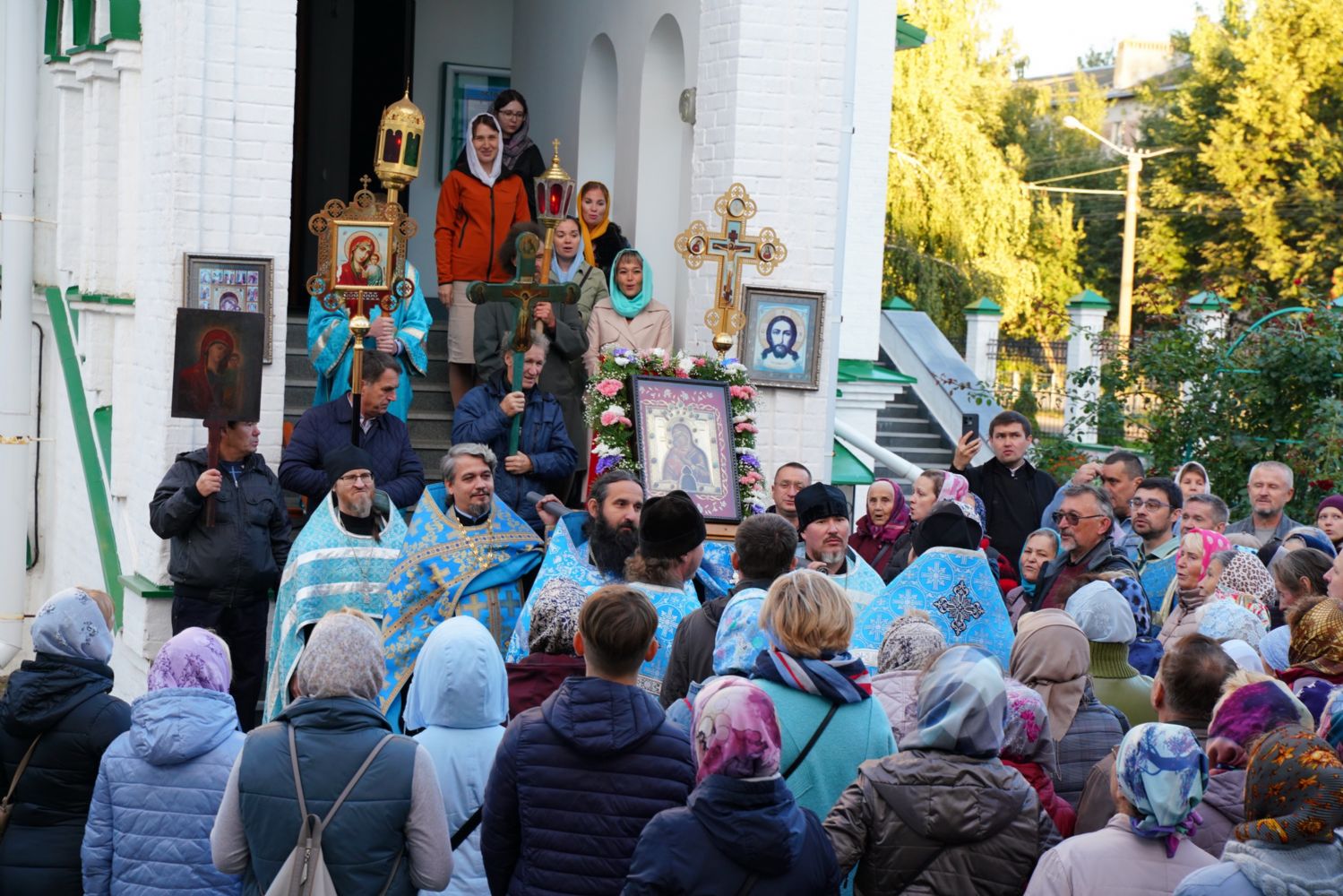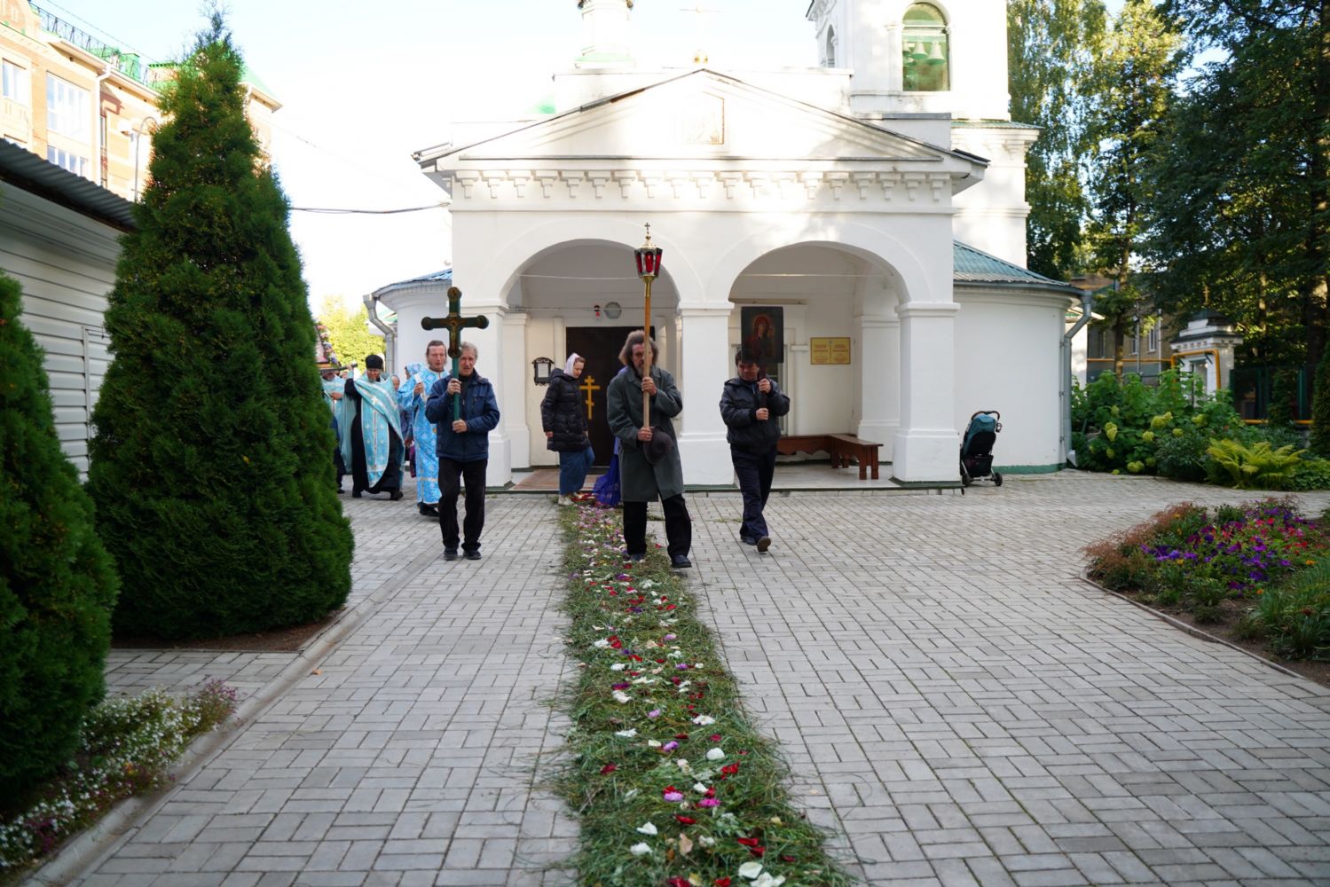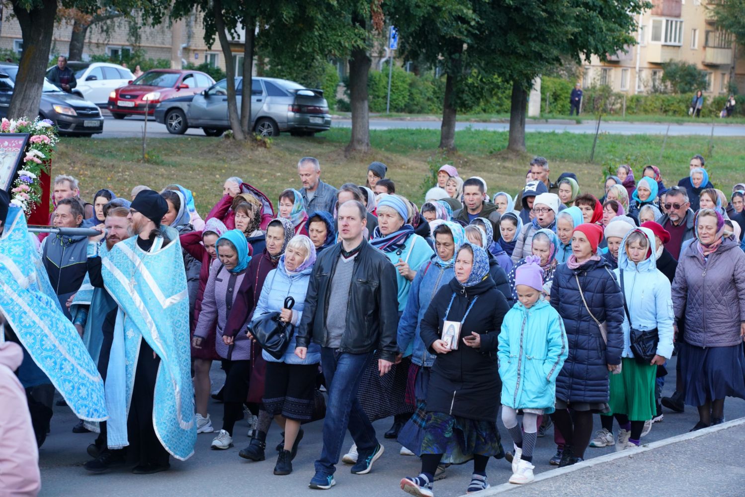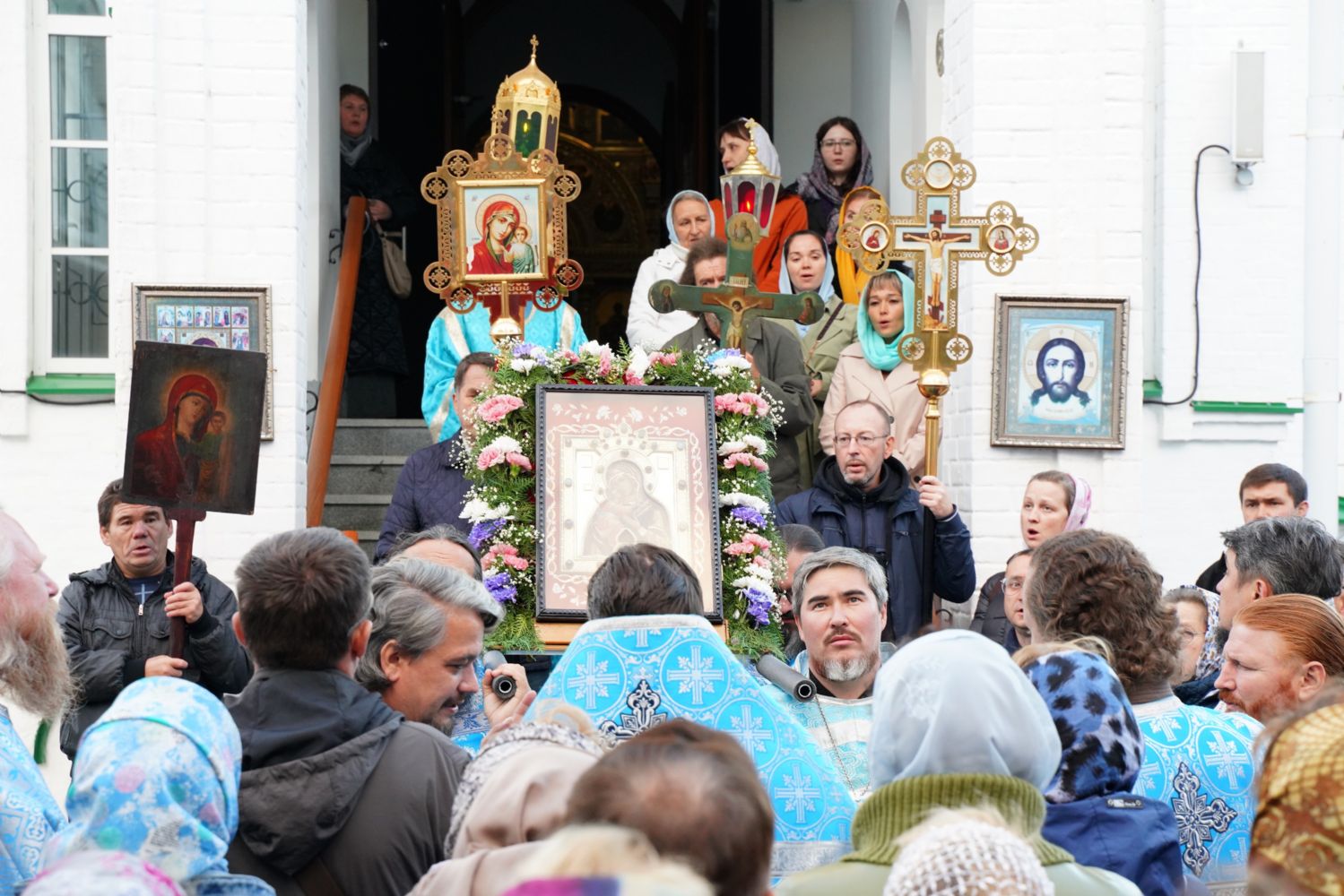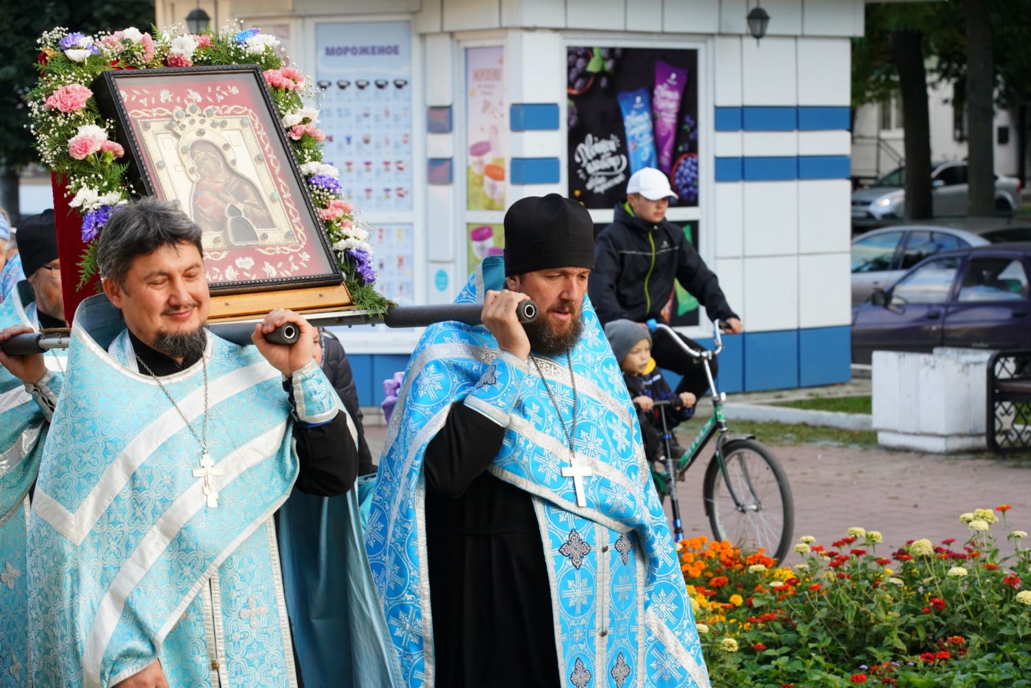 По завершении богослужения прошел крестный ход вокруг храма, а затем крестоходцы с архангельским песнопением "Богородице, Дево, радуйся..." двинулись по улицам города в 9-й микрорайон, к храму Рождества Христова. Навстречу также крестным ходом вышли прихожане и духовенство Христорождественского храма во главе с настоятелем - иереем Александром Лоскутовым. Два людских потока слились и направились к вратам храма, где был совершен молебен Пресвятой Богородице, верующие благоговейно прошли под Мироносицкой иконой, а священники окропили всех святой водой.