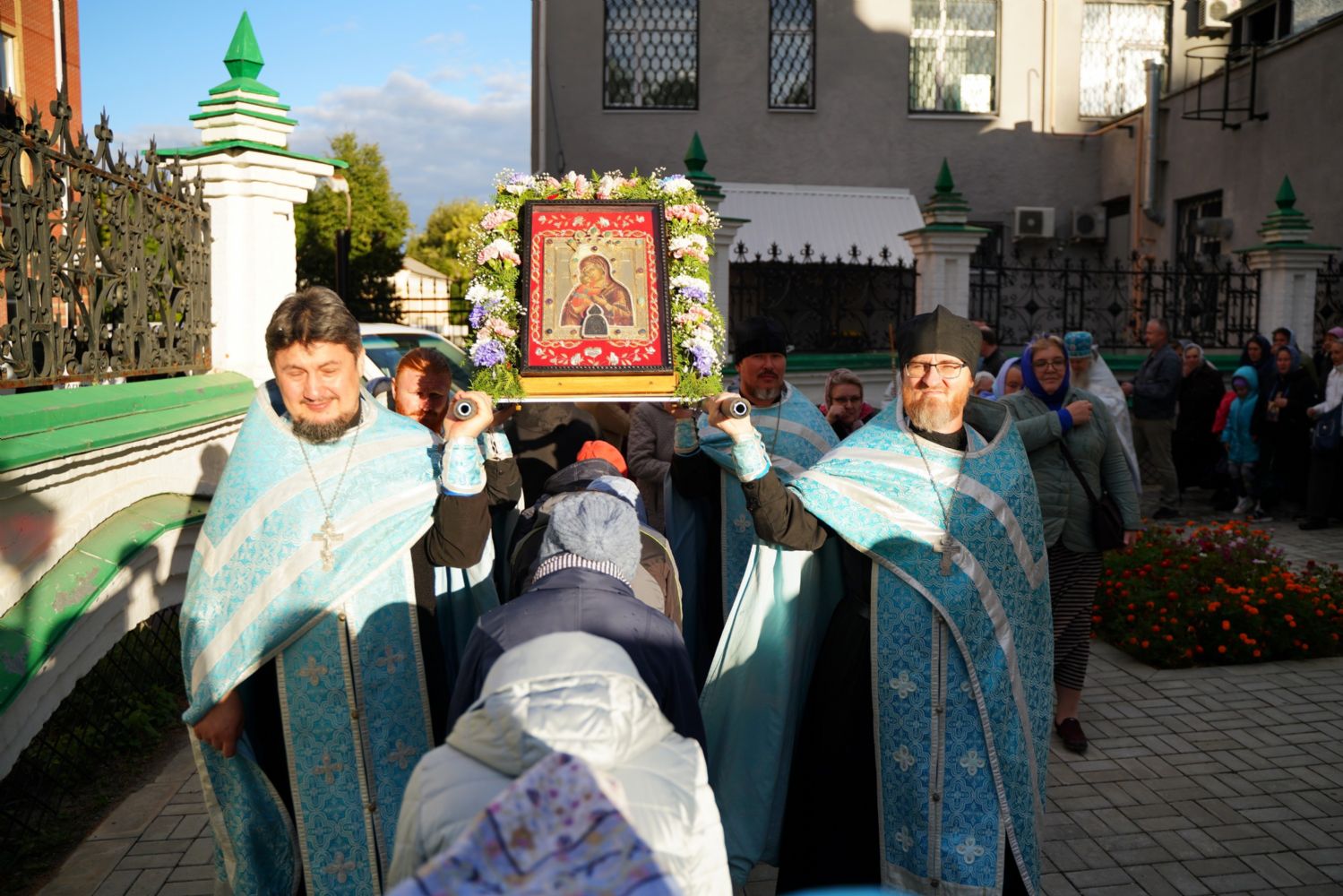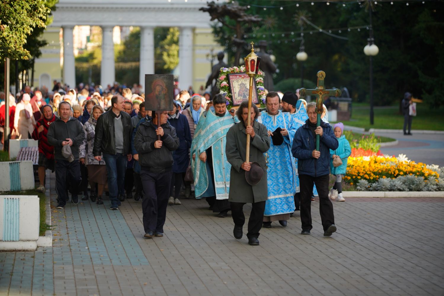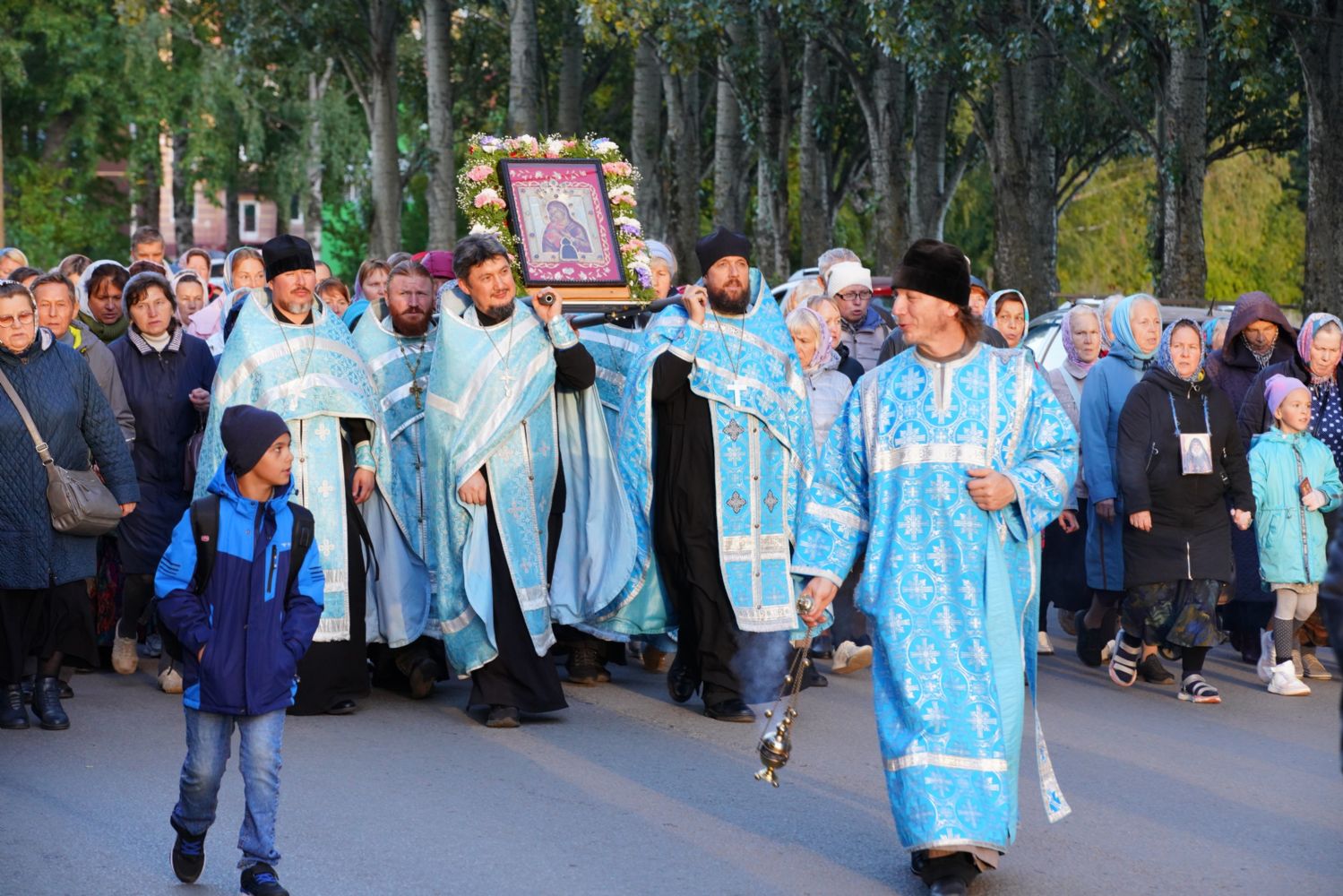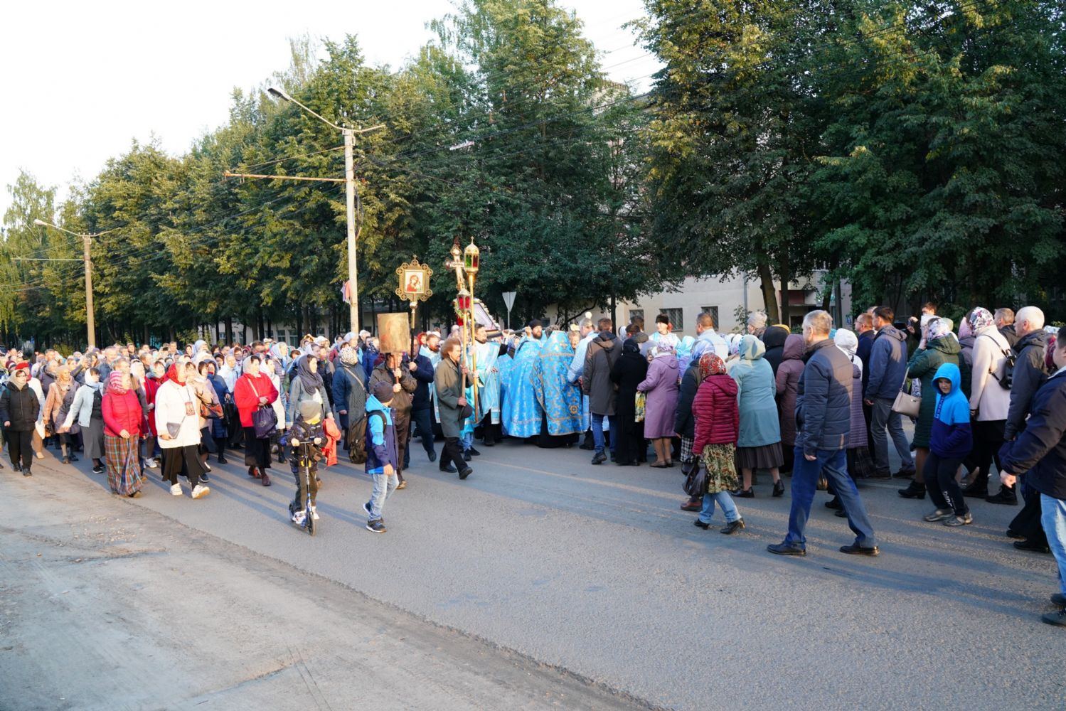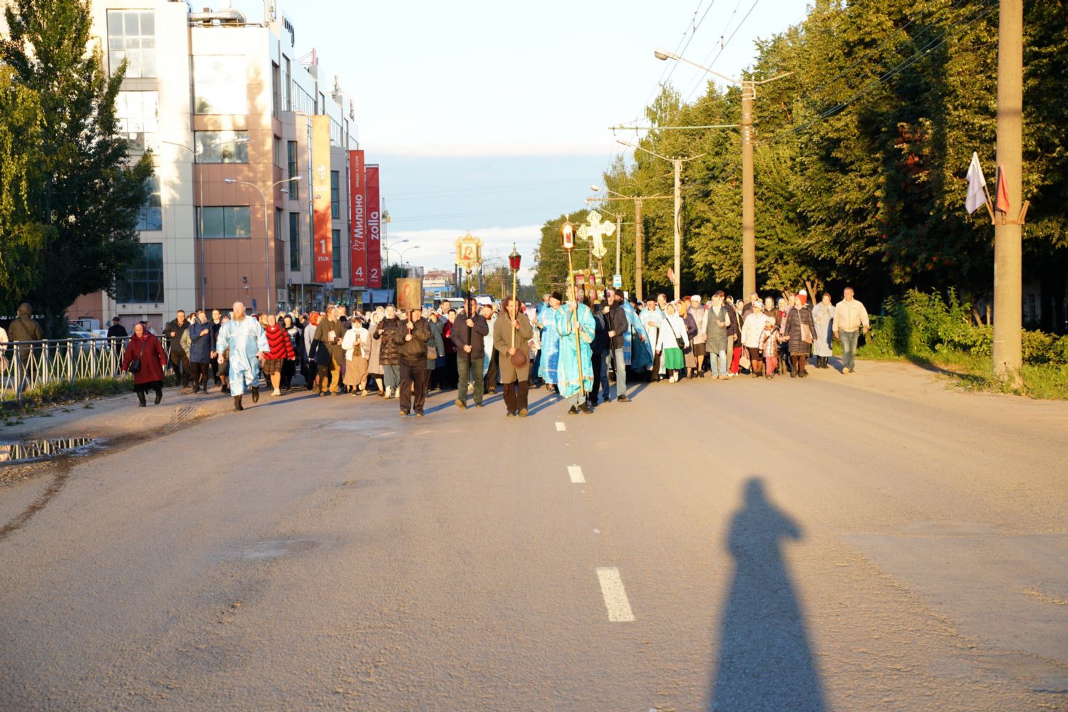 По завершении богослужения прошел крестный ход вокруг храма, а затем крестоходцы с архангельским песнопением "Богородице, Дево, радуйся..." двинулись по улицам города в 9-й микрорайон, к храму Рождества Христова. Навстречу также крестным ходом вышли прихожане и духовенство Христорождественского храма во главе с настоятелем - иереем Александром Лоскутовым. Два людских потока слились и направились к вратам храма, где был совершен молебен Пресвятой Богородице, верующие благоговейно прошли под Мироносицкой иконой, а священники окропили всех святой водой.