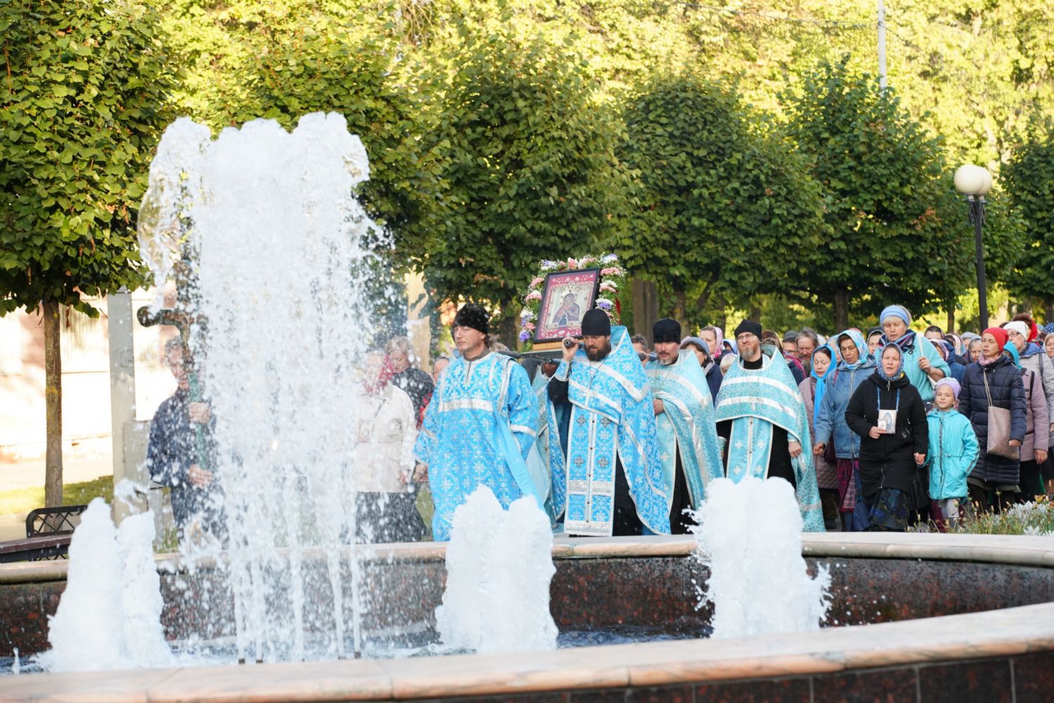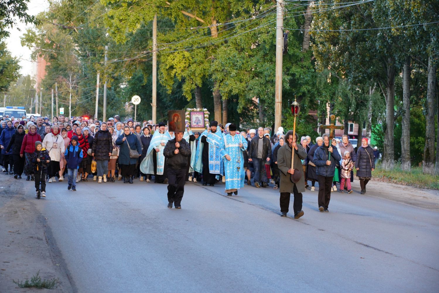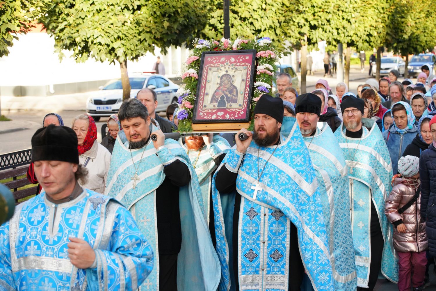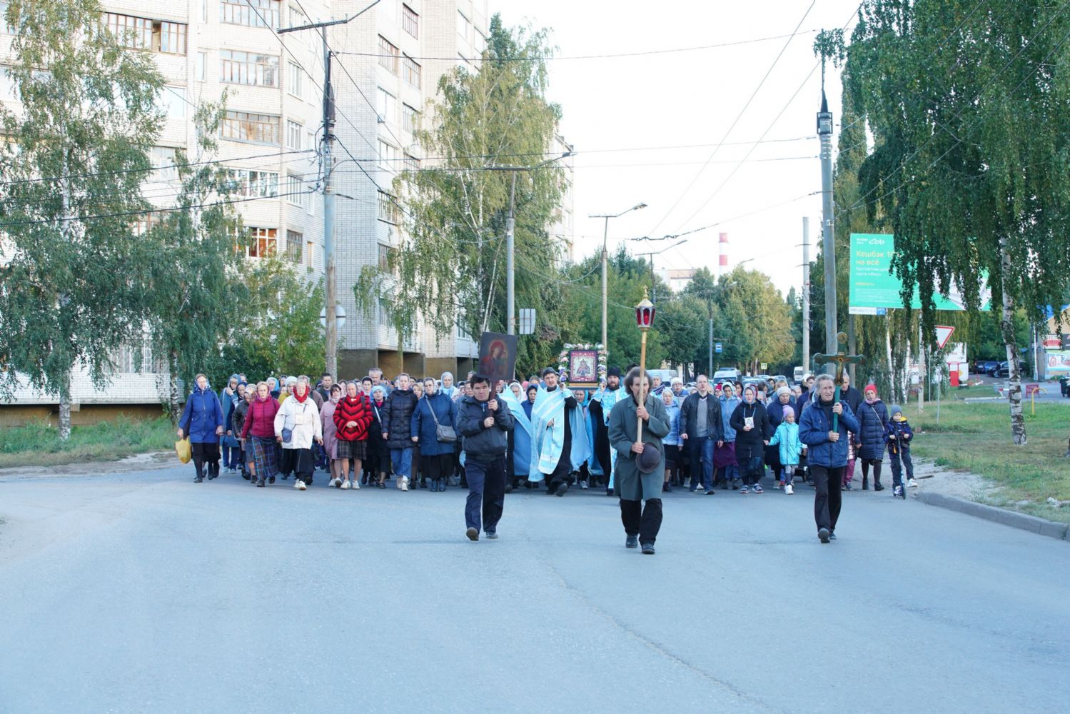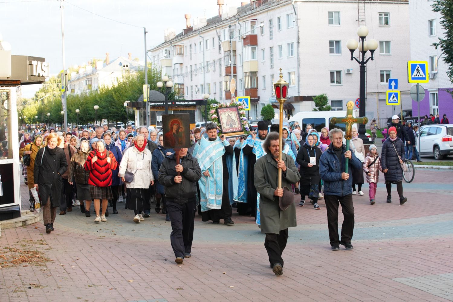 По завершении богослужения прошел крестный ход вокруг храма, а затем крестоходцы с архангельским песнопением "Богородице, Дево, радуйся..." двинулись по улицам города в 9-й микрорайон, к храму Рождества Христова. Навстречу также крестным ходом вышли прихожане и духовенство Христорождественского храма во главе с настоятелем - иереем Александром Лоскутовым. Два людских потока слились и направились к вратам храма, где был совершен молебен Пресвятой Богородице, верующие благоговейно прошли под Мироносицкой иконой, а священники окропили всех святой водой.