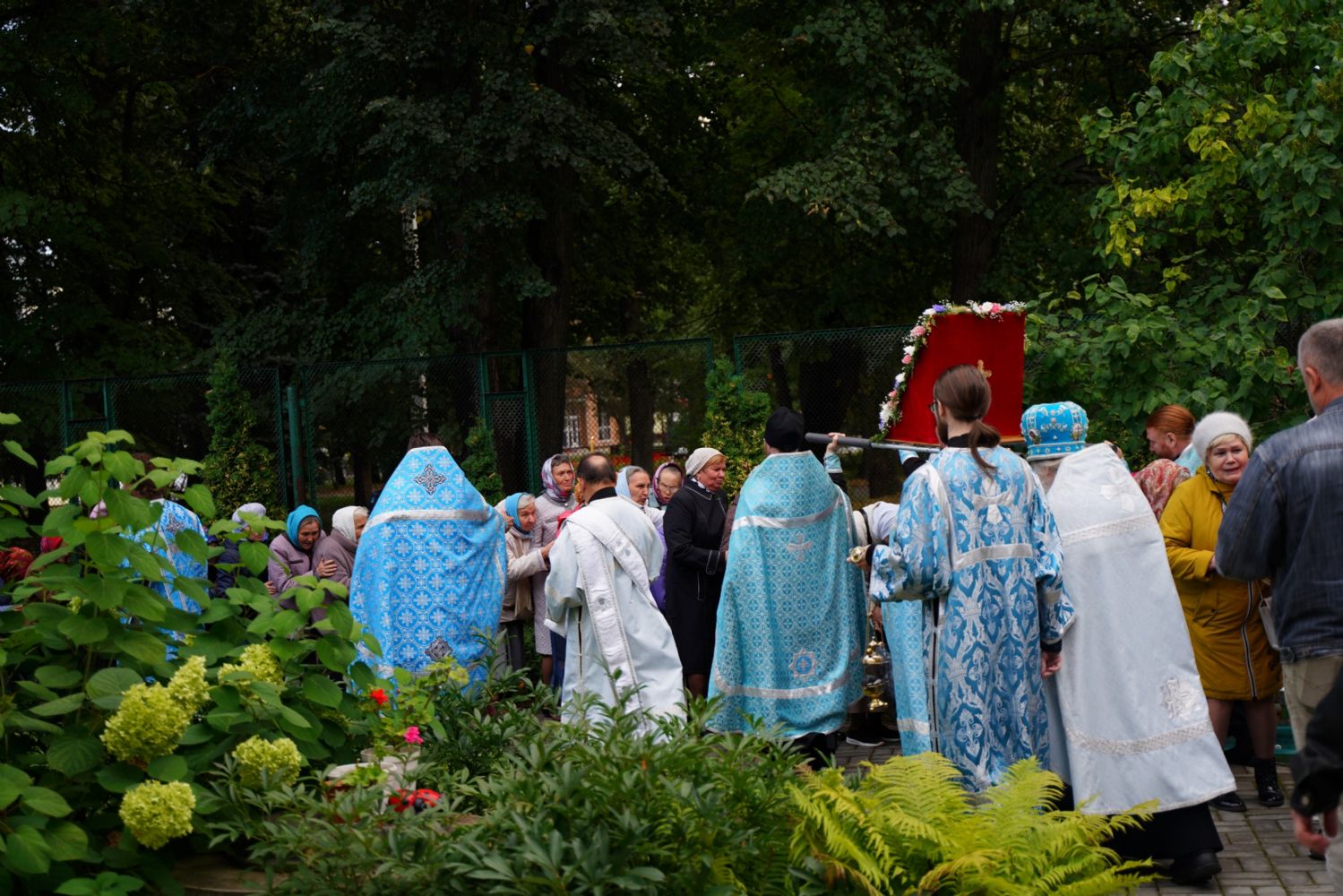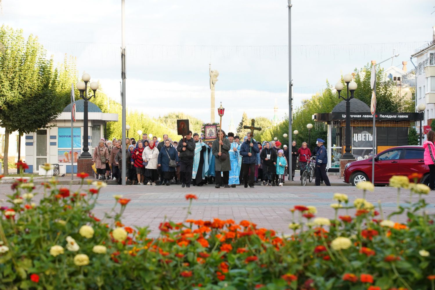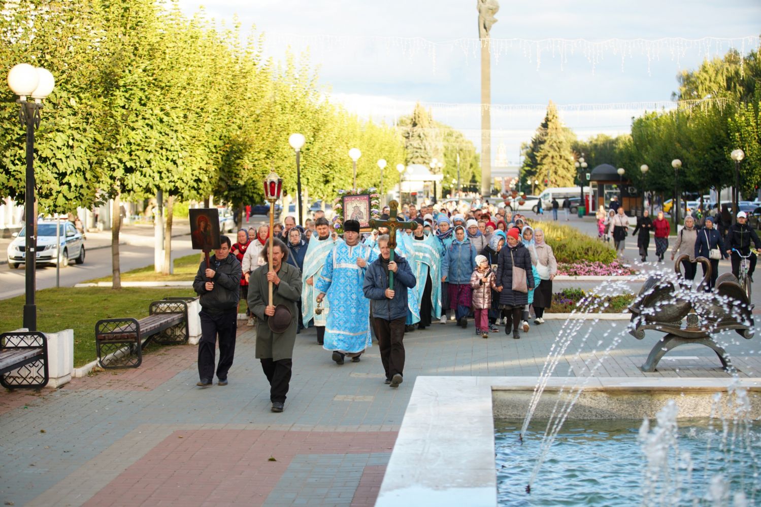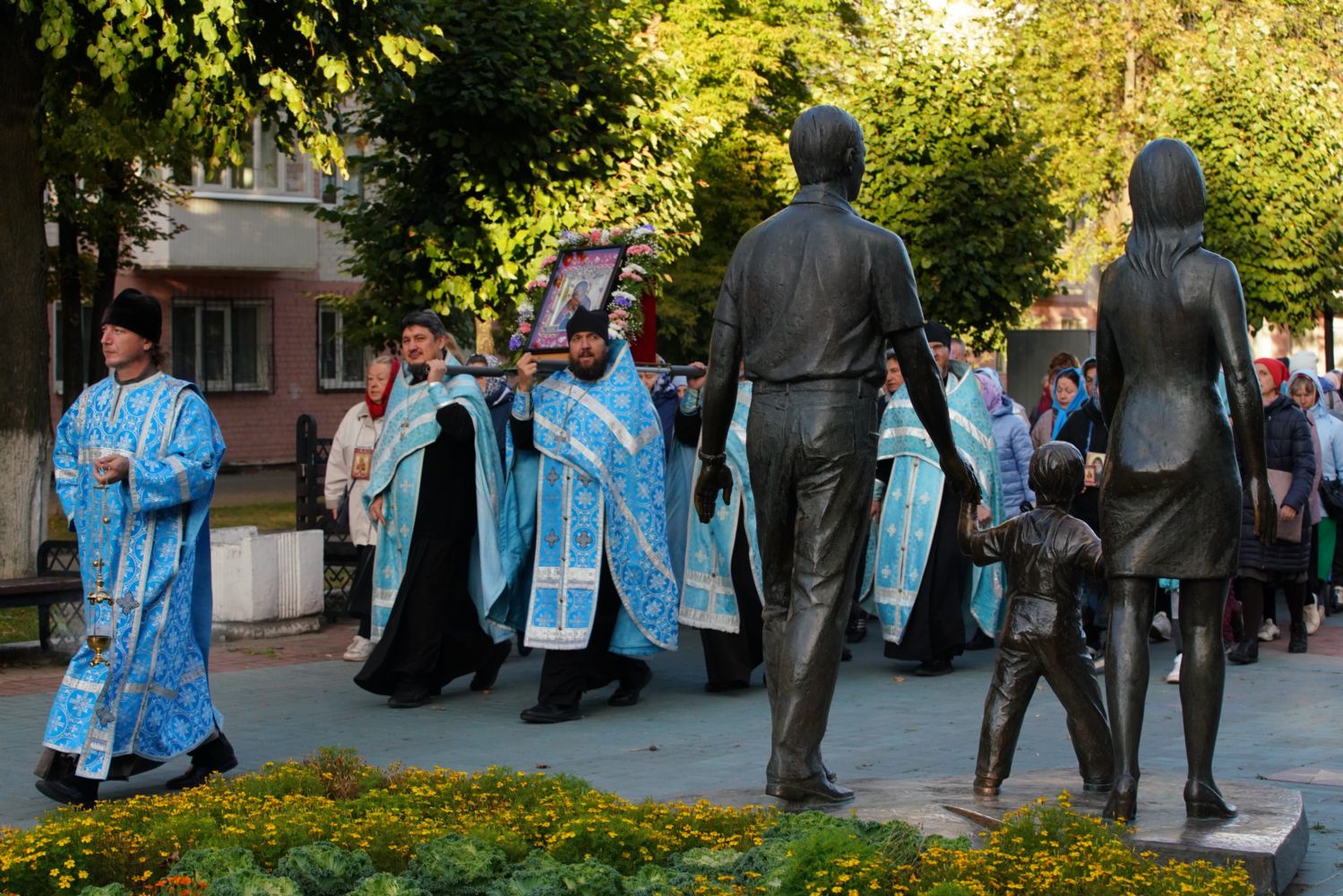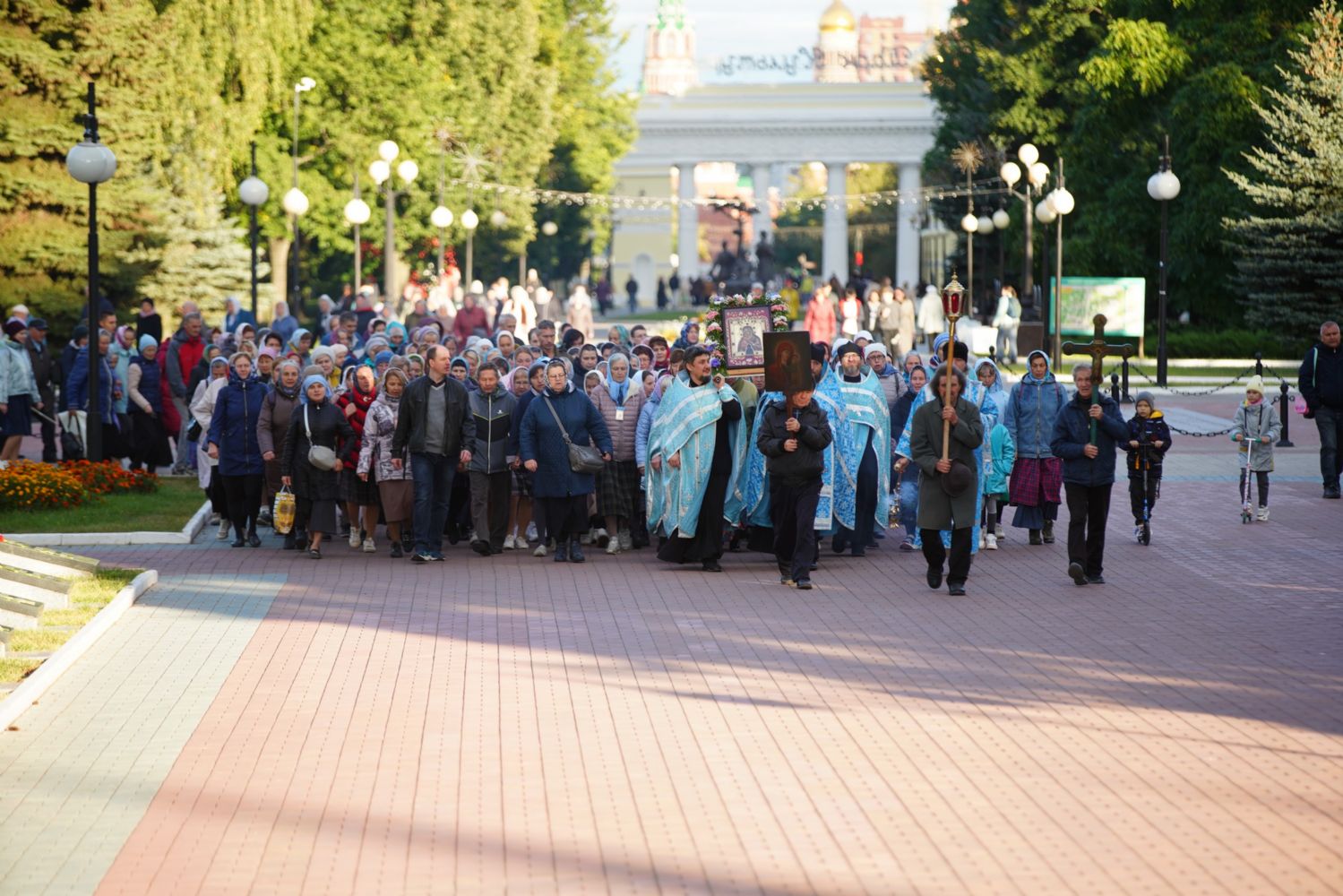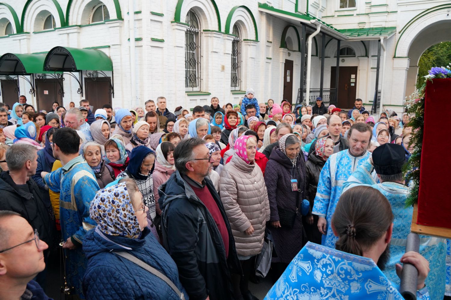 По завершении богослужения прошел крестный ход вокруг храма, а затем крестоходцы с архангельским песнопением "Богородице, Дево, радуйся..." двинулись по улицам города в 9-й микрорайон, к храму Рождества Христова. Навстречу также крестным ходом вышли прихожане и духовенство Христорождественского храма во главе с настоятелем - иереем Александром Лоскутовым. Два людских потока слились и направились к вратам храма, где был совершен молебен Пресвятой Богородице, верующие благоговейно прошли под Мироносицкой иконой, а священники окропили всех святой водой.