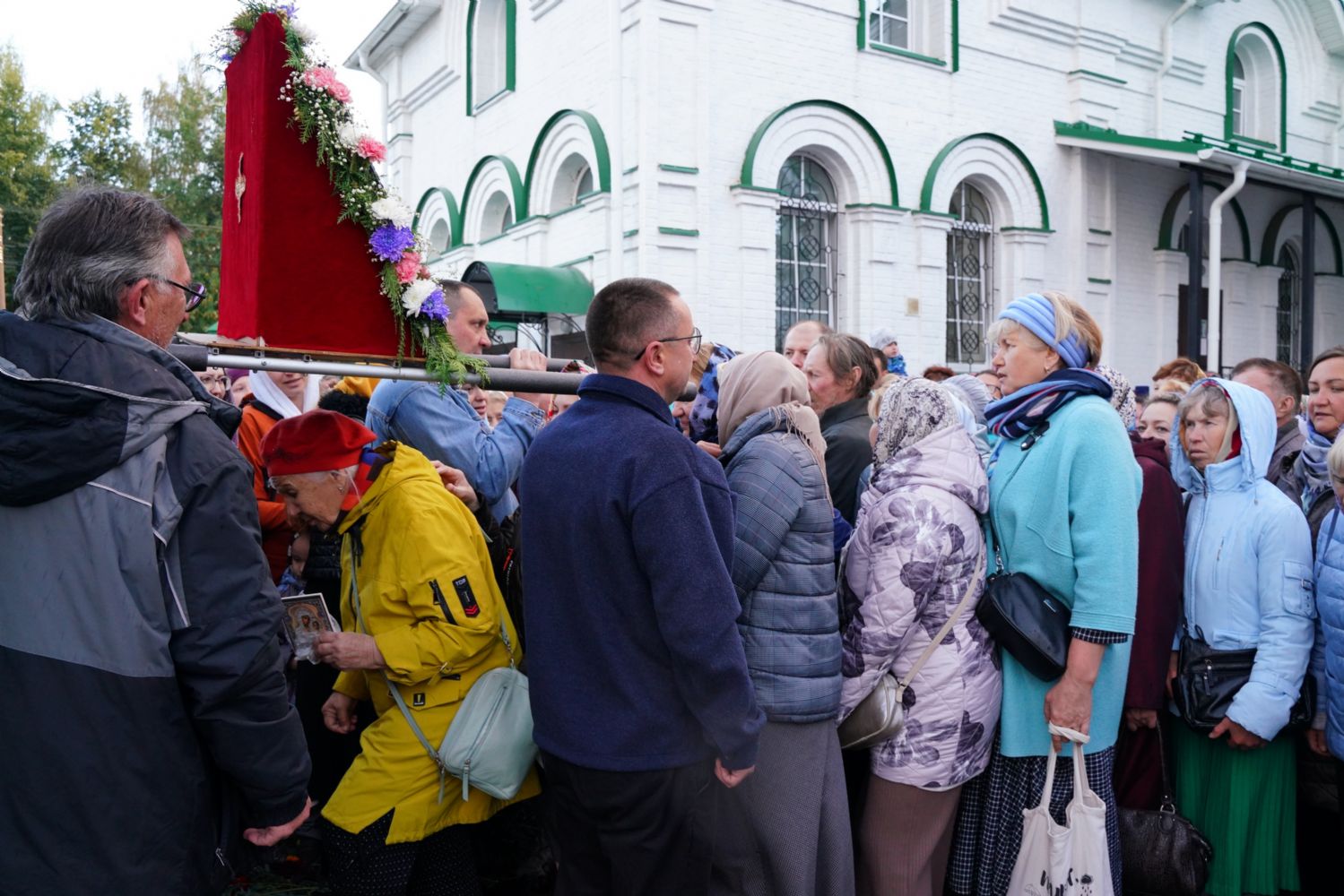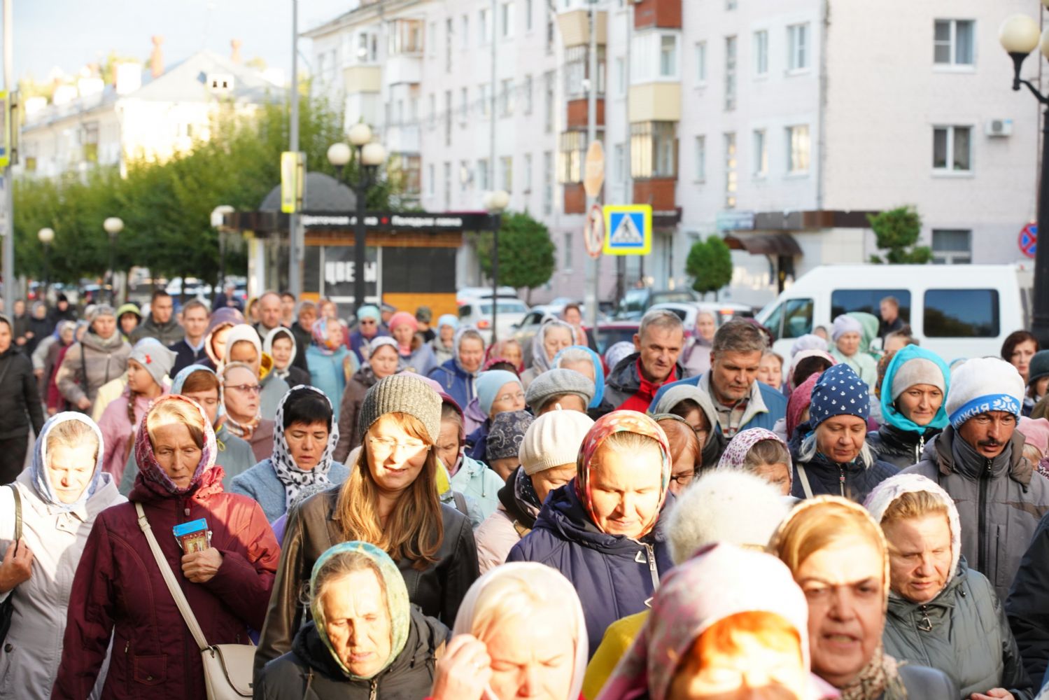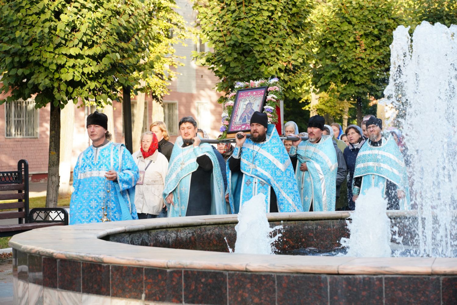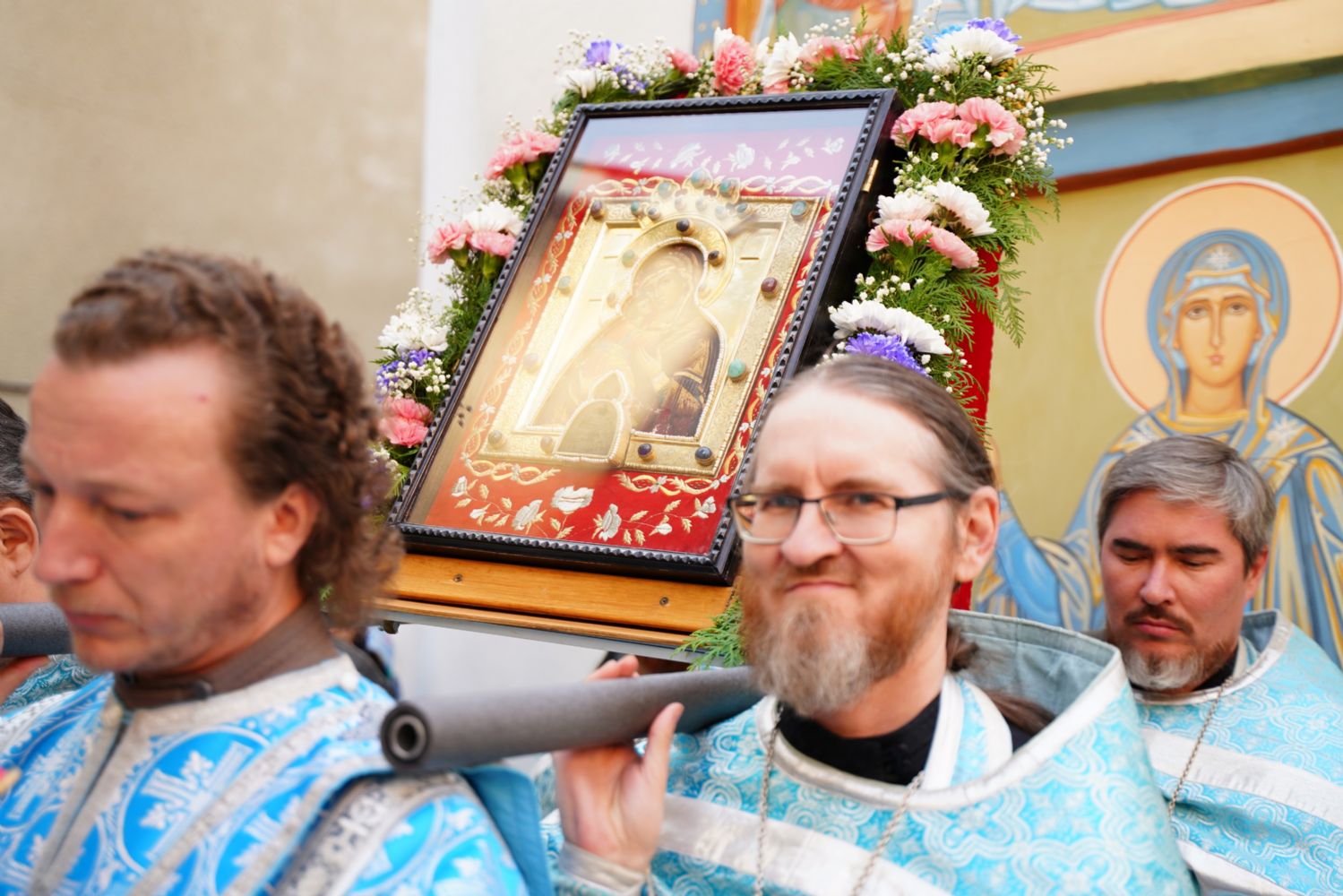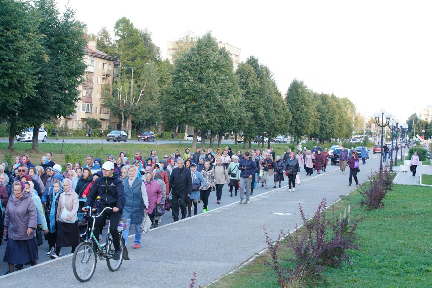 По завершении богослужения прошел крестный ход вокруг храма, а затем крестоходцы с архангельским песнопением "Богородице, Дево, радуйся..." двинулись по улицам города в 9-й микрорайон, к храму Рождества Христова. Навстречу также крестным ходом вышли прихожане и духовенство Христорождественского храма во главе с настоятелем - иереем Александром Лоскутовым. Два людских потока слились и направились к вратам храма, где был совершен молебен Пресвятой Богородице, верующие благоговейно прошли под Мироносицкой иконой, а священники окропили всех святой водой.
