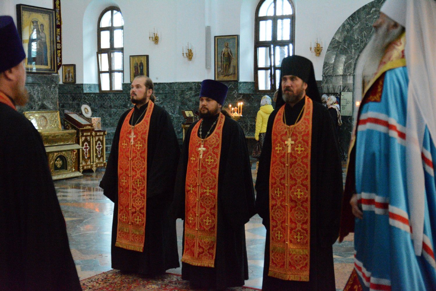 Владыке сослужили секретарь Йошкар-Олинского епархиального управления иеромонах Серафим (Пасанаев), ключарь кафедрального собора протоиерей Сергий Поглазов, клирики собора и протодиакон Михаил Козловский. Песнопения исполнял хор «Благовест» под управлением регента Надежды Поздеевой.