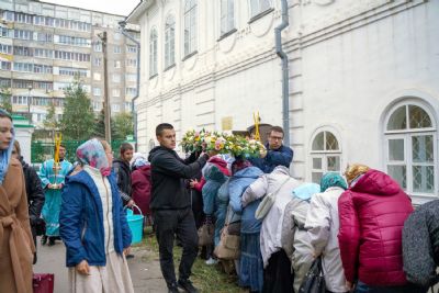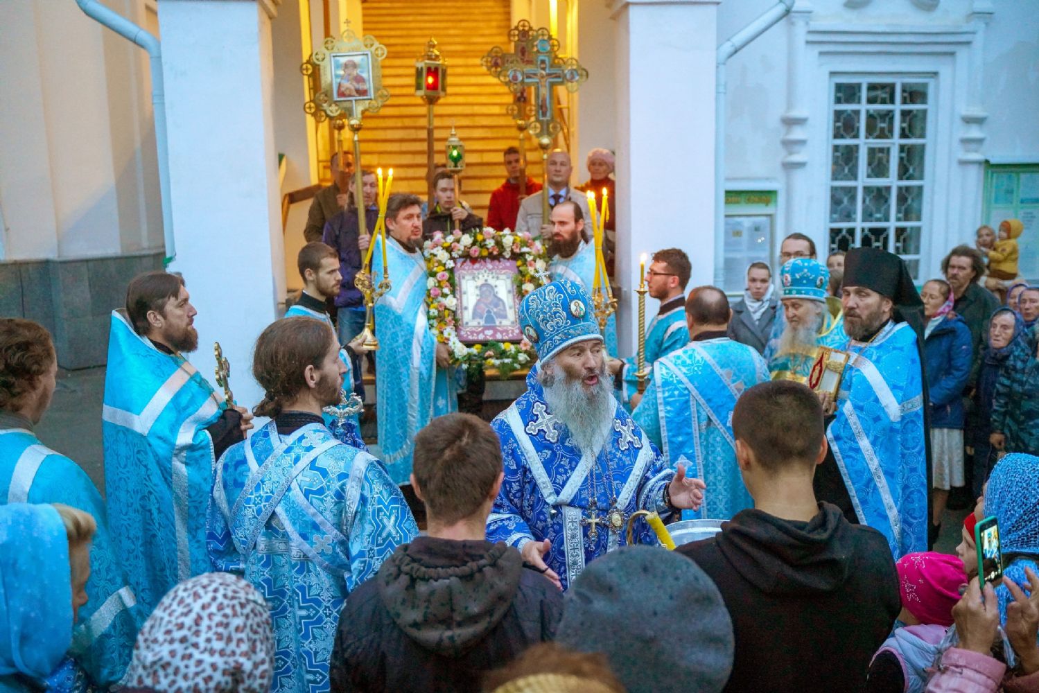 По окончании всенощного бдения крестный ход с Мироносицкой иконой Богородицы продолжился и, обойдя вокруг домового храма, отправился к Вознесенскому собору, где святыню встретили духовенство и прихожане собора.
