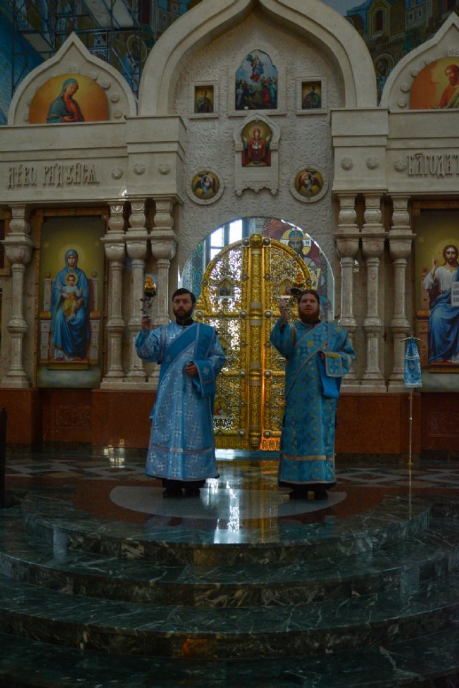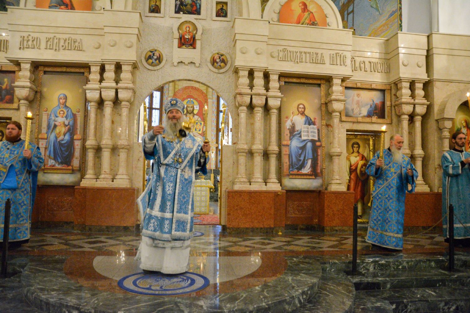 Его Высокопреосвященству сослужили ключарь собора протоиерей Сергий Поглазов, секретарь епархиального совета иерей Георгий Колотов, клирики кафедрального собора и протодиакон Михаил Козловский. Песнопения исполнял детско-юношеский хор «Благовест» под руководством регента Татьяны Черновой.