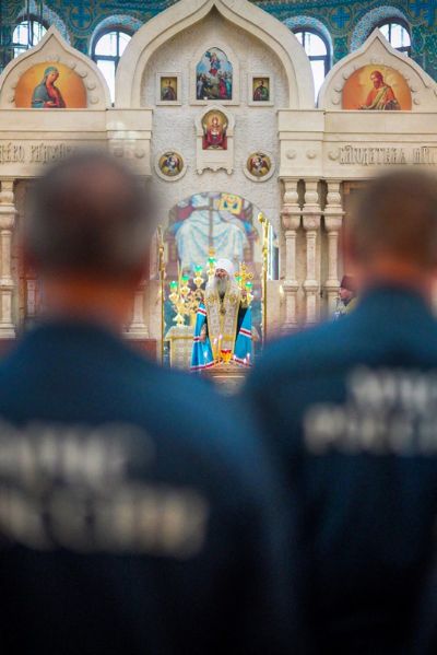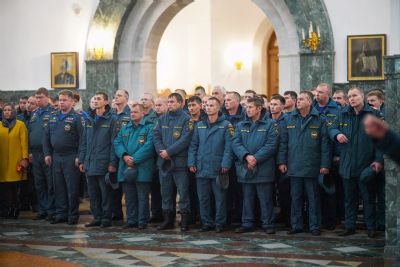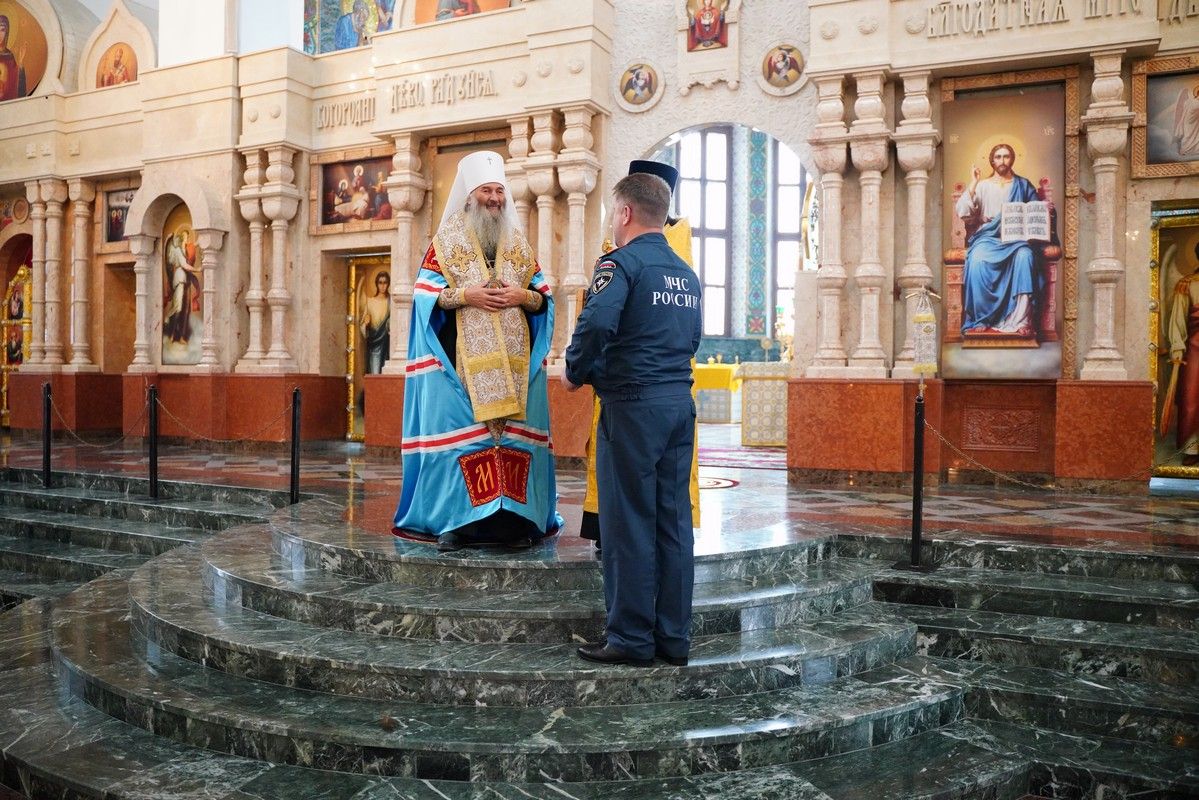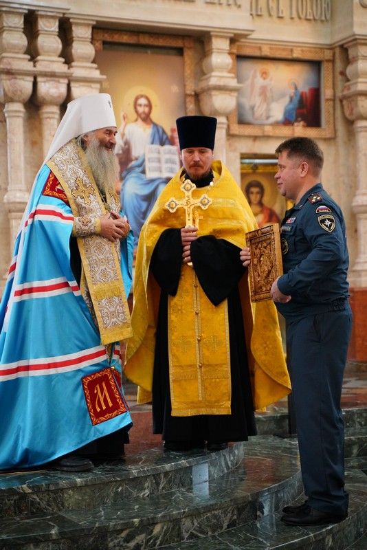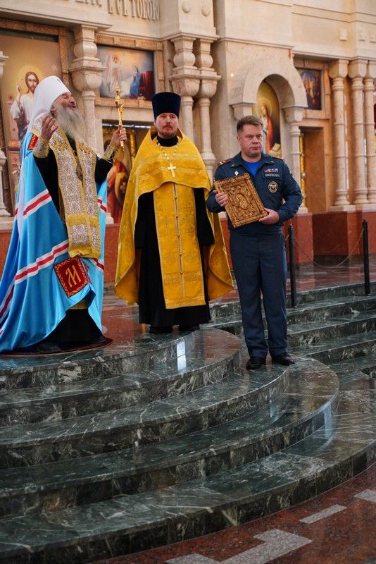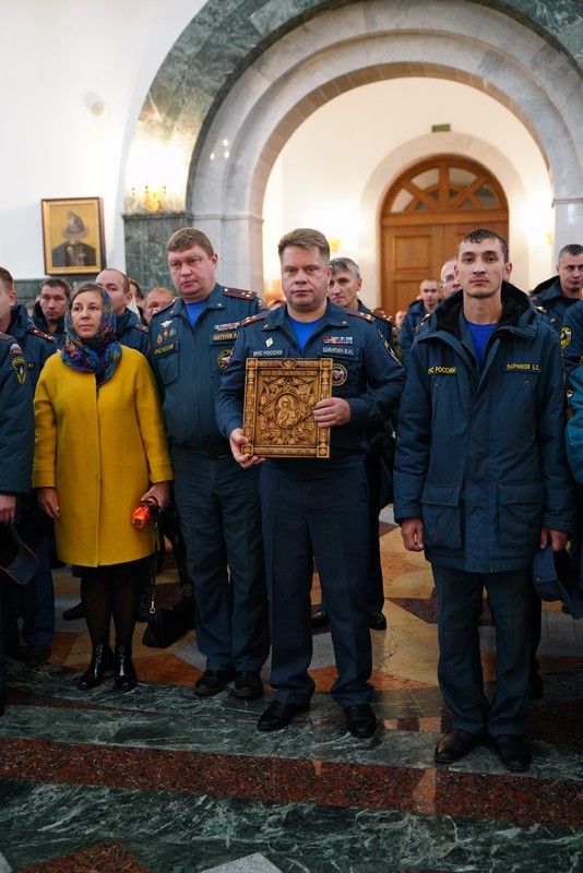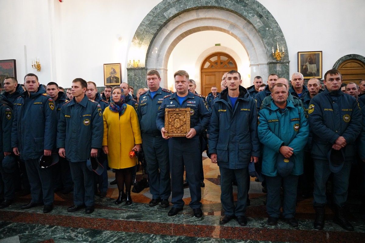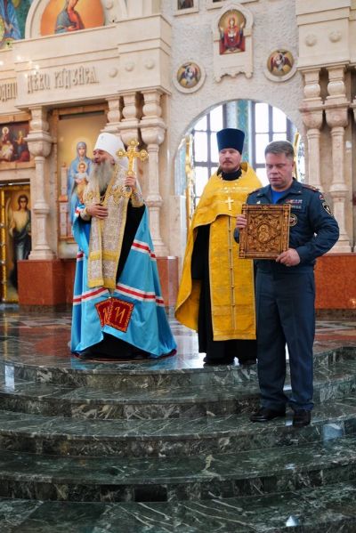 На молитвенную память сотрудникам МЧС митрополит Иоанн преподнес икону Божией Матери «Неопалимая Купина», пожелав в любое мгновение жизни прибегать за помощью к Пресвятой Богородице, Которая с нами до скончания века и никогда не оставит того, кот прославляет Ее архангельским благовестием и соблюдает заповеди Господни.