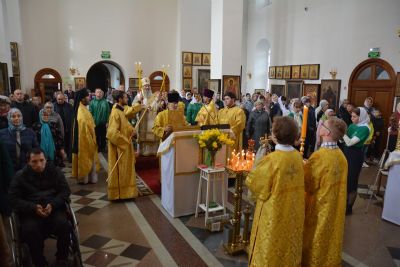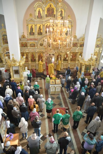 Его Высокопреосвященству сослужили секретарь Йошкар-Олинского епархиального управления иеромонах Серафим (Пасанаев), настоятель храма Рождества Христова иерей Александр Лоскутов и протодиакон Михаил Козловский. Песнопения исполнял хор храма под управлением регента Наталии Поповой.