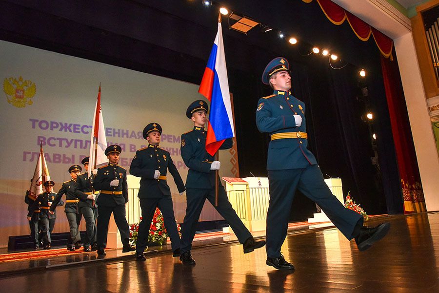 Офицеры Почетного караула под звуки марша Преображенского полка внесли в зал Государственные флаги Российской Федерации и Республики Марий Эл, специальные экземпляры Конституций Российской Федерации и Республики Марий Эл, Штандарт и Знак Главы Республики Марий Эл.