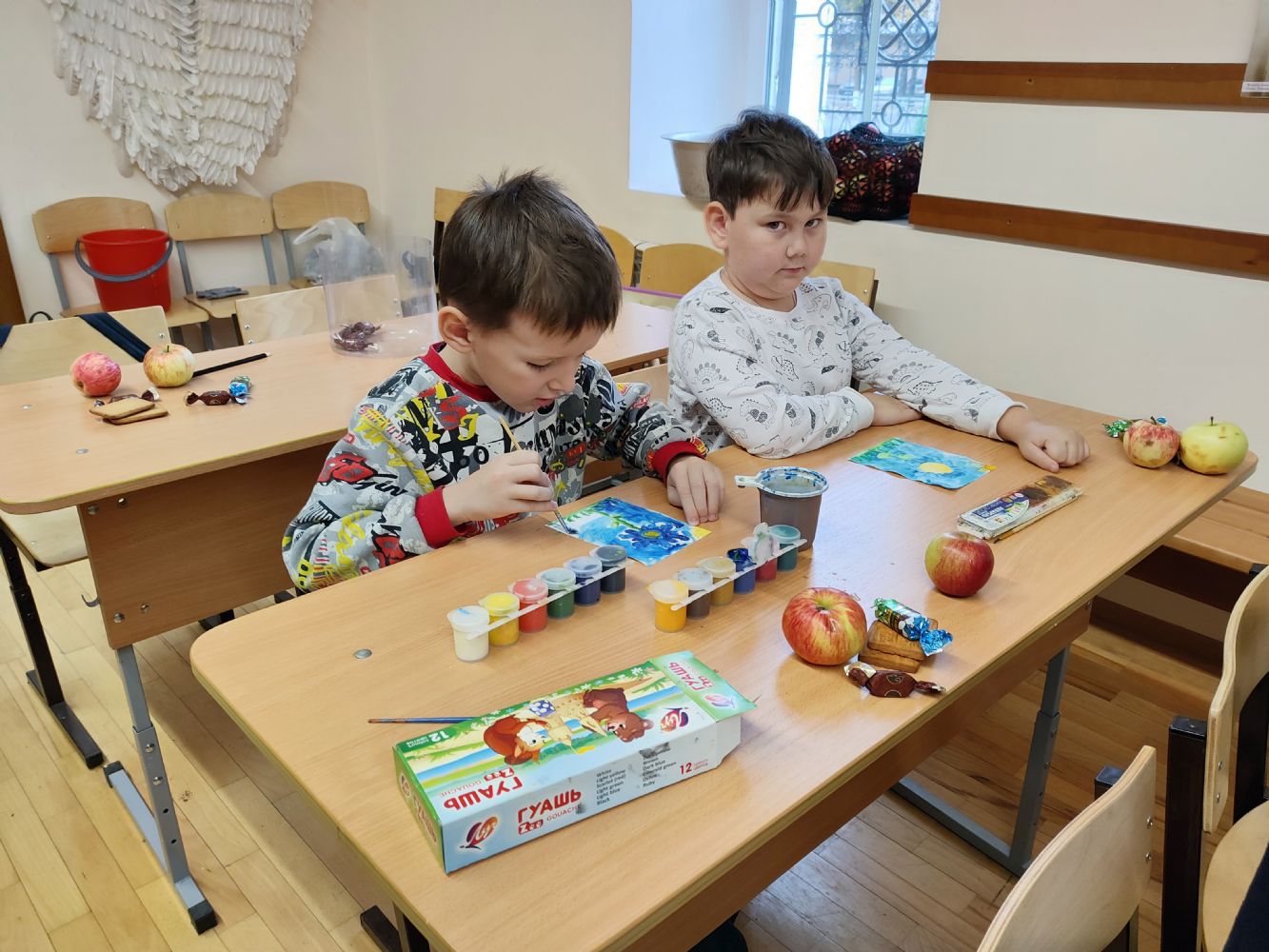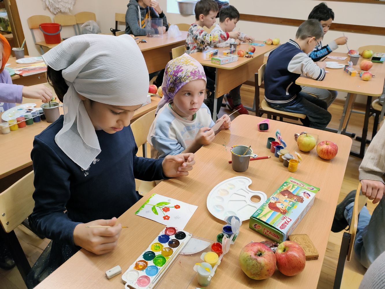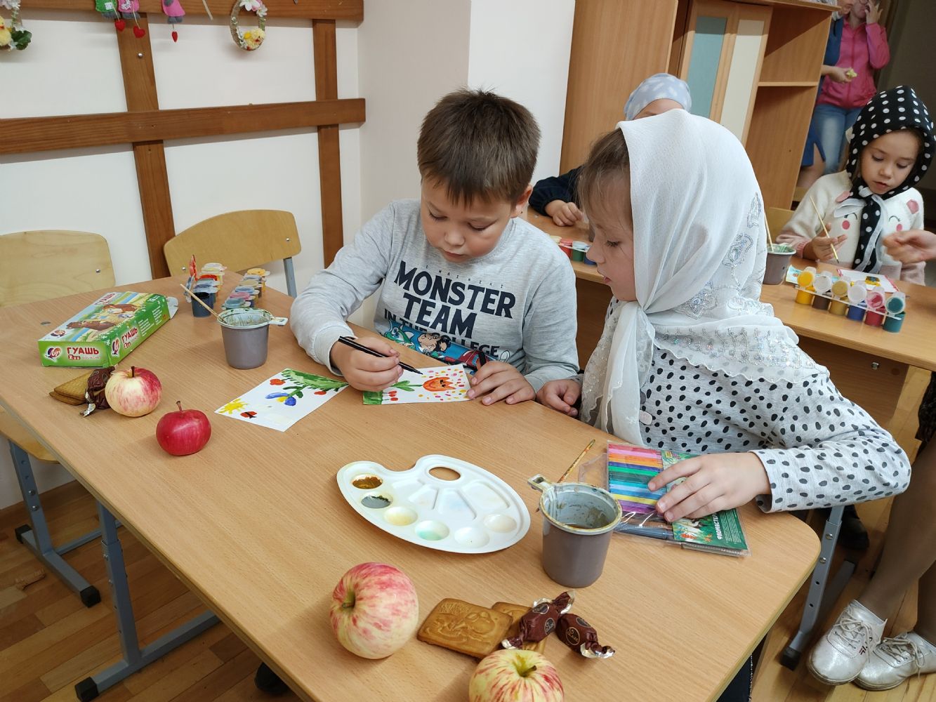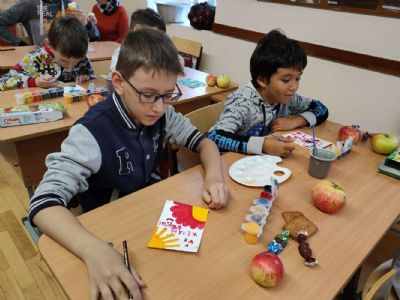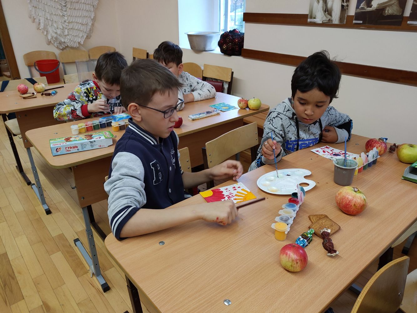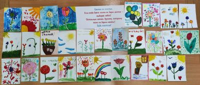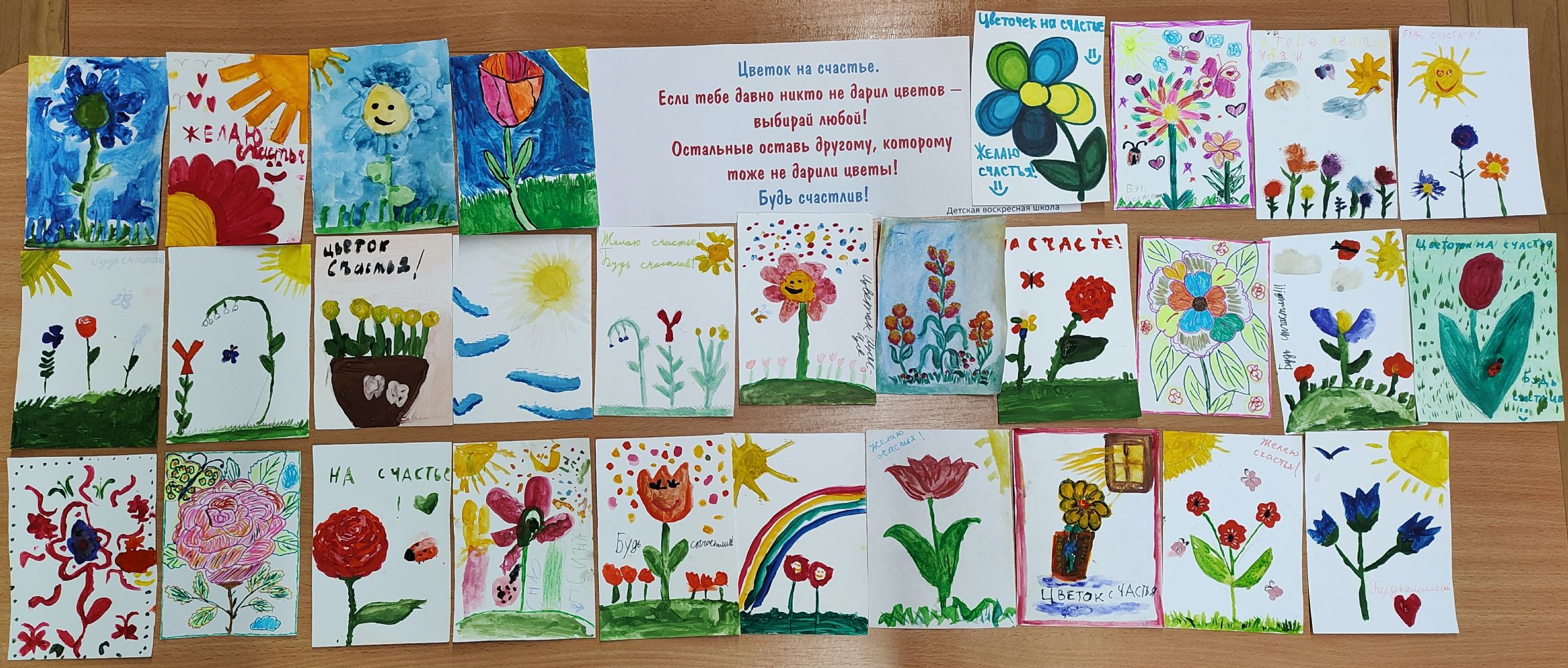 На творческих занятиях каждый ребенок нарисовал открытку с цветами и пожеланиями добра и счастья. Эти открытки размещены на стенде на территории храма, здесь же плакат с надписью: «Если тебе никто не дарил цветов – выбирай любой! Остальные оставь другому, которому тоже не дарили цветы! Будь счастлив!»