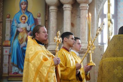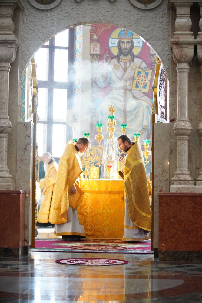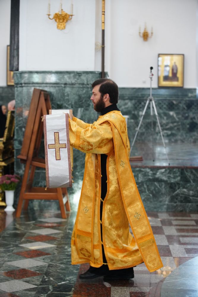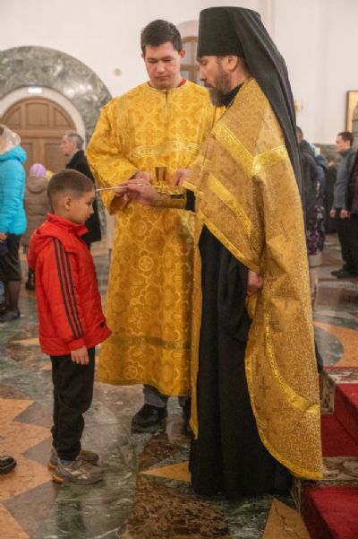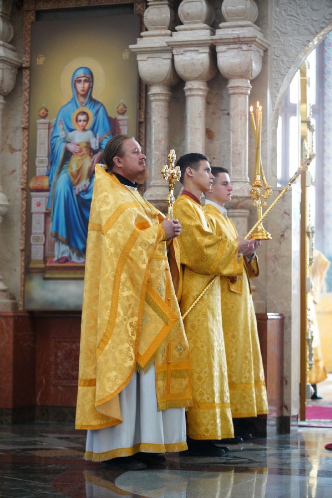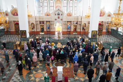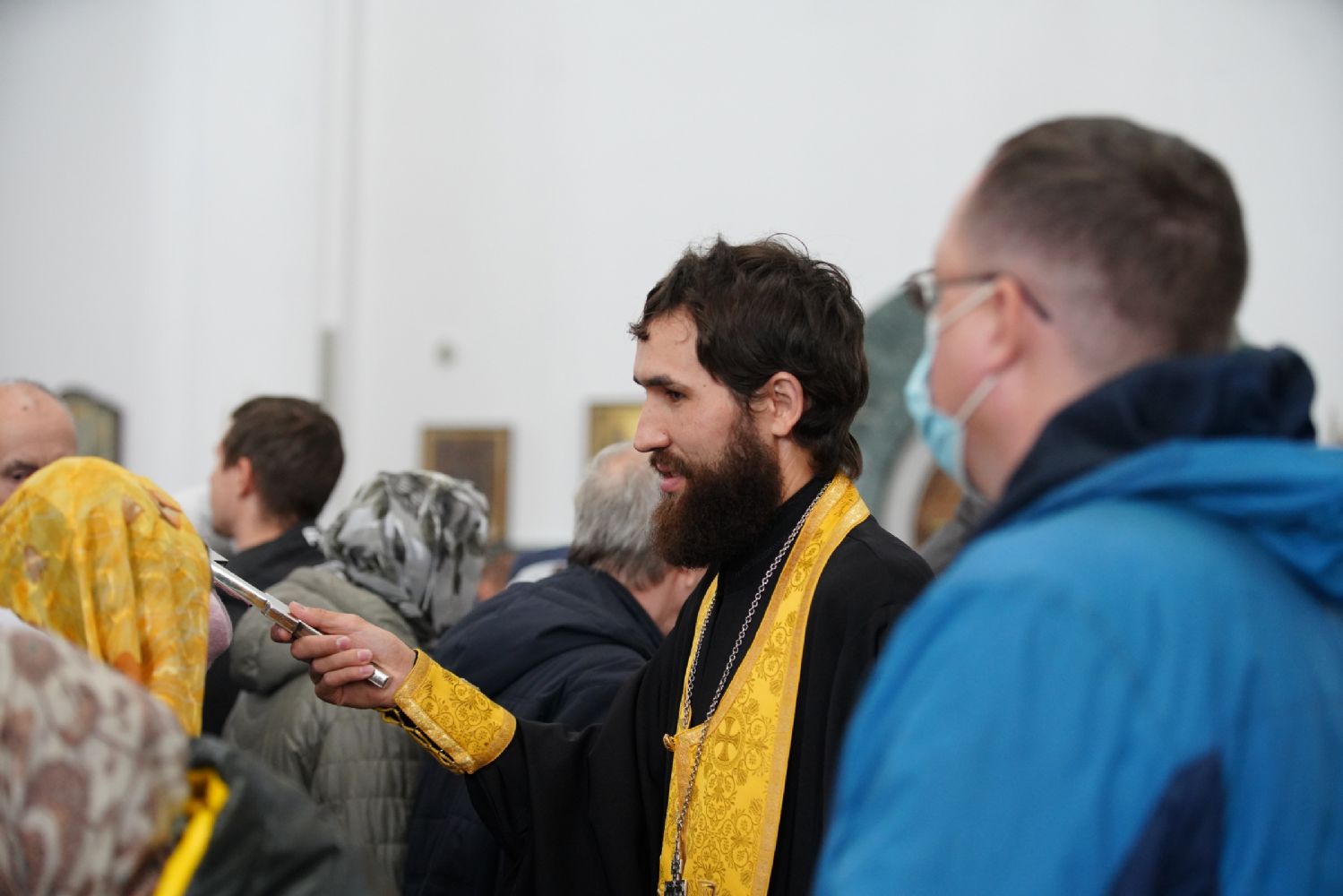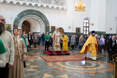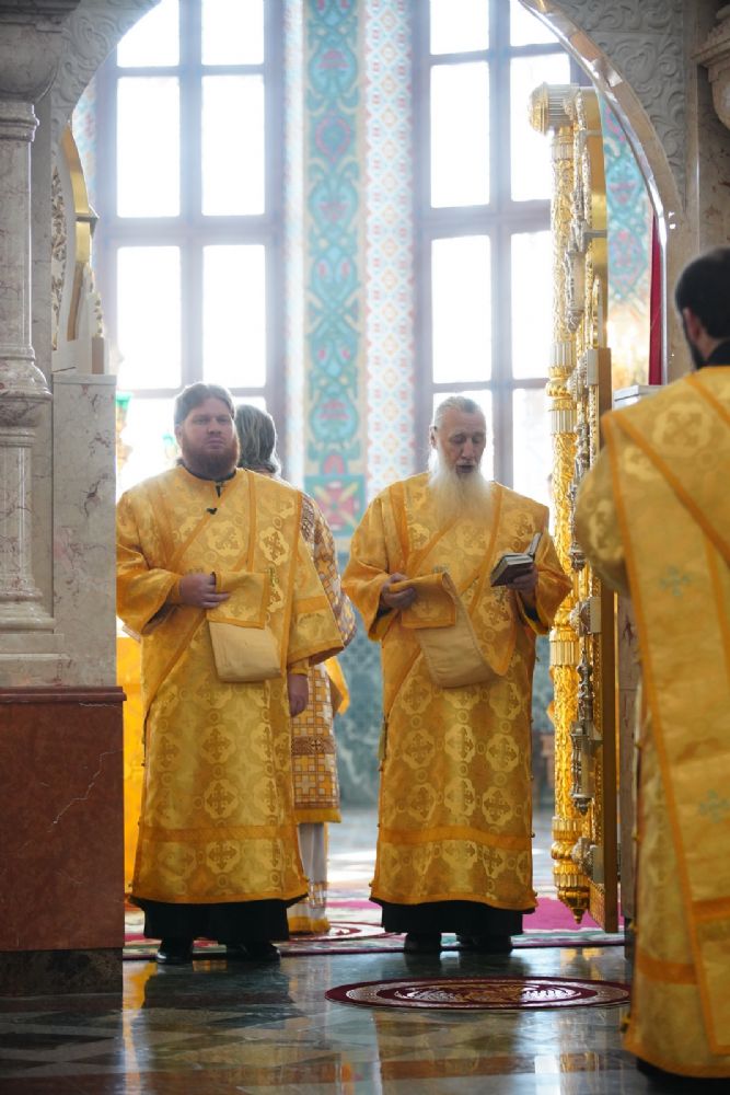 Архипастырю сослужили секретарь Йошкар-Олинского епархиального управления иеромонах Серафим (Пасанаев), ключарь кафедрального собора протоиерей Сергий Поглазов, клирики собора и протодиакон Михаил Козловский. Песнопения исполнял хор «Благовест» под управлением регента Татьяны Черновой.
