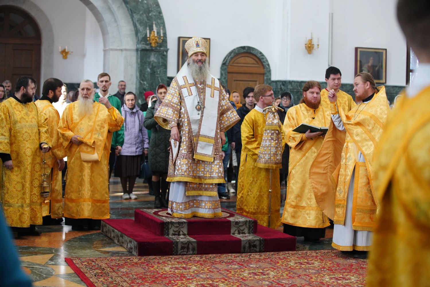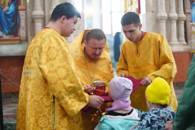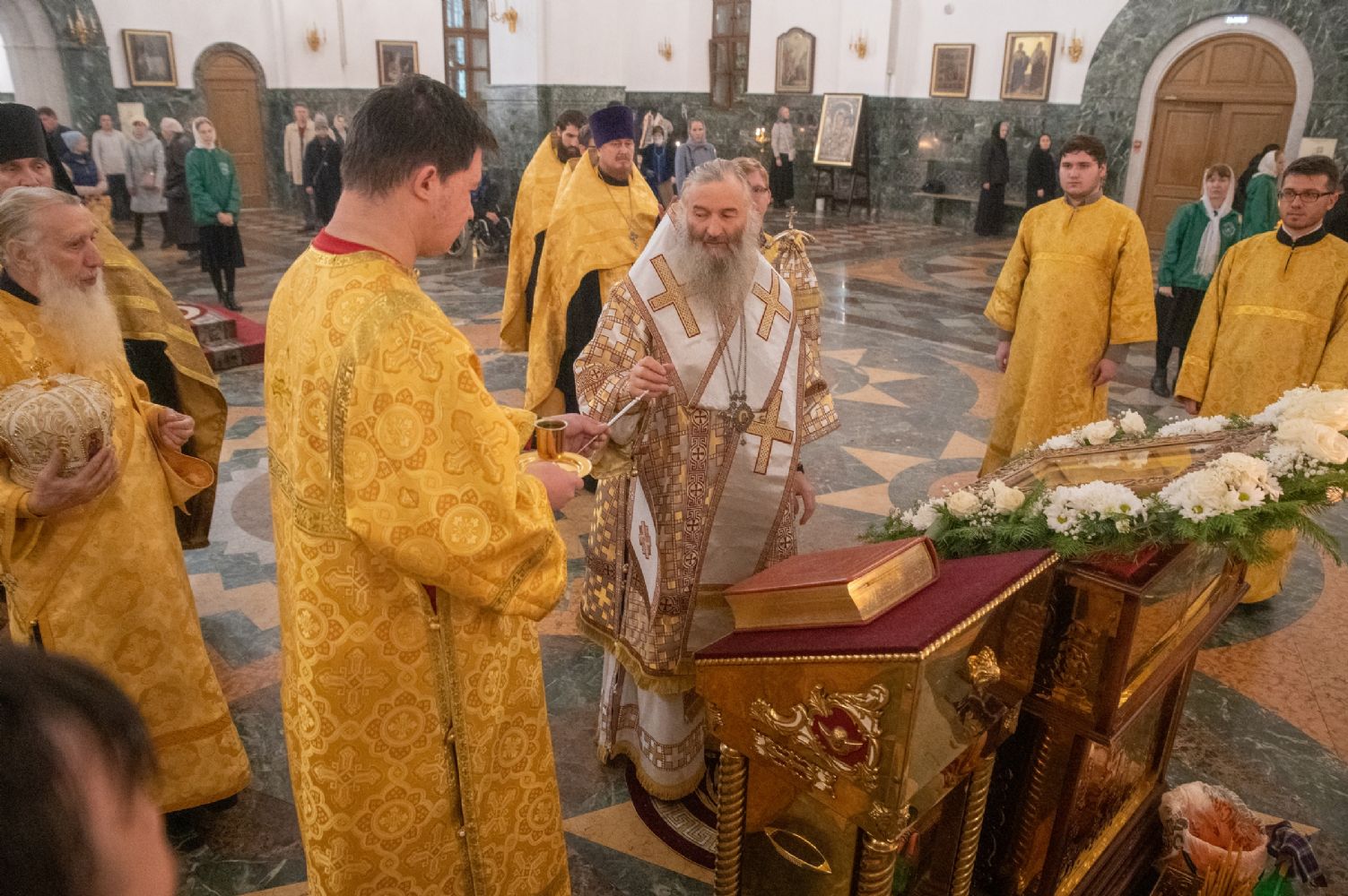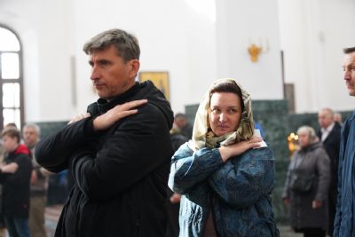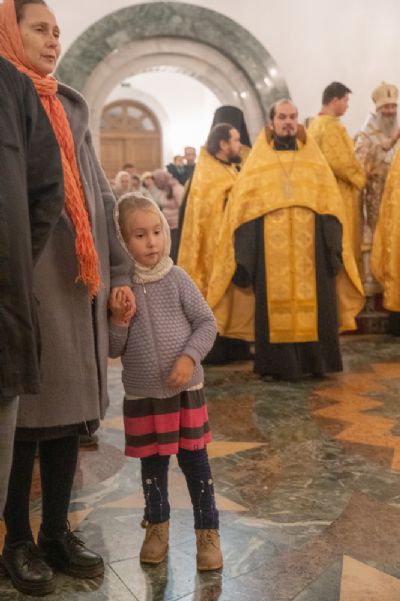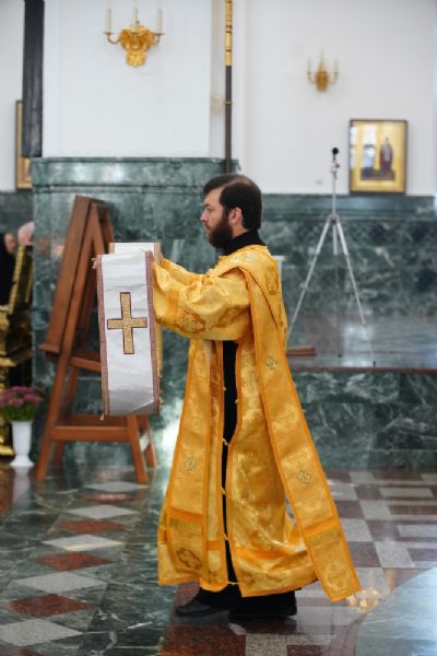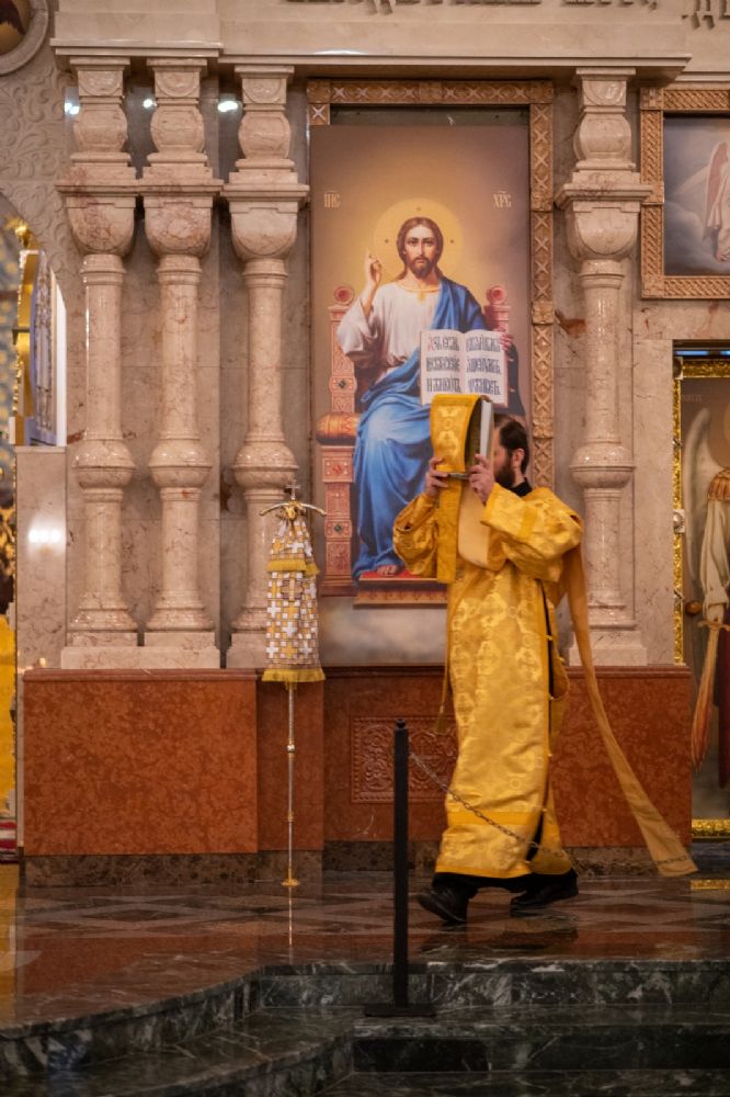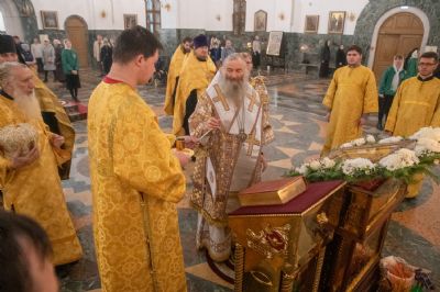 Архипастырю сослужили секретарь Йошкар-Олинского епархиального управления иеромонах Серафим (Пасанаев), ключарь кафедрального собора протоиерей Сергий Поглазов, клирики собора и протодиакон Михаил Козловский. Песнопения исполнял хор «Благовест» под управлением регента Татьяны Черновой.