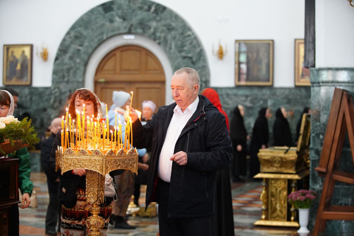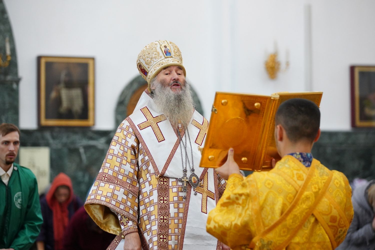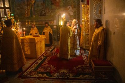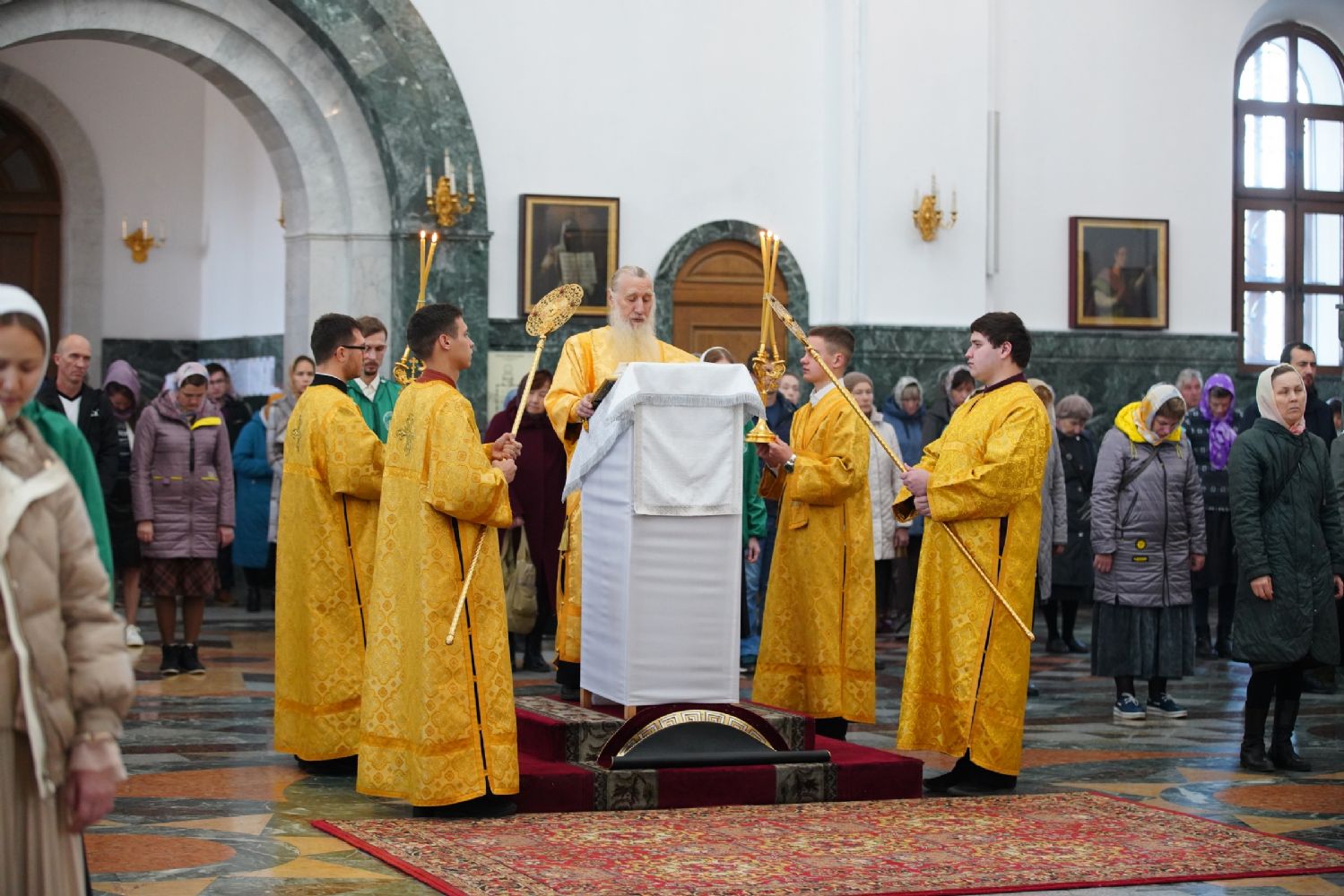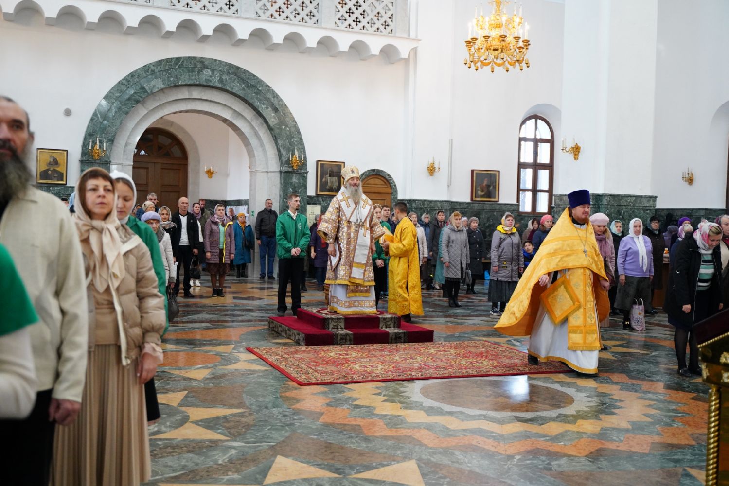 Архипастырю сослужили секретарь Йошкар-Олинского епархиального управления иеромонах Серафим (Пасанаев), ключарь кафедрального собора протоиерей Сергий Поглазов, клирики собора и протодиакон Михаил Козловский. Песнопения исполнял хор «Благовест» под управлением регента Татьяны Черновой.