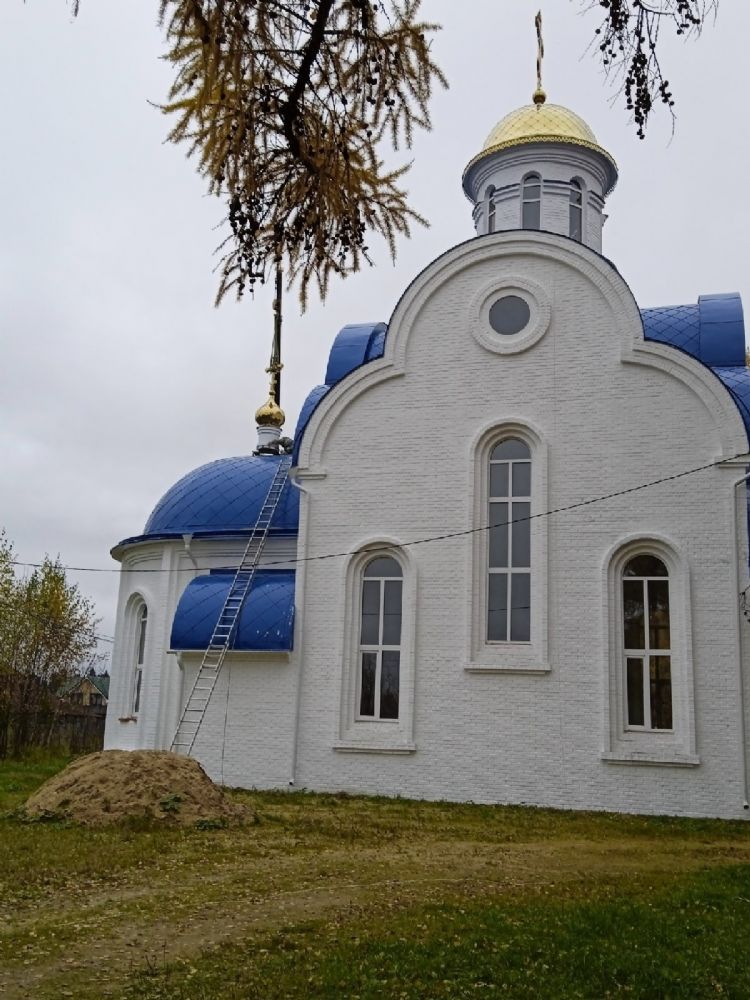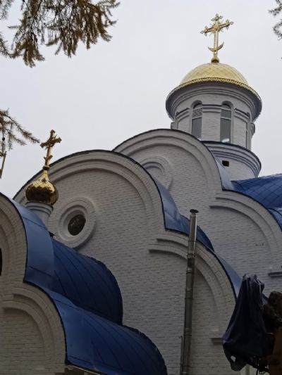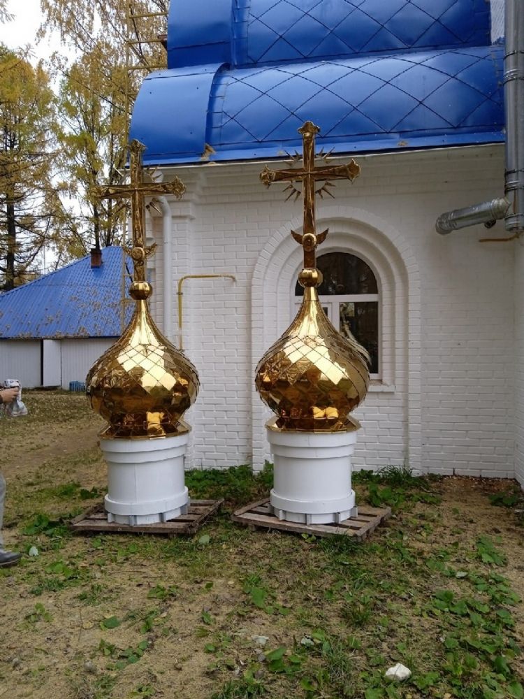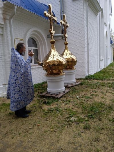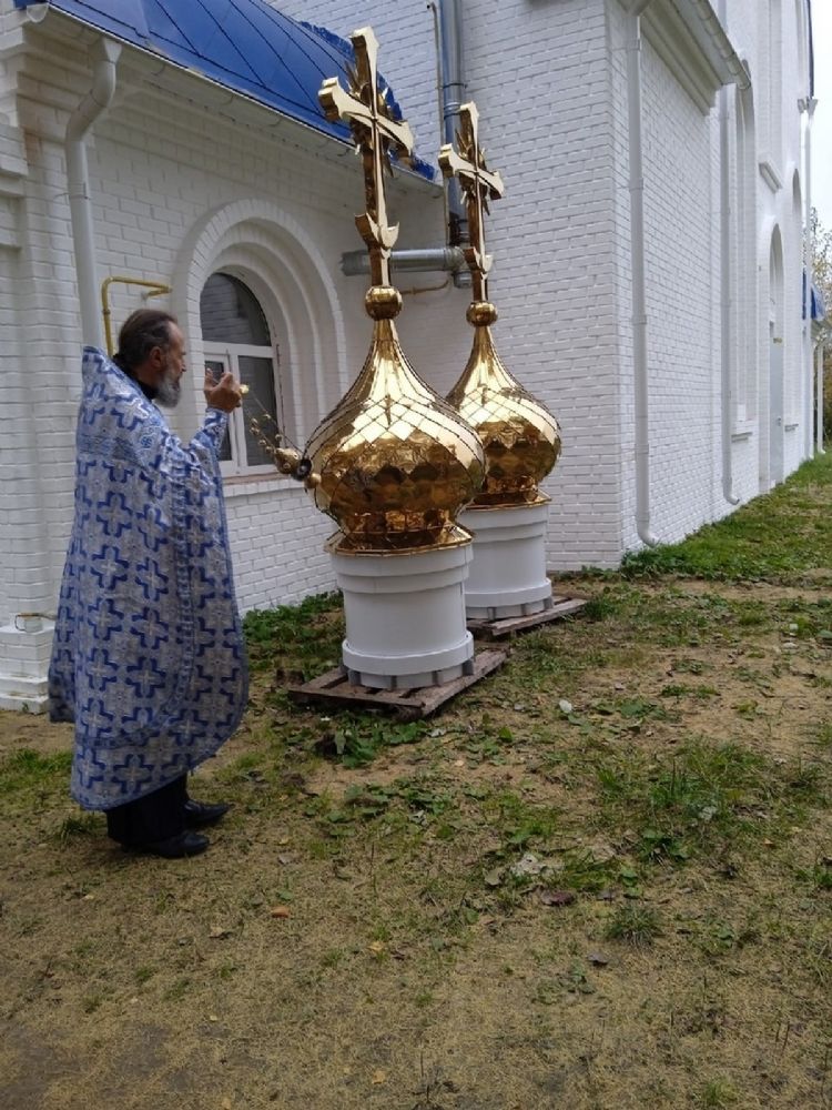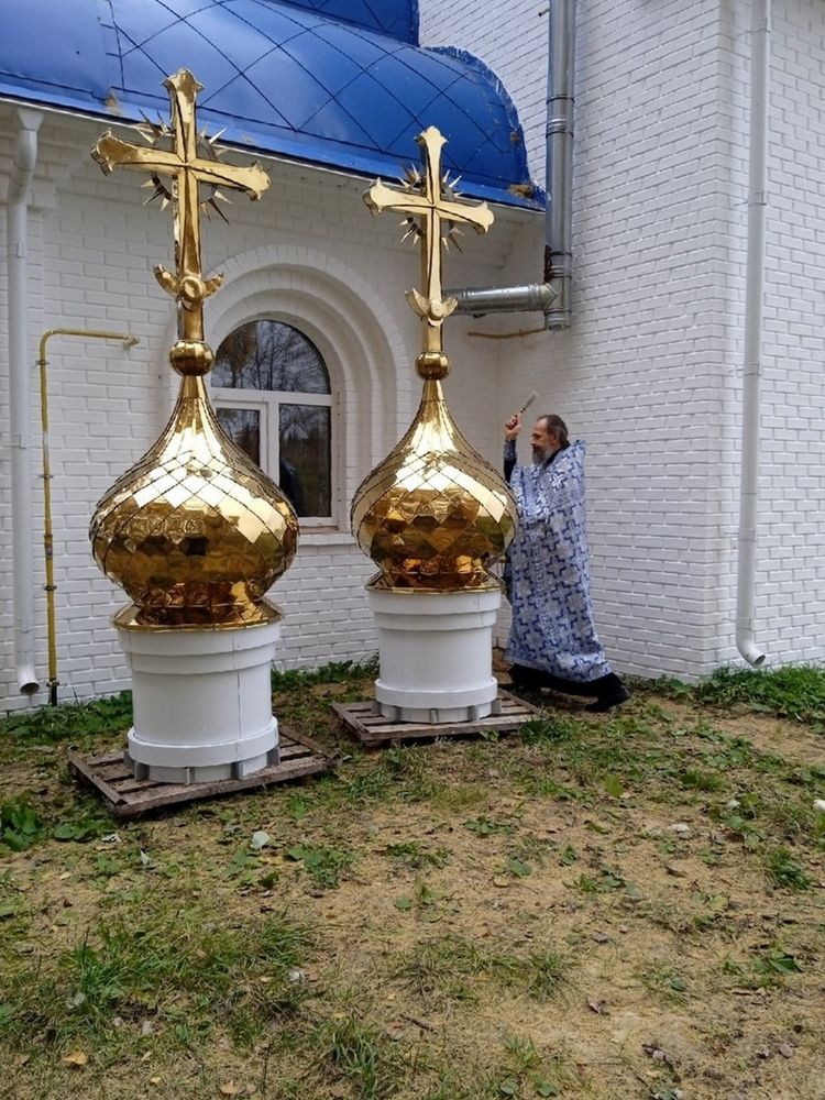 Два малых купола с крестами установили над алтарем и колокольней. После их установки белоснежный храм с голубой крышей стал еще наряднее.