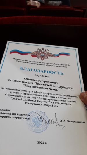 Также состоялось награждение активных участников проекта. Руководитель общества трезвости в честь иконы Пресвятой Богородицы «Неупиваемая Чаша» при Йошкар-Олинской епархии иерей Андрей Кочаков отмечен благодарственным письмом Управления по контролю за оборотом наркотиков МВД по РМЭ за активную работу в сфере профилактики наркомании среди подрастающего поколения.