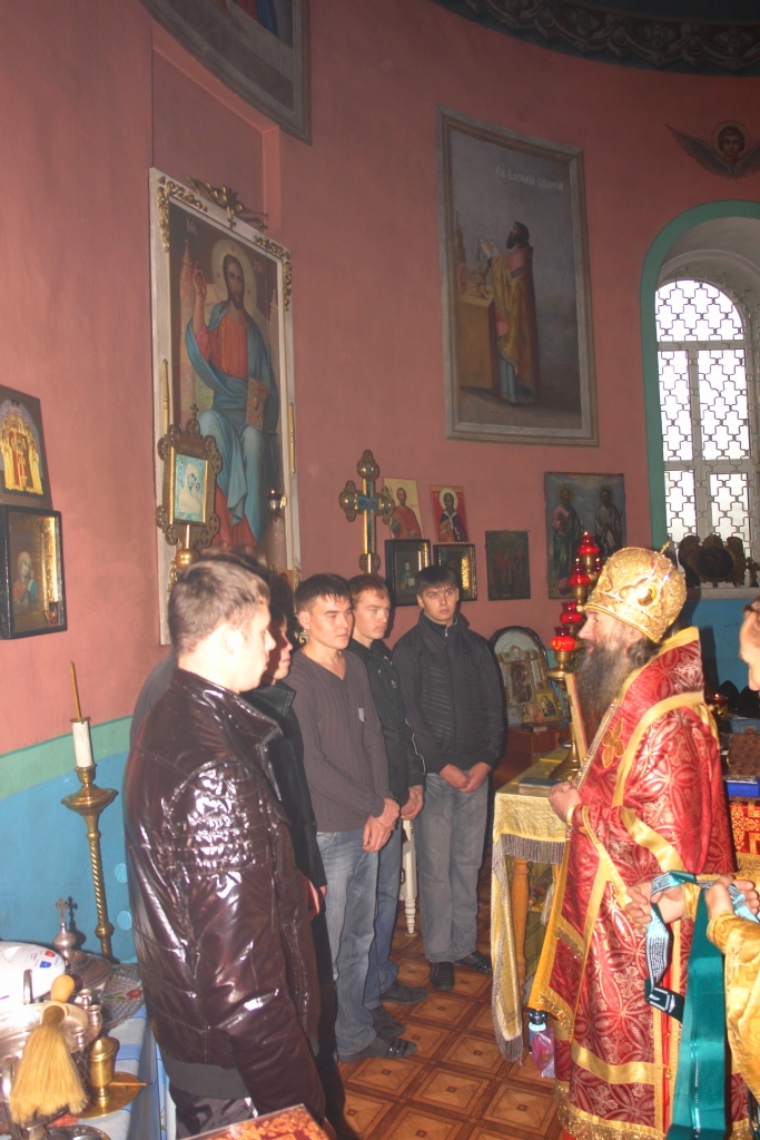 По традиции, в этот день, о. Евгений пригласил в храм призывников, чтобы они получили архиерейское благословение для благополучного несения воинского долга. Владыка сказал им напутственное слово, окропил святой водой и вручил иконки с молитвой «От всякой вражей силы». К сожалению, только 6 человек смогли получить святительское благословение на несение воинского служения, большую часть призывником забрали в этом году в армию досрочно.