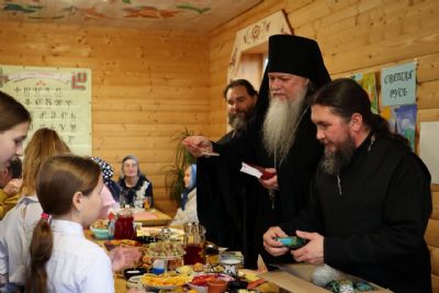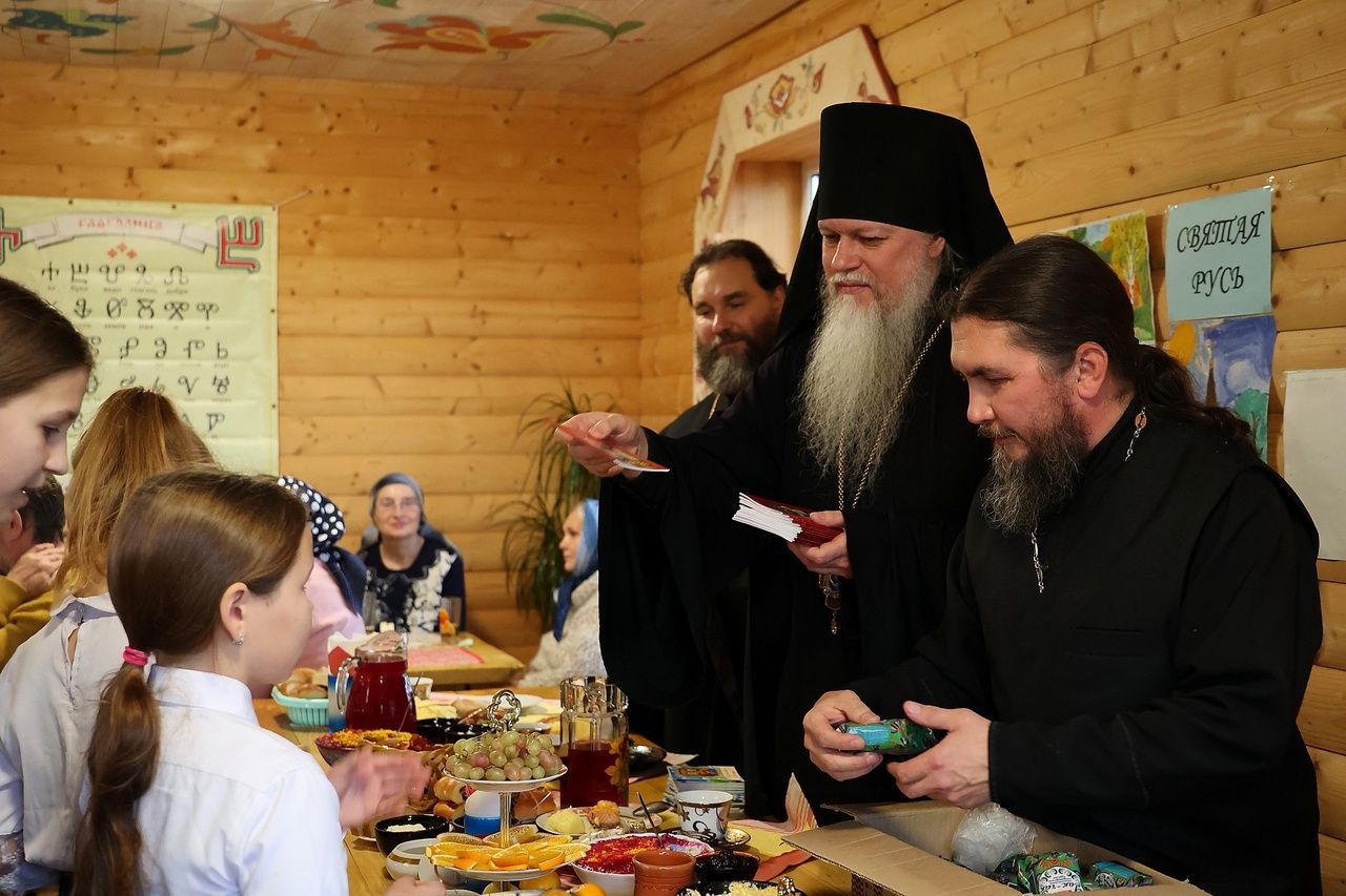 После богослужения учащиеся и педагоги елембаевской средней школы, а также сельский вокальный ансамбль представили гостям праздничный концерт. Всем артистам владыка Феофан вручил на память православные календари, посвященные Царской семье, а детям еще и сладкие подарки.