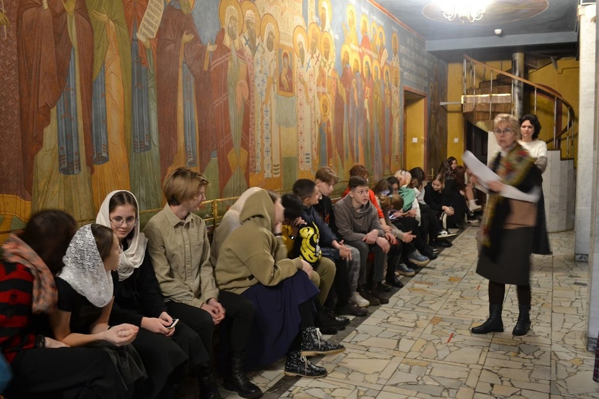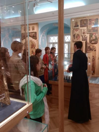 На ночевку остановились в Татьянинской гимназии Москвы, с которой у гимназии Сергия Радонежского давняя дружба. А рано утром поехали в Сретенский монастырь на раннюю Божественную литургию. По окончании богослужения для гимназистов была организована экскурсия по монастырю и по храму Новомучеников Российских, где почивают мощи священномученика Илариона (Троицкого).