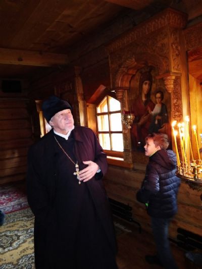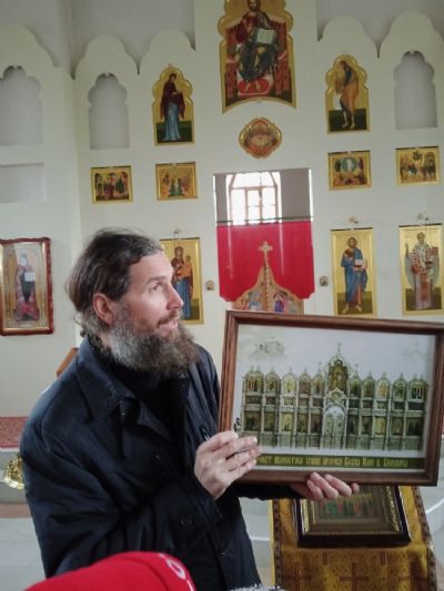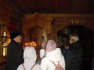 В монастыре нас встретил монах Диодор, насельник пустыни. Он пригласил нас в красивую деревянную церковь явления Божией Матери преподобному Сергию Радонежскому. Нас поразил центральный вход в храм – он сделан как в старинных русских теремах: высокая лестница, резные столбы и тесовые двери на красивом узорном каркасе (похожие постройки мы видели в Нижнем Новгороде во время летней паломнической поездки). Отец Диодор рассказал нам о внутреннем убранстве храма. Храм отличается искусной резьбой по дереву и красивыми изделиями кузнечной работы. Но самое главное, здесь хранятся чудотворные образы и мощи святых.