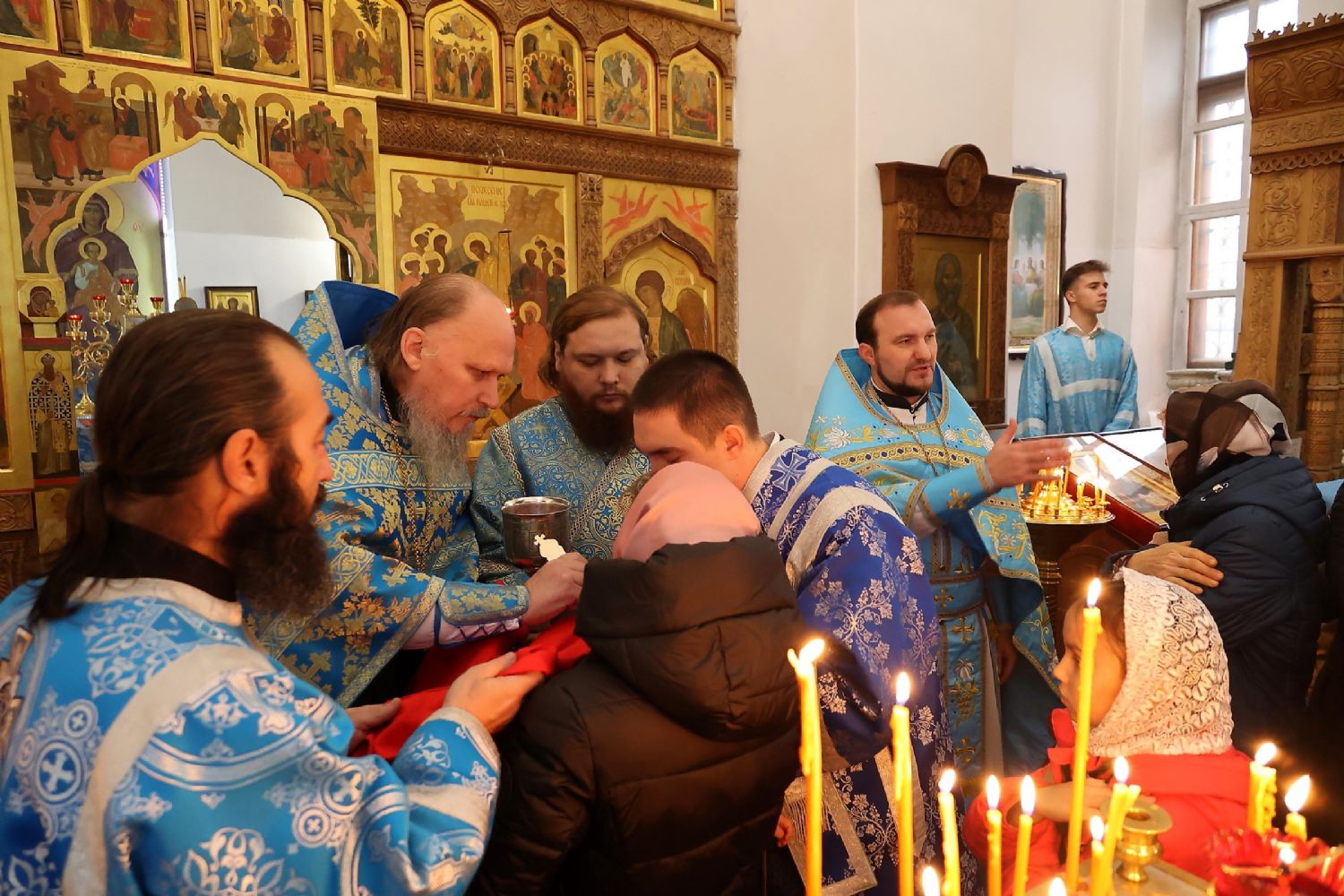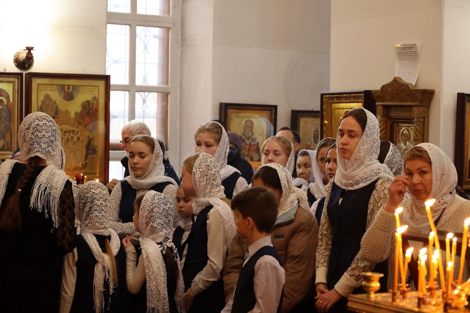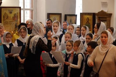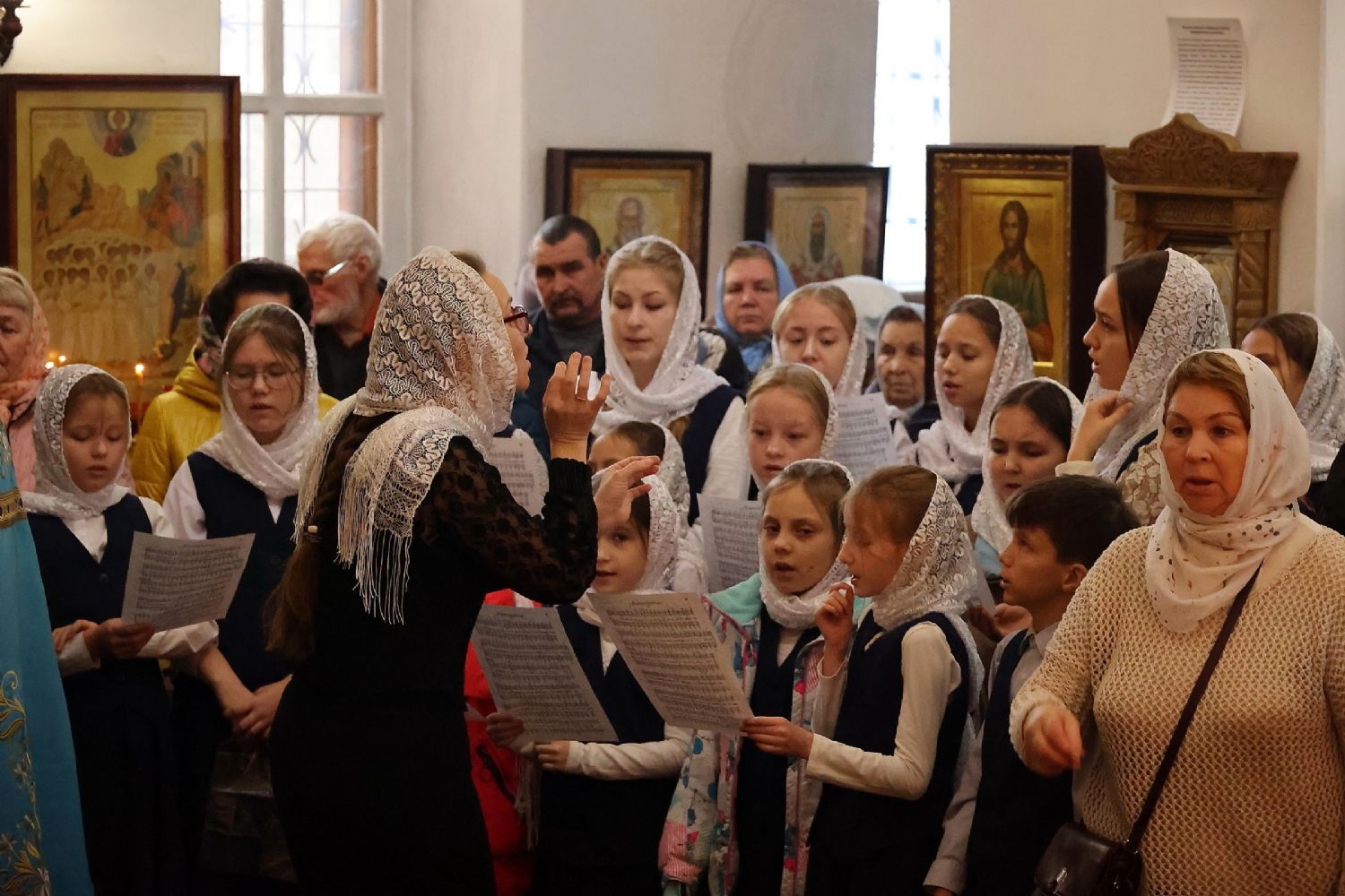 За Литургией архипастырю сослужили благочинный Волжского городского церковного округа, настоятель храма протоиерей Александр Михайлов, настоятель Покровского храма с. Илеть Параньгинского района иерей Виталий Ульянов, клирики Никольского кафедрального собора г. Волжска иерей Димитрий Карпетченко и диакон Иоанн Захаров. Песнопения исполняли два хора: квартет под управлением Ирины Канашиной и детско-юношеский хор (регент Мария Захарова).