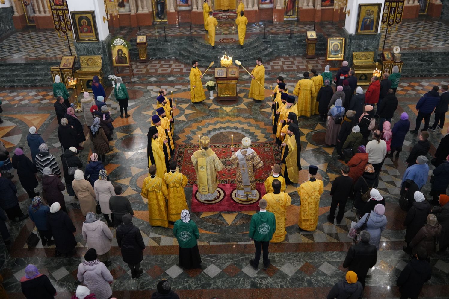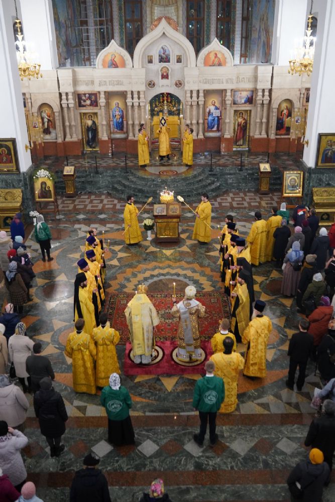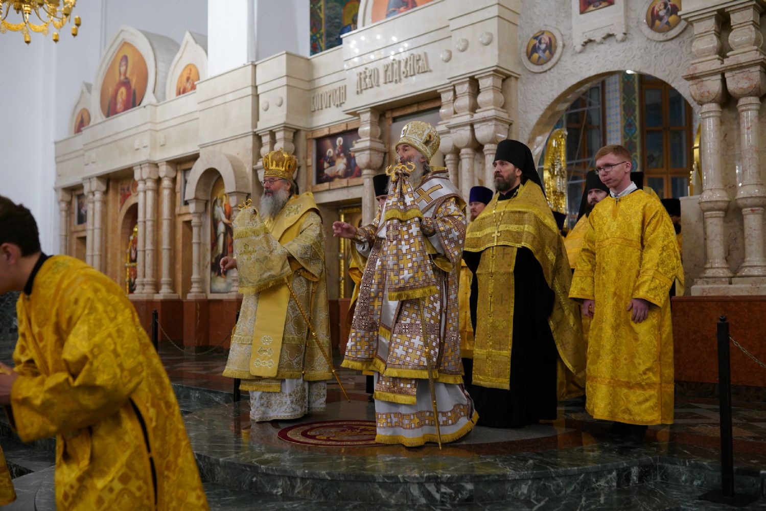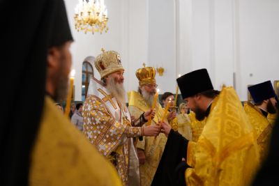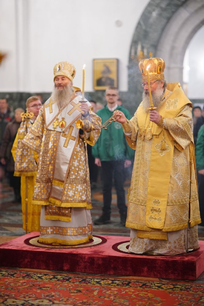 Архипастырям сослужили секретарь Йошкар-Олинского епархиального управления иеромонах Серафим (Пасанаев), секретарь Татарстанской митрополии иеромонах Кирилл (Корытко), секретарь главы Татарстанской митрополии иеромонах Алексий (Яцейко) и клирики Йошкар-Олинской епархии.