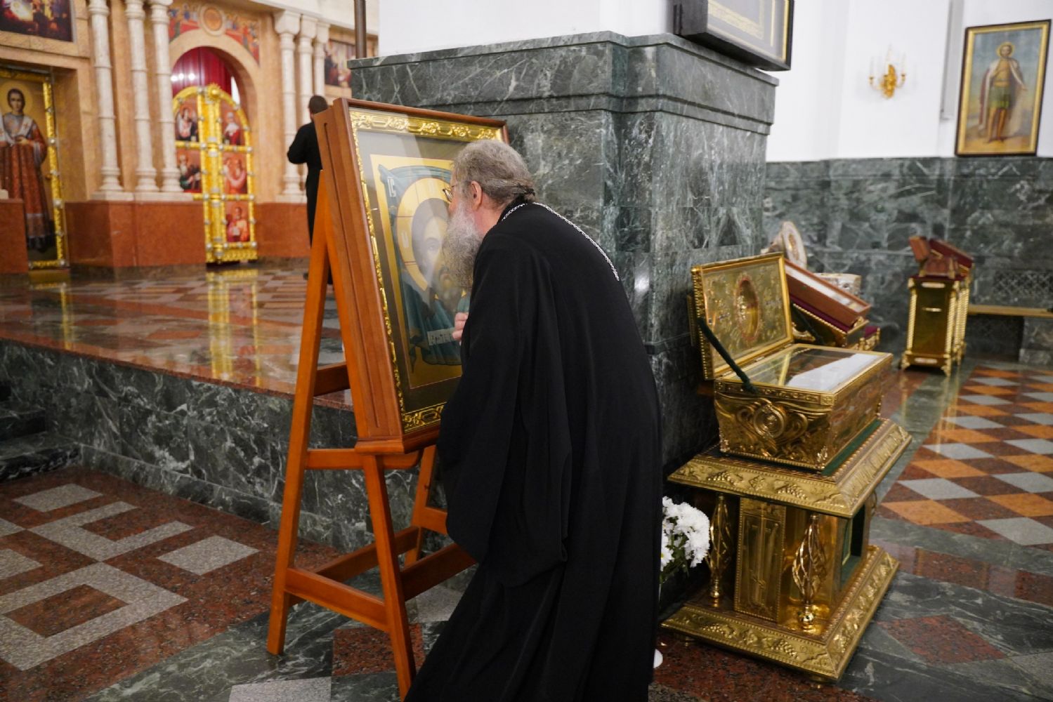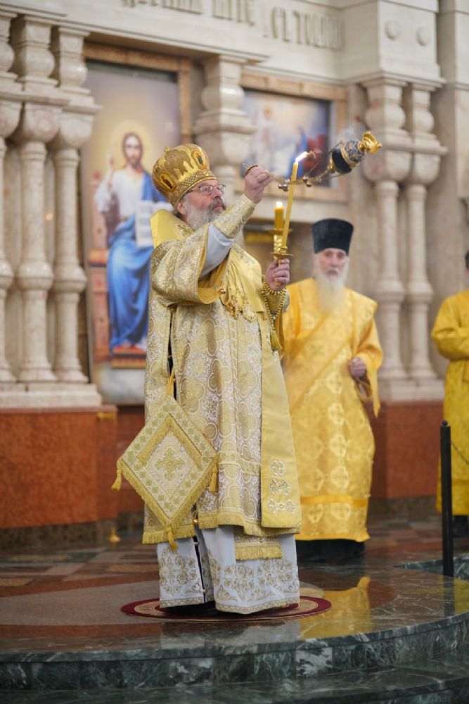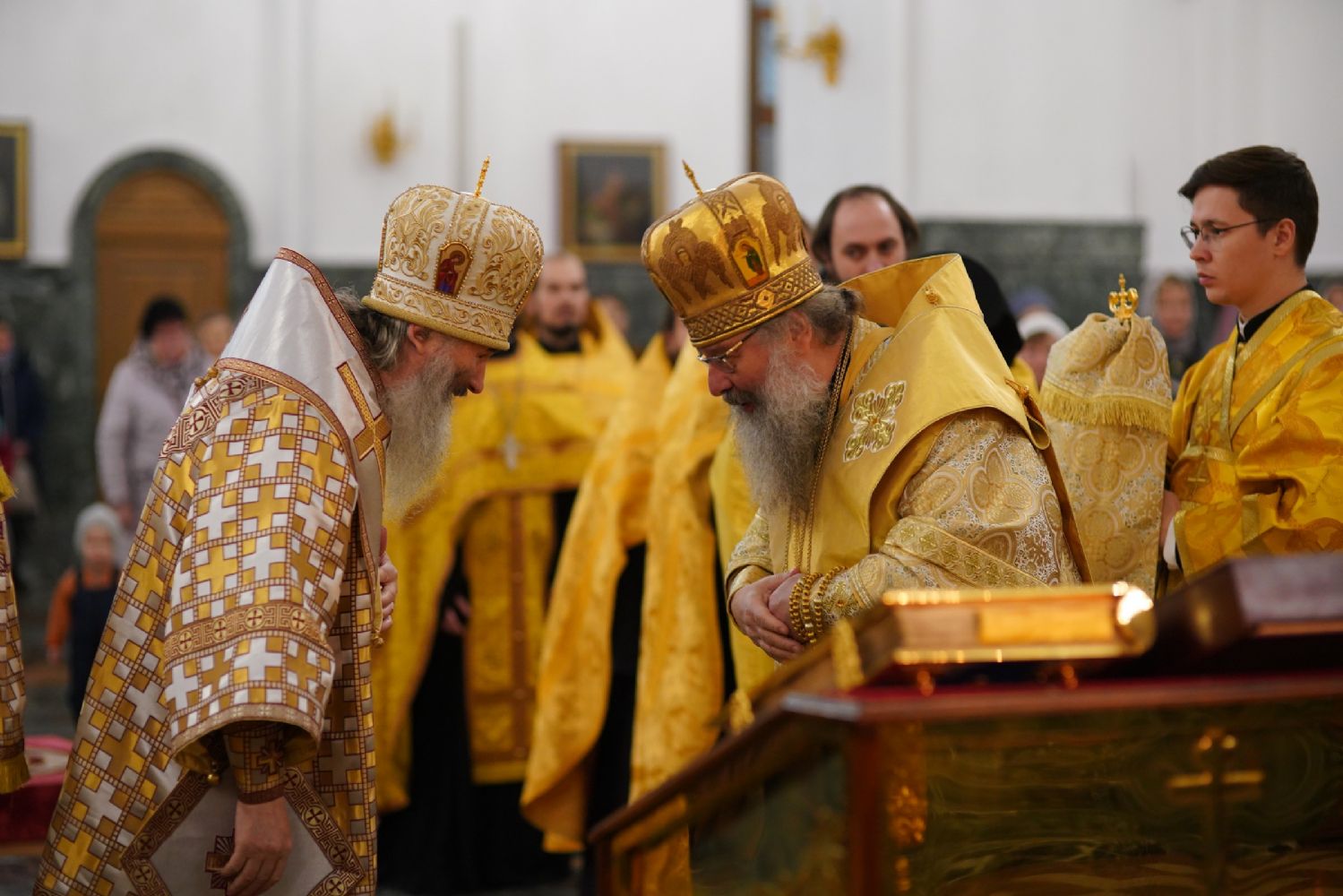 Архипастырям сослужили секретарь Йошкар-Олинского епархиального управления иеромонах Серафим (Пасанаев), секретарь Татарстанской митрополии иеромонах Кирилл (Корытко), секретарь главы Татарстанской митрополии иеромонах Алексий (Яцейко) и клирики Йошкар-Олинской епархии.