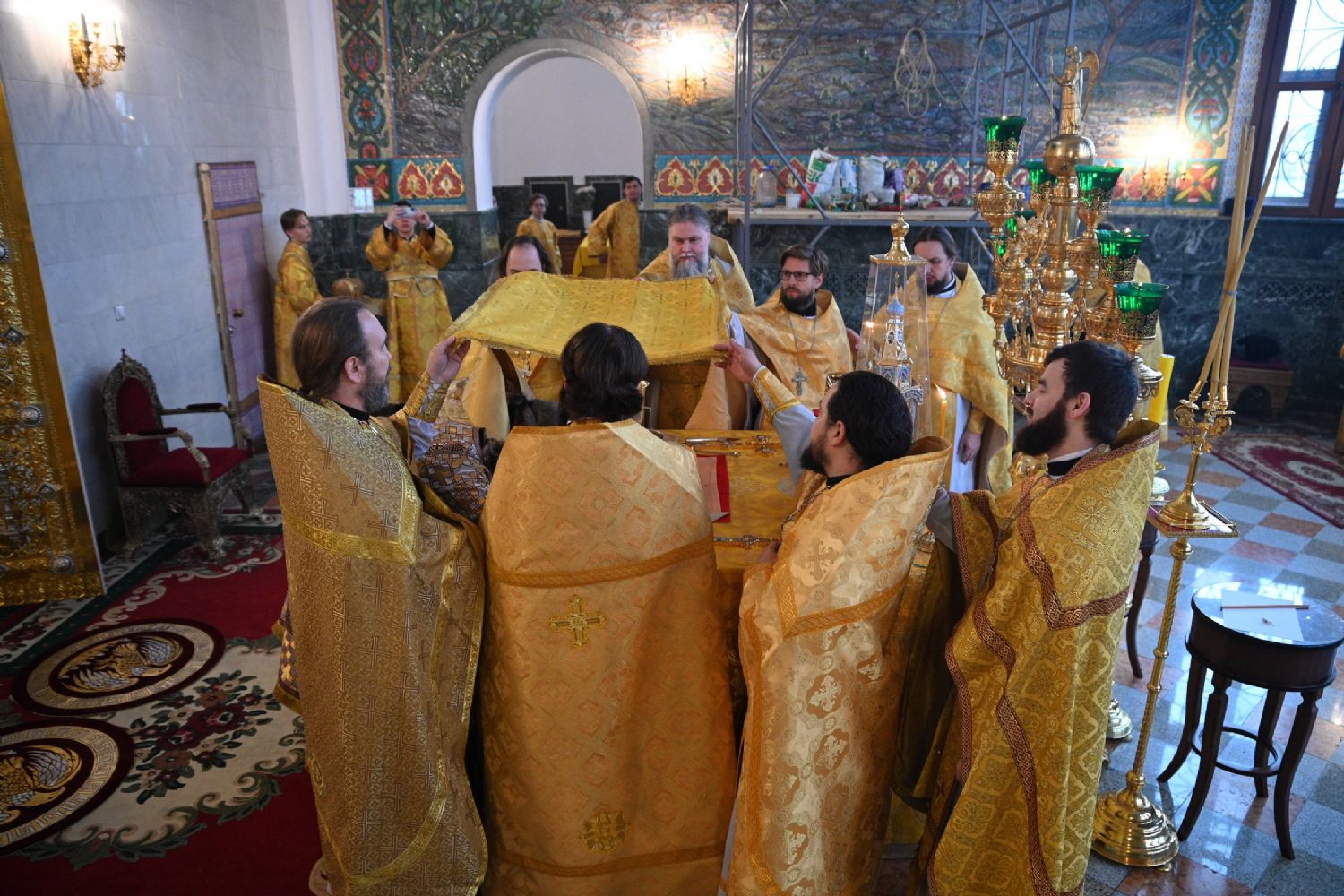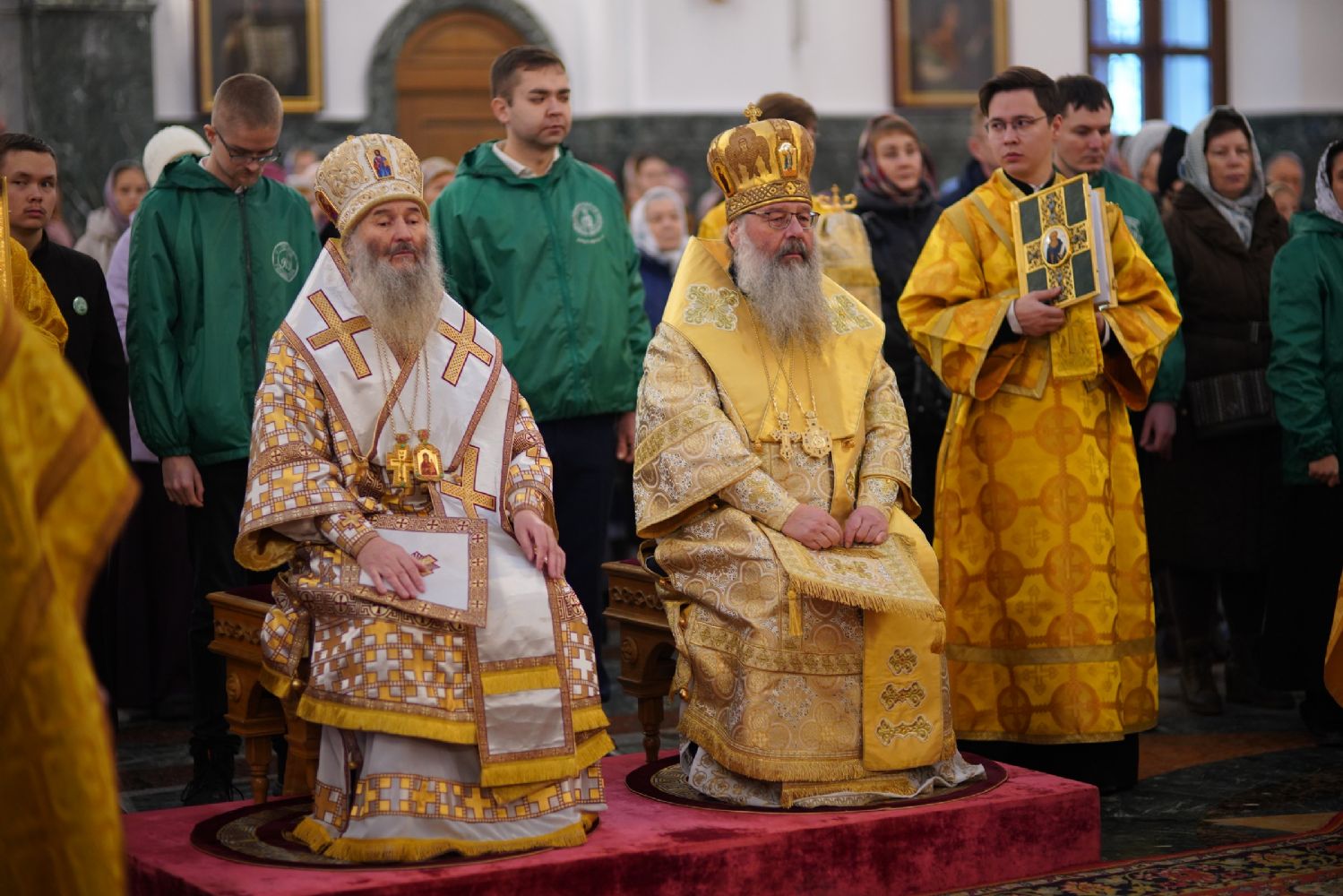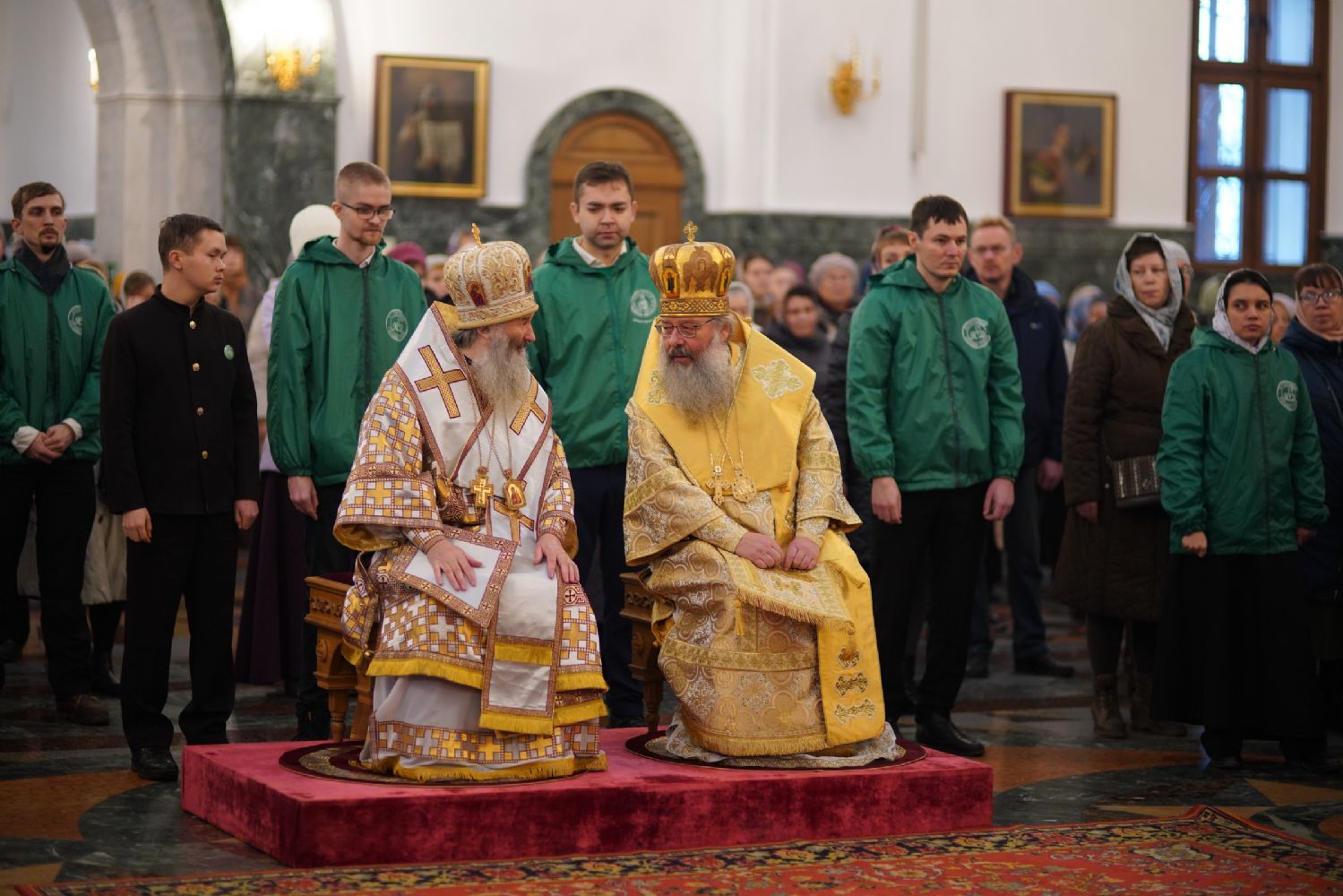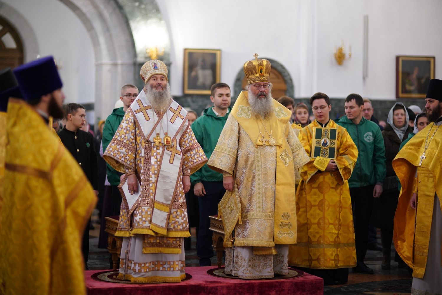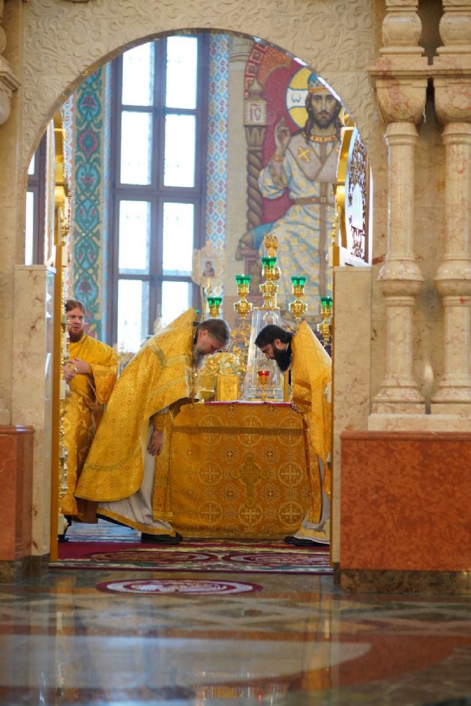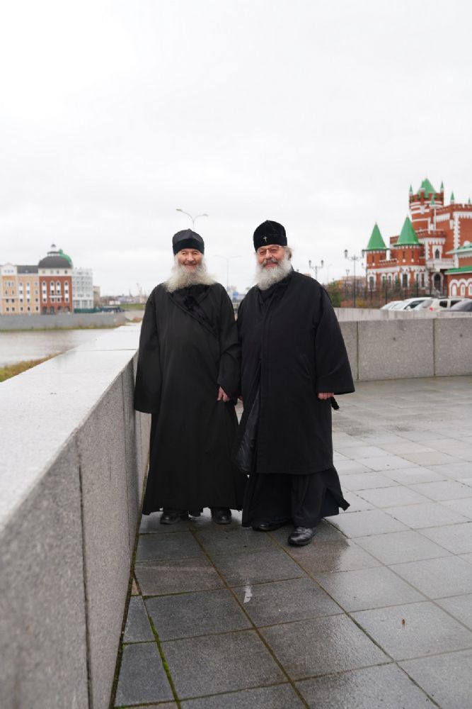 Архипастырям сослужили секретарь Йошкар-Олинского епархиального управления иеромонах Серафим (Пасанаев), секретарь Татарстанской митрополии иеромонах Кирилл (Корытко), секретарь главы Татарстанской митрополии иеромонах Алексий (Яцейко) и клирики Йошкар-Олинской епархии.