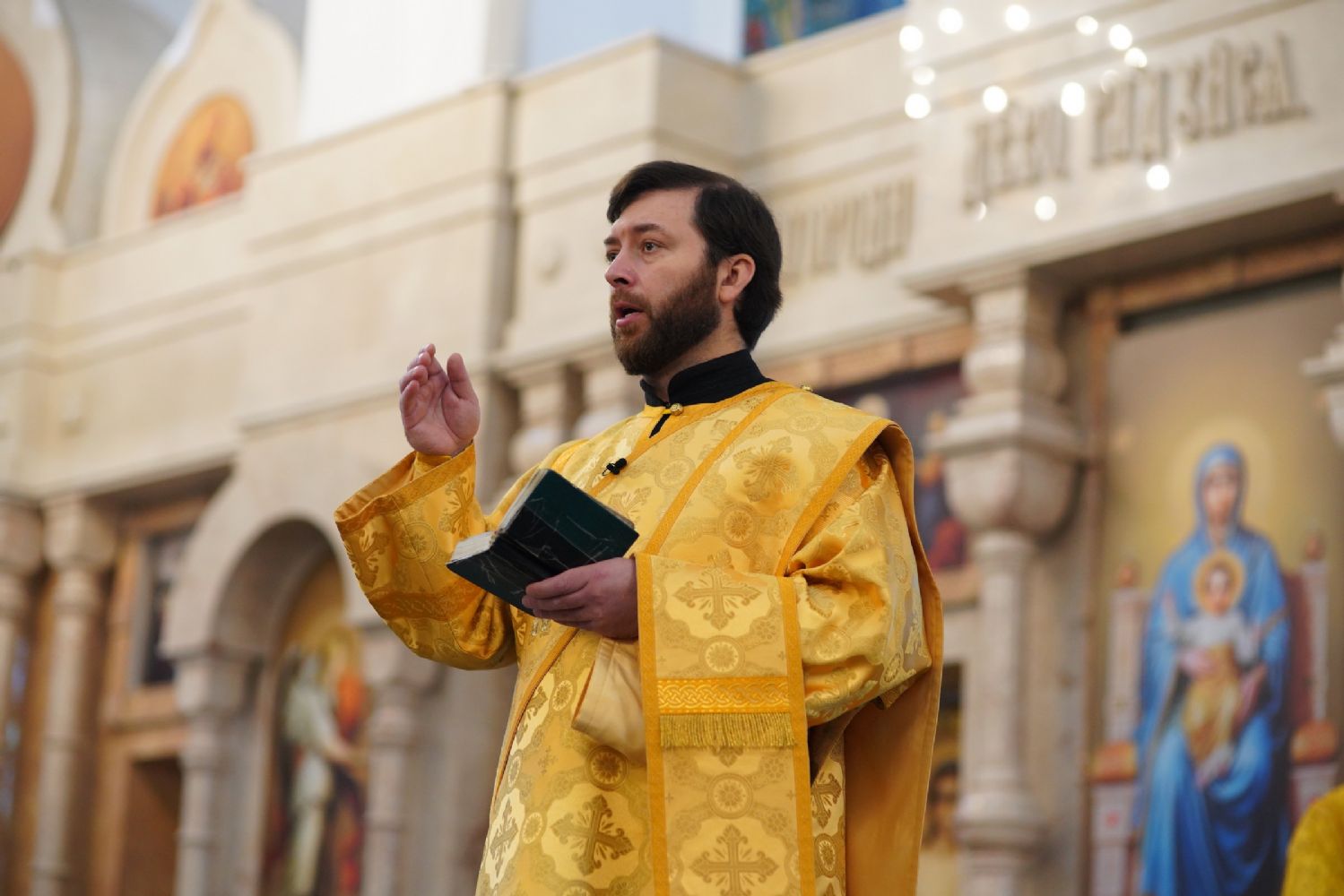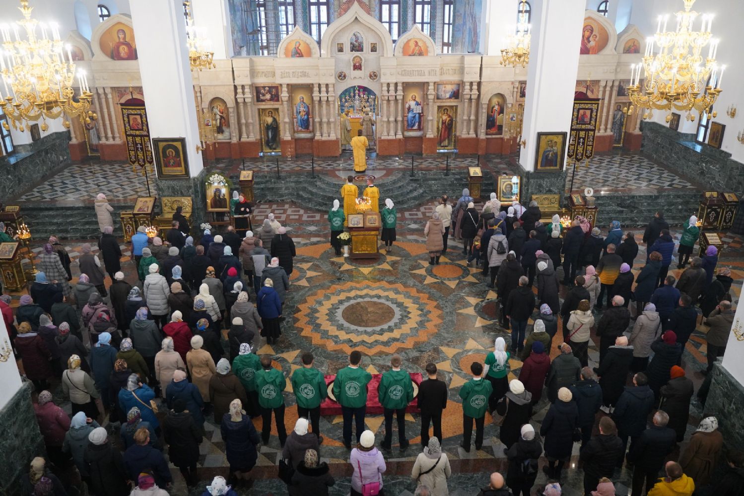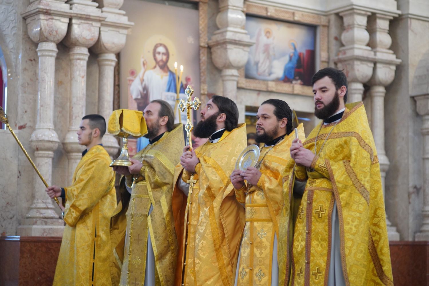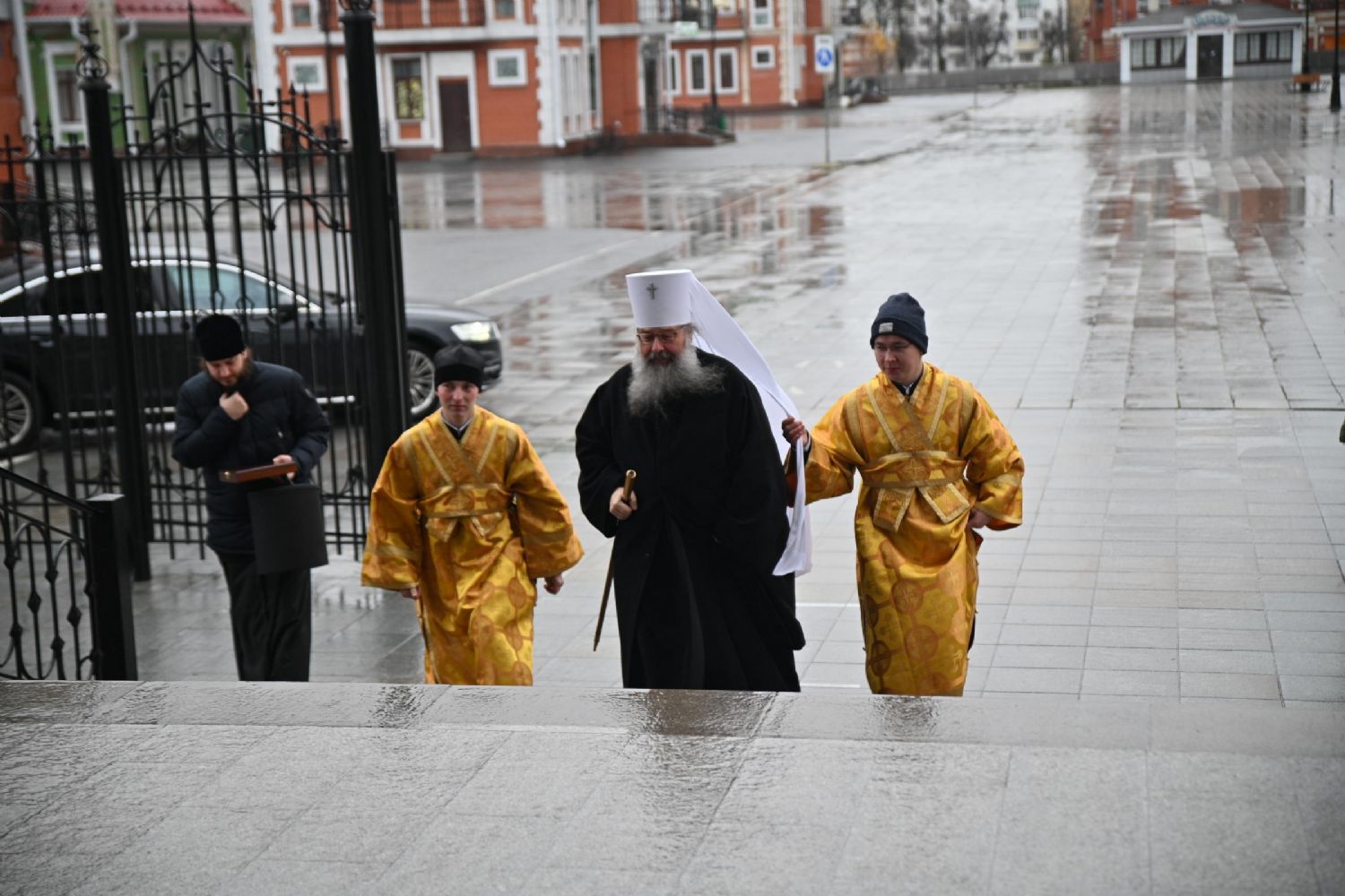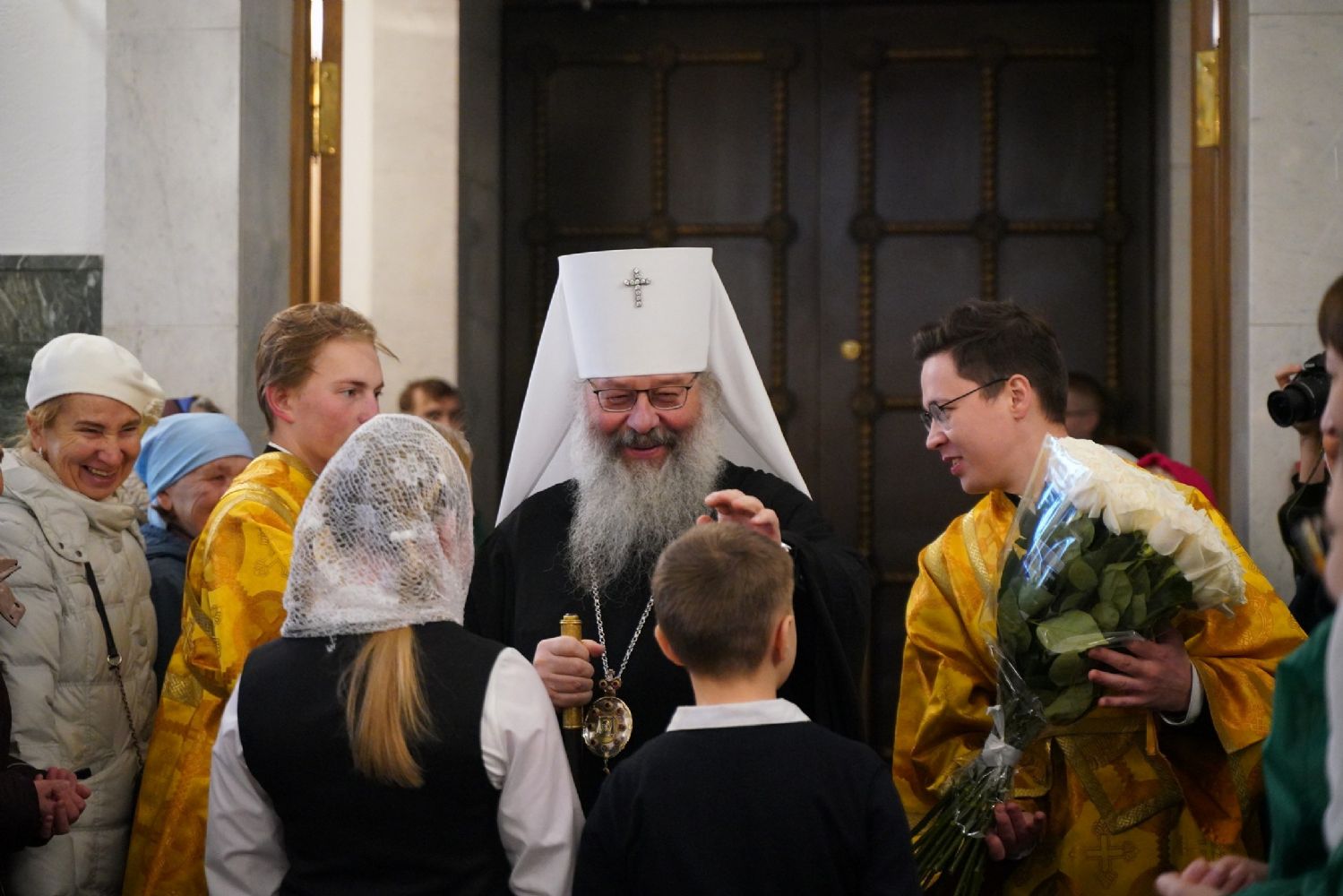 Богослужение началось со встречи митрополита Казанского и Татарстанского Кирилла и облачения в центре храма.
