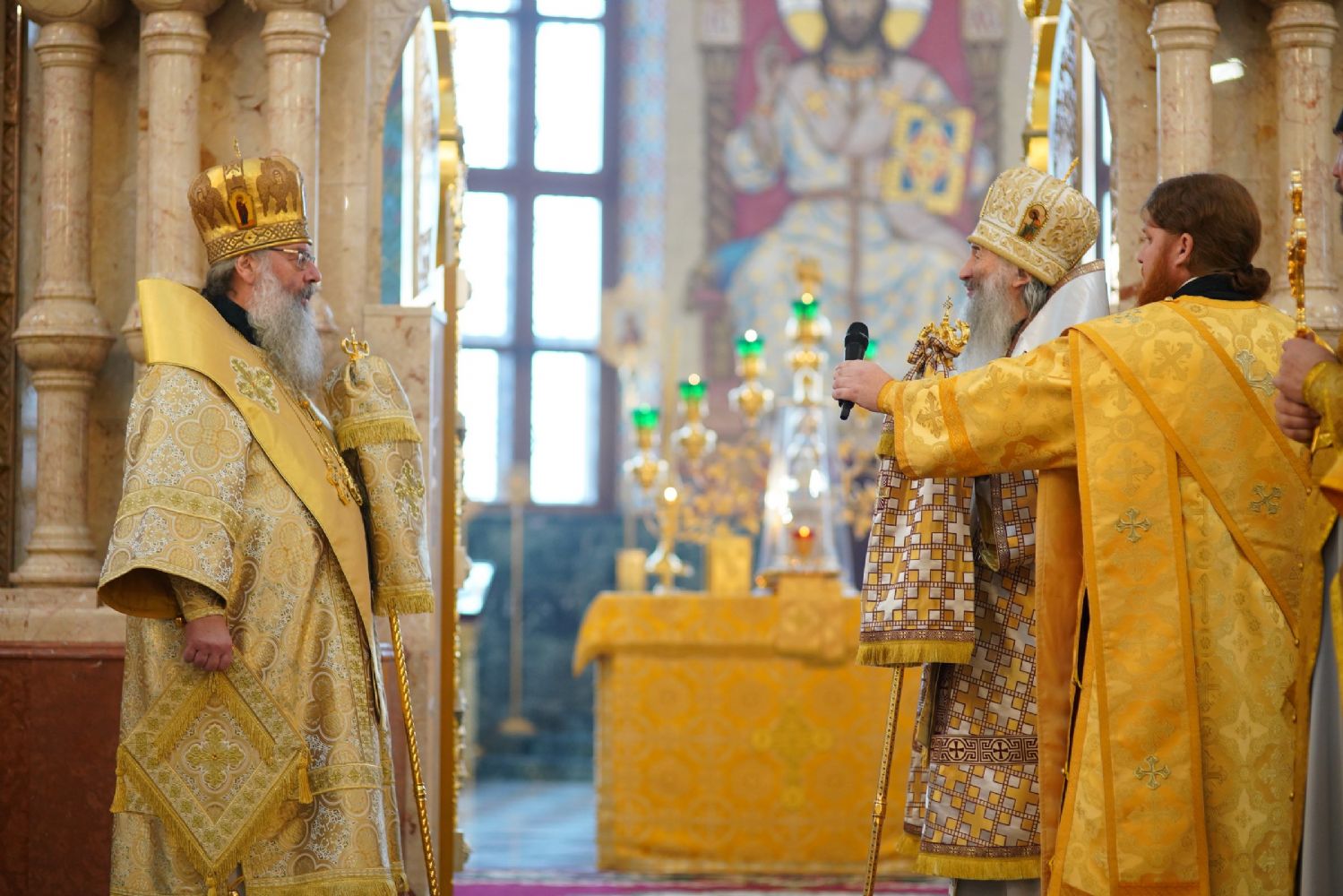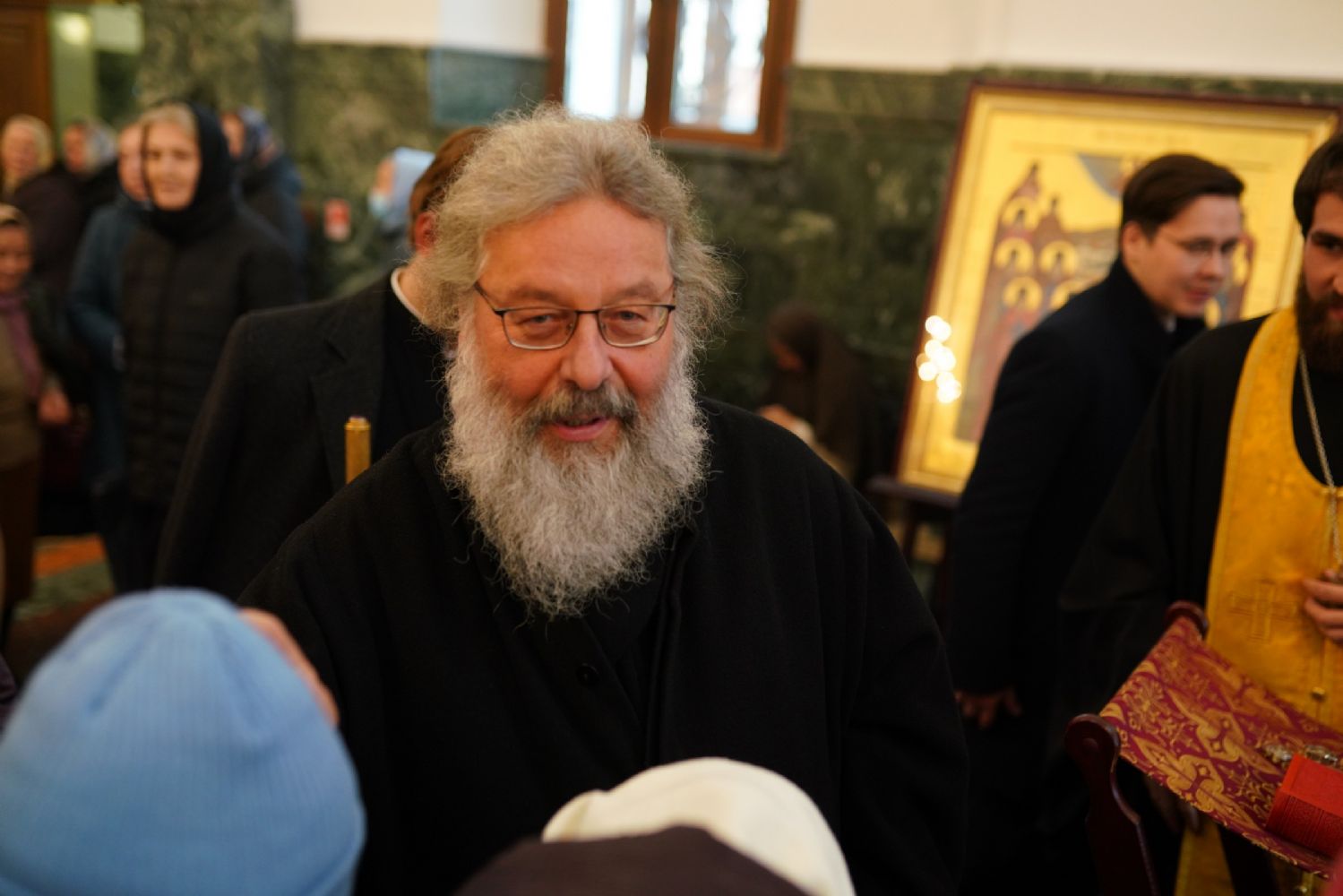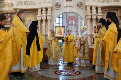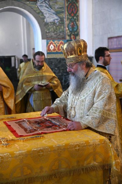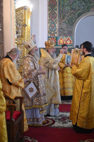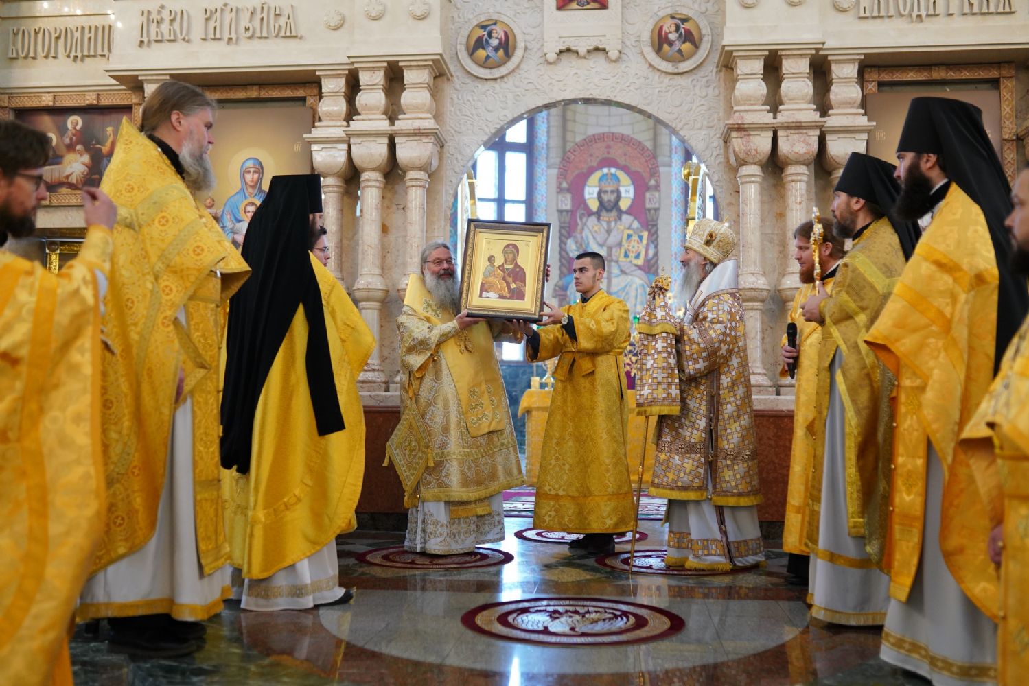 После Литургии владыка Иоанн поблагодарил митрополита Кирилла за совместную молитву и преподнес ему образ Пресвятой Богородицы «Троеручица».