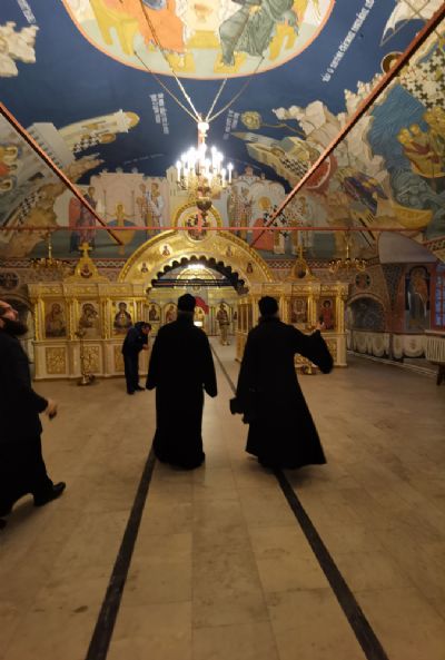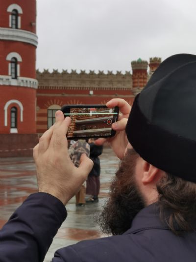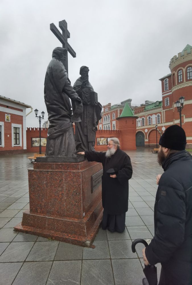 Большое впечатление на митрополита Кирилла произвела динамическая скульптурная композиция «Вход Господень в Иерусалим», известная в народе как «12 апостолов». Затем гости перешли по пешеходному мосту к памятнику царю Феодору Иоанновичу, по указу которого в 1584 году был основан город Царевококшайск. По набережной направились к памятнику равноапостольным Кириллу и Мефодию около Музея истории Православия. В музее осмотрели основную экспозицию, фотовыставку к 5-летию Марийской митрополии и выставку «Радость всех скорбящих», представленную музеем «Остров-град Свияжск».
