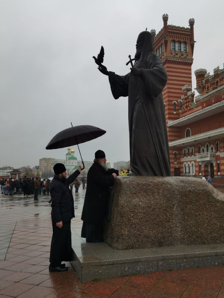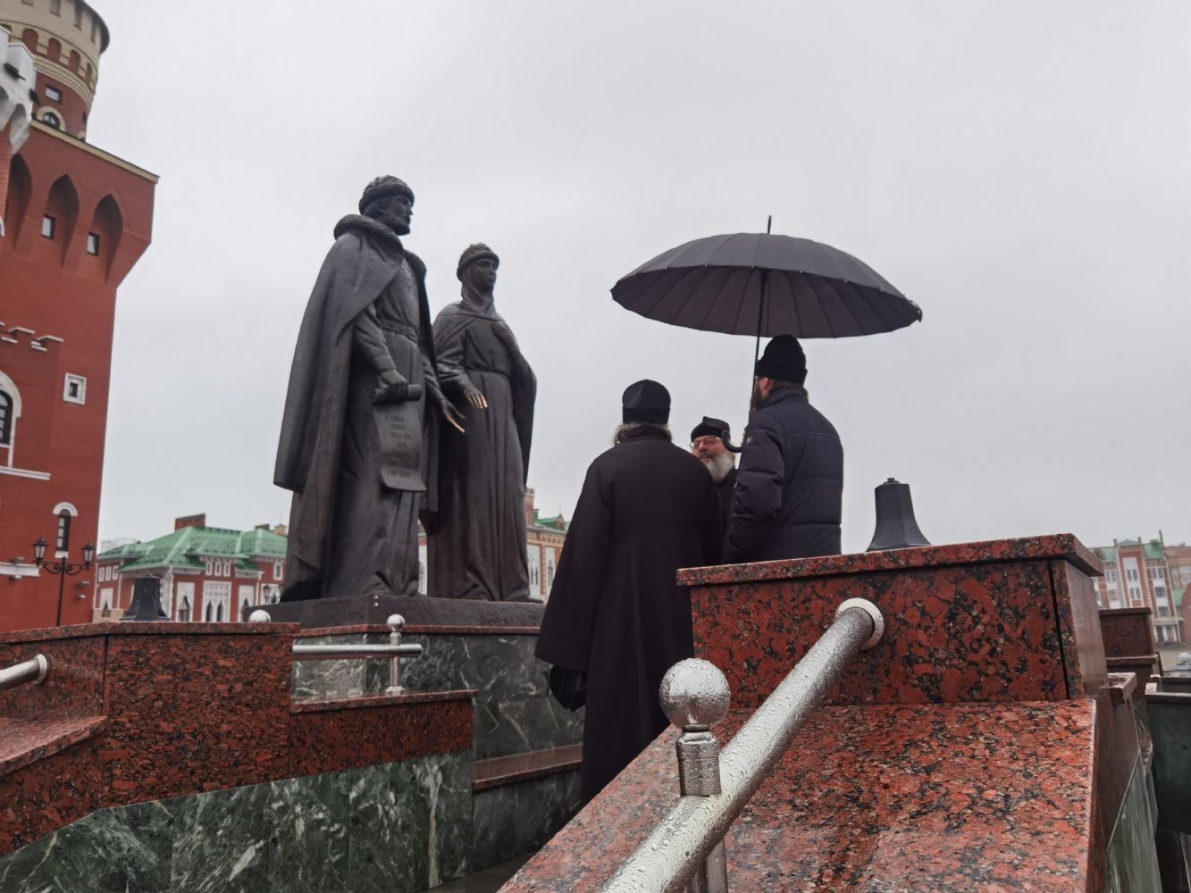 Далее два архипастыря, сопровождали которых секретарь Татарстанской митрополии иеромонах Кирилл (Корытко), секретарь главы Татарстанской митрополии иеромонах Алексий (Яцейко), ответственный за взаимоотношения Церкви и общества Йошкар-Олинской епархии иерей Димитрий Дьяков и пресс-секретарь Йошкар-Олинской епархии Сергей Скорик, прошли на Патриаршую площадь, где осмотрели памятник святым благоверным князю Петру и княгине Февронии Муромских и часовню, освященную в их честь. У памятника Святейшему Патриарху Московскому и Всея Руси Алексию II пропели «вечную память», владыка Кирилл возложил к его подножию цветы.