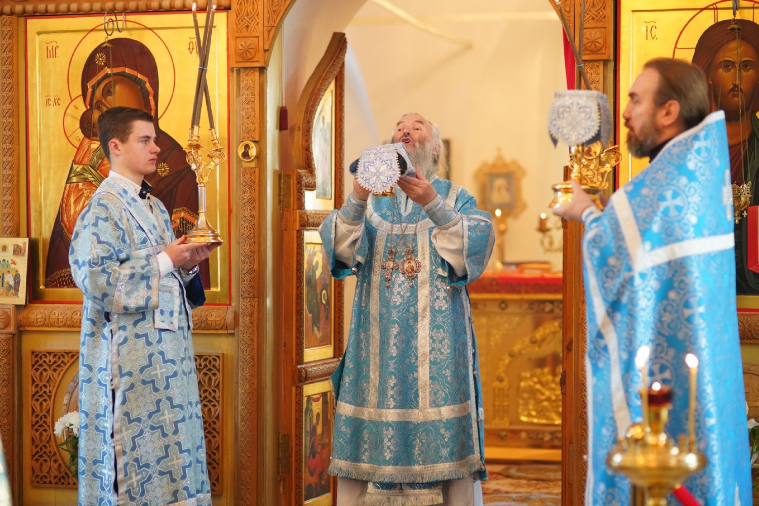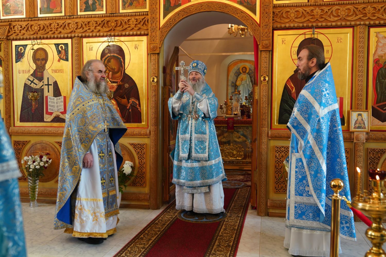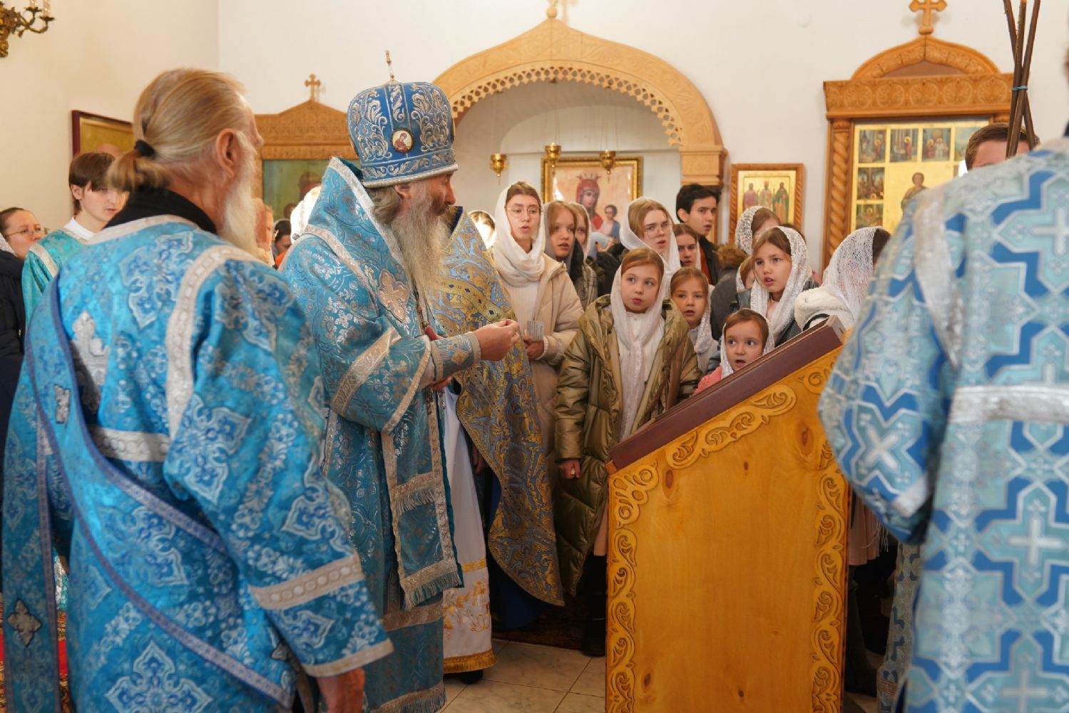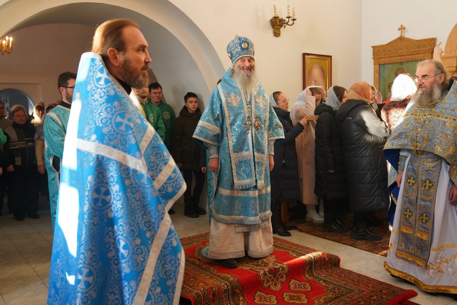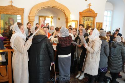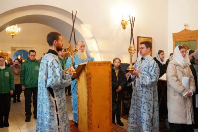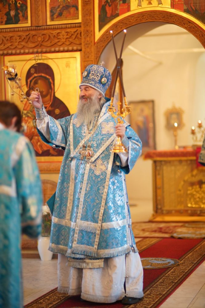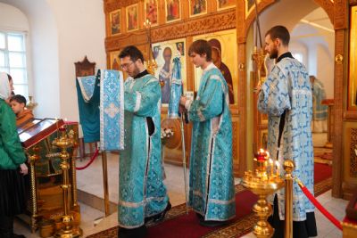 После Литургии владыка с сослужащим священством совершили славление: пропели тропарь, кондак и величание праздника Введения во храм Пресвятой Богородицы.