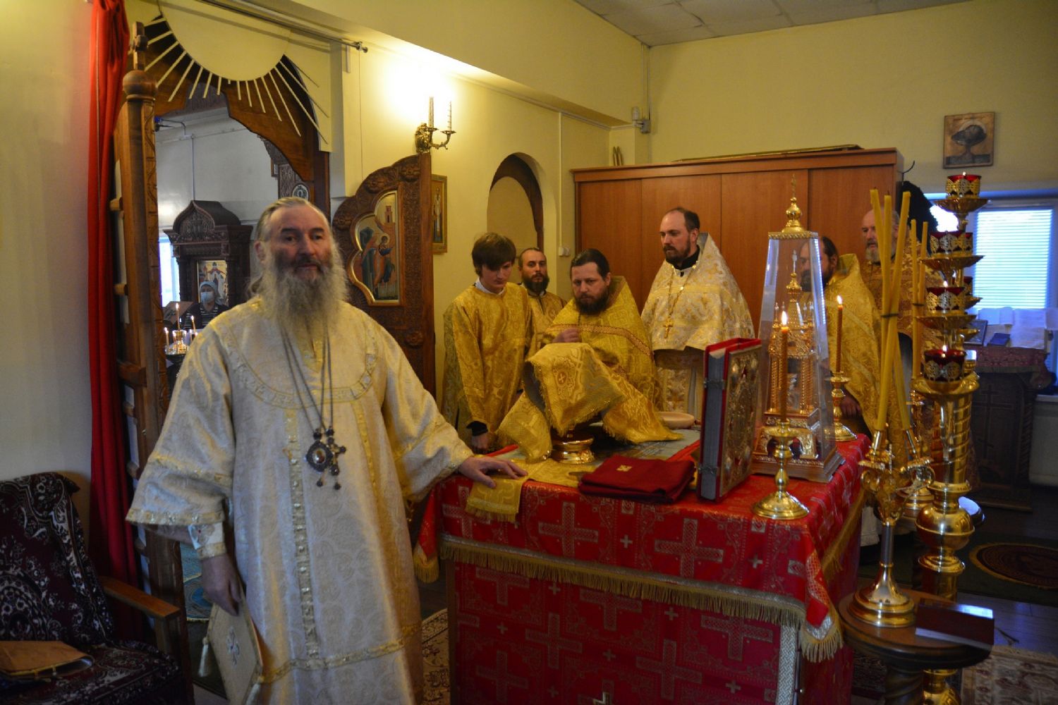 Владыке сослужили благочинный Лугово-Марийского церковного округа, настоятель Никольского храма с. Кожласола протоиерей Алексий Никитин, настоятель храма иерей Антоний Блинов, клирик храма иерей Александр Сергунин, настоятель Свято-Троицкого храма с. Красный Яр иерей Михаил Репин и протодиакон Михаил Козловский.