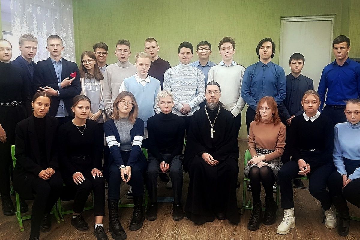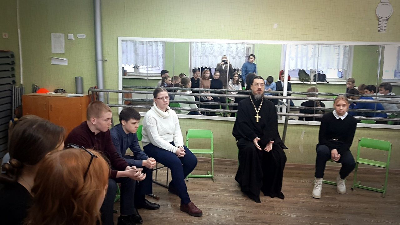 13 декабря в Медведевской средней общеобразовательной школе №2 состоялась встреча учащихся старших классов с настоятелем храма Державной иконы Божией Матери п. Медведево протоиереем Алексием Михайловым.
