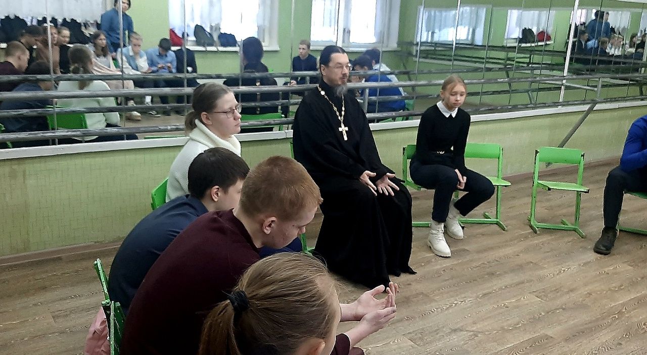 Беседа на духовно-нравственную тематику проходила в форме диалога: ребятам предлагались проблемные вопросы и варианты «за» и «против». В зависимости от избранной точки зрения, старшеклассники выбирали, какую занять сторону, и аргументировали свой выбор. Обсуждались вопросы свободы, веры, отношений между мужчиной и женщиной. Батюшка высказывал мнение Православной Церкви, основанной на традиционных нравственных ценностях.