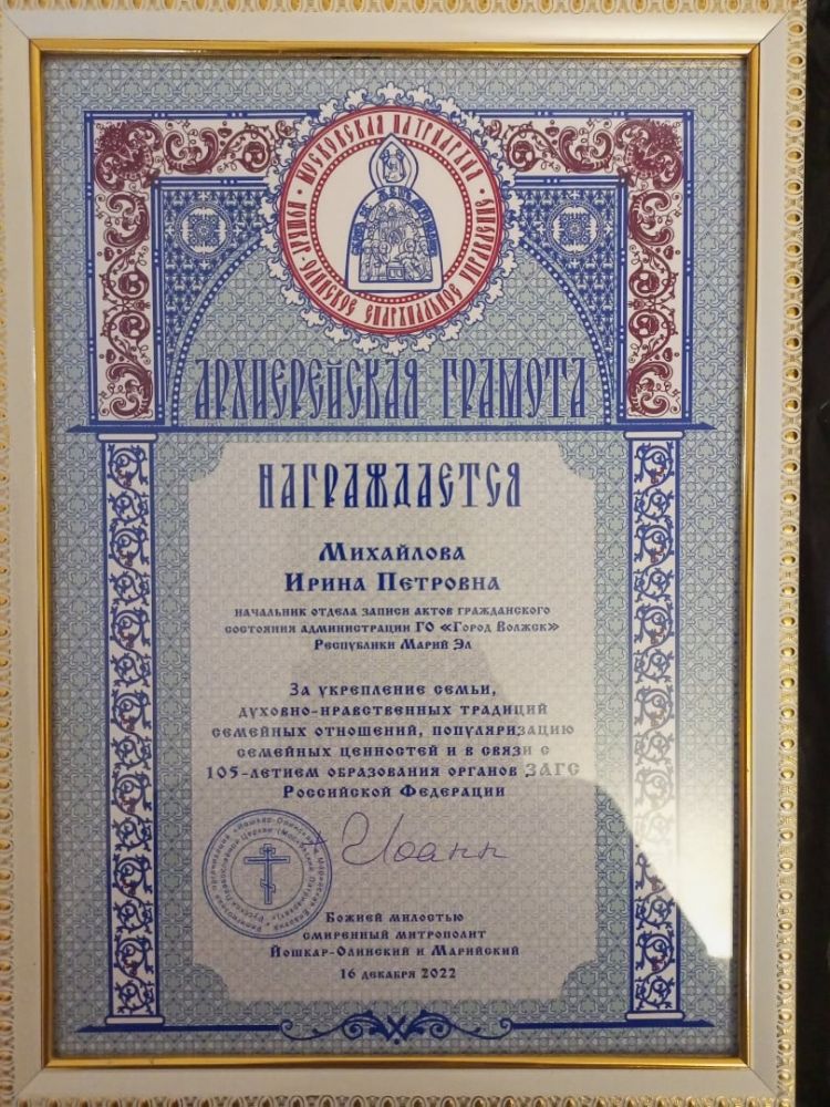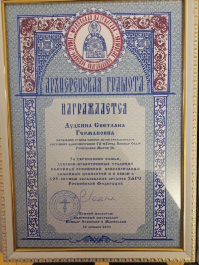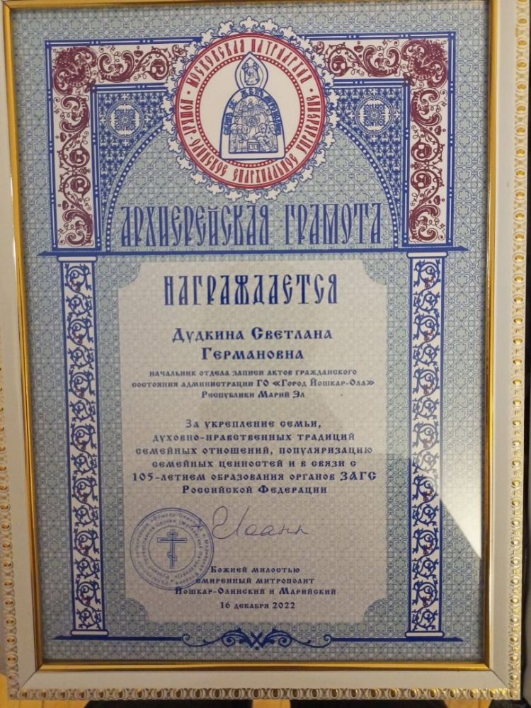 Митрополит Иоанн пожелал сотрудникам органов ЗАГС республики Божией помощи в несении их служения людям и благословил их иконой Спасителя. Владыка вручил архиерейские грамоты начальнику отдела записи актов гражданского состояния г. Йошкар-Олы Светлане Дудкиной и начальнику отдела ЗАГС г. Волжска Ирине Михайловой.