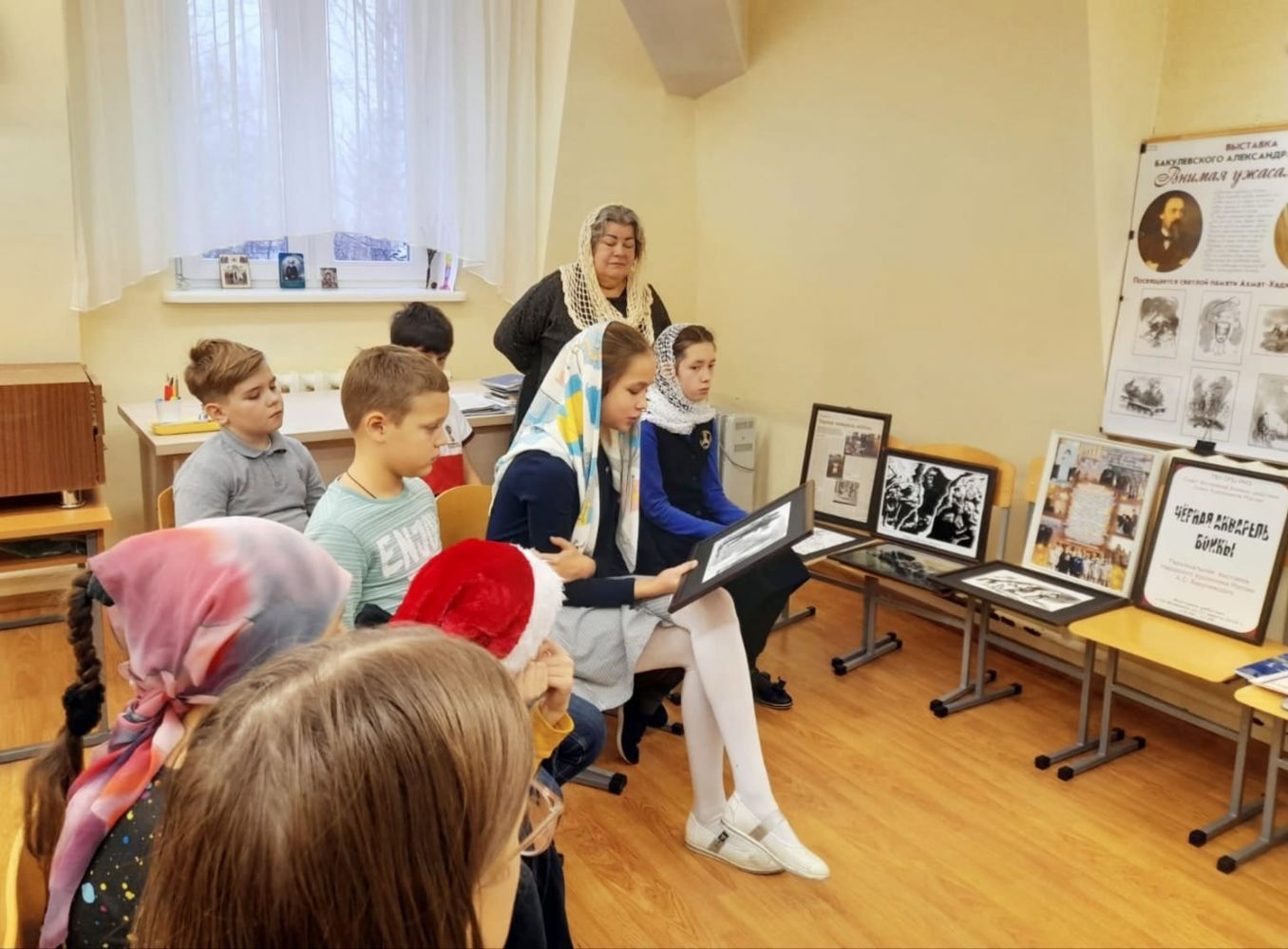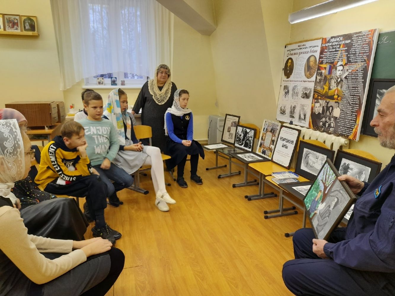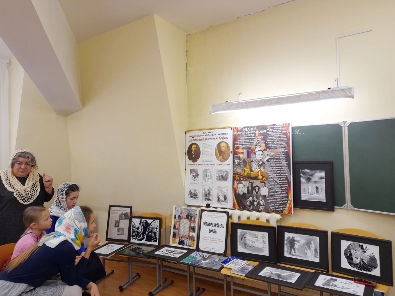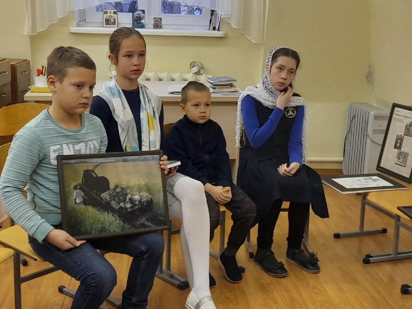 И вот, двое из команды организаторов этого проекта – прихожанка Серафимовского храма Ольга Алексеева и ветеран Вооруженных Сил РФ Иса Амалиев в минувшее воскресенье побеседовали с воспитанниками воскресной школы. Ребята узнали об истории выставки, с огромным интересом слушали о герое России 19-летнем Валерии Иванове – уроженце Волжского района, героически погибшем в 1995 году. Живой отклик нашли у аудитории представленные на выставке картины нашего земляка – народного художника России Александра Сергеевича Бакулевского. Гости поговорили с детьми и о патриотизме, о любви к Отечеству.