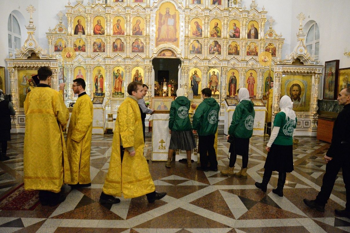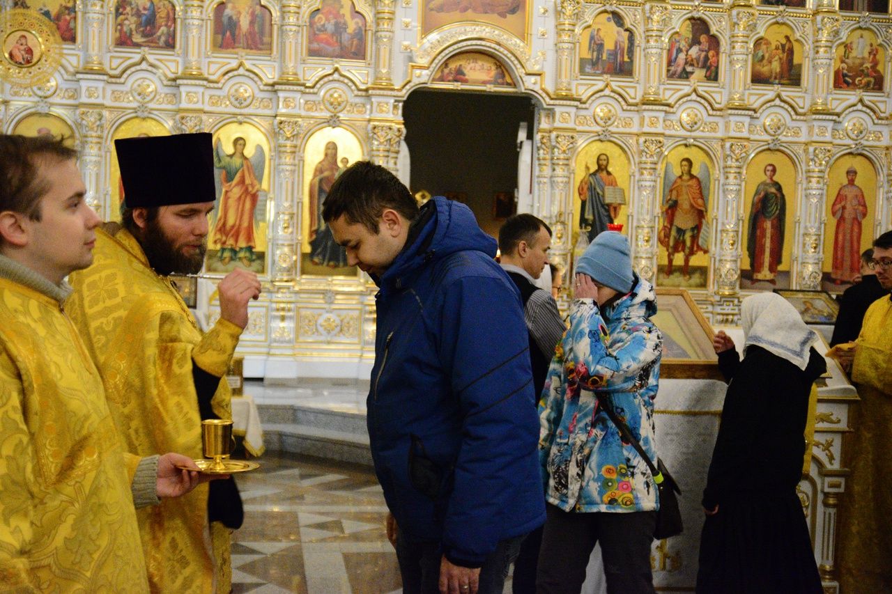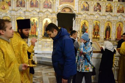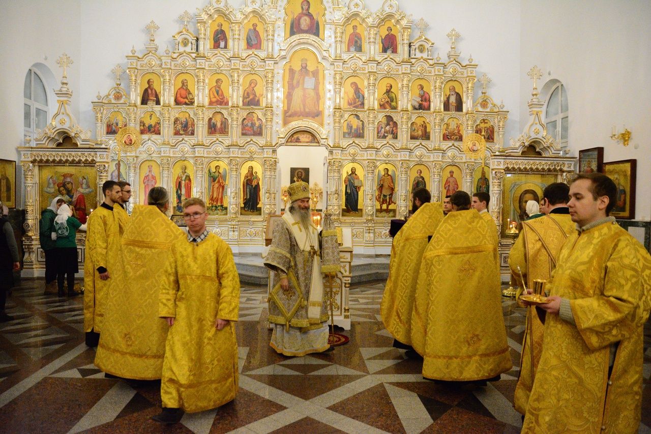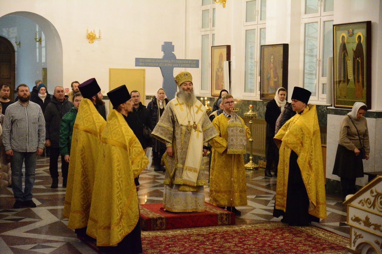 Владыке сослужили настоятель собора иерей Алексий Кирюшкин, клирики собора иерей Леонид Вылекжанин, иерей Андрей Кочаков и диакон Алексий Кузнецов. Песнопения исполнял хор собора под управлением регента Алисы Вылегжаниной.